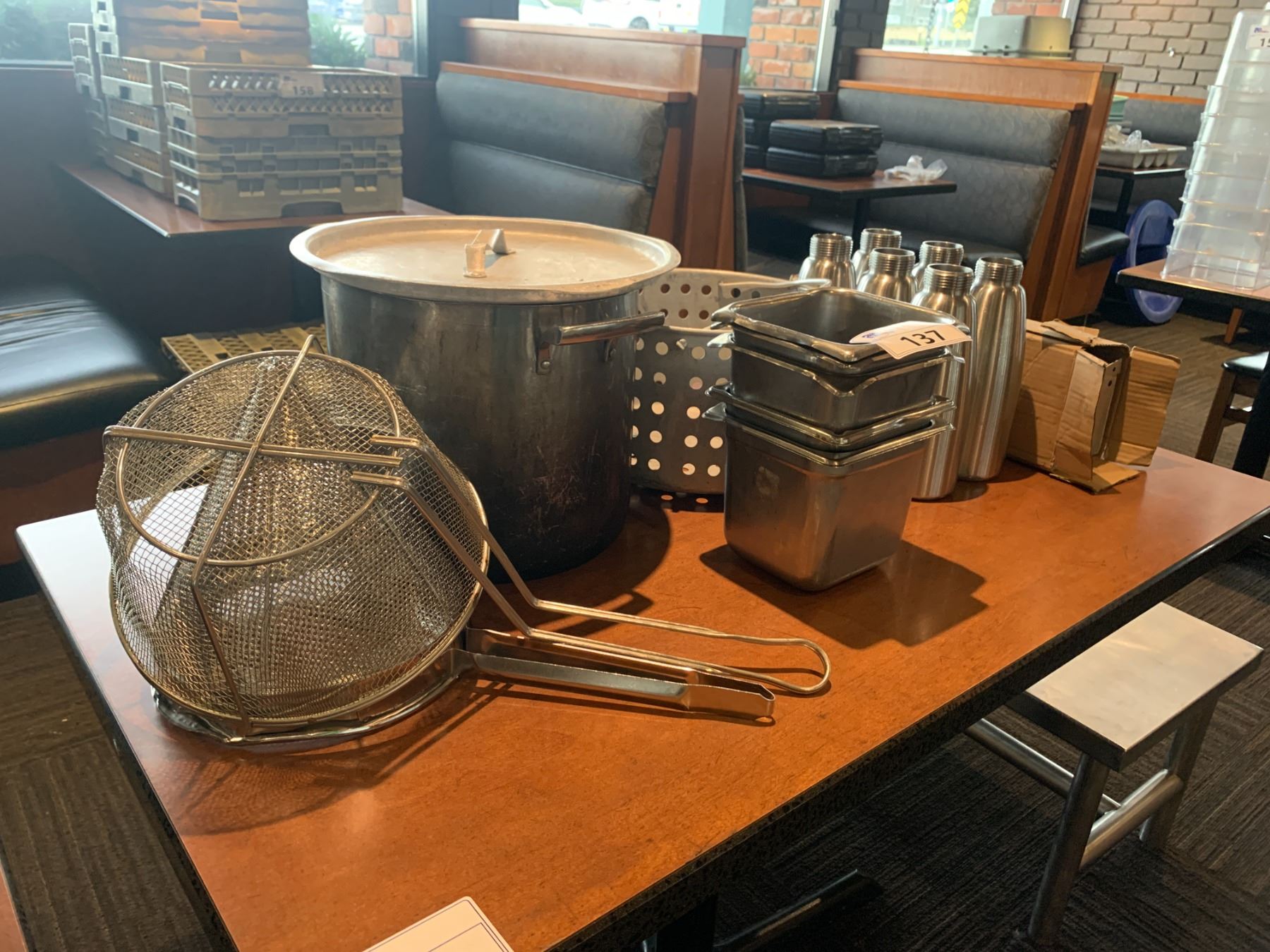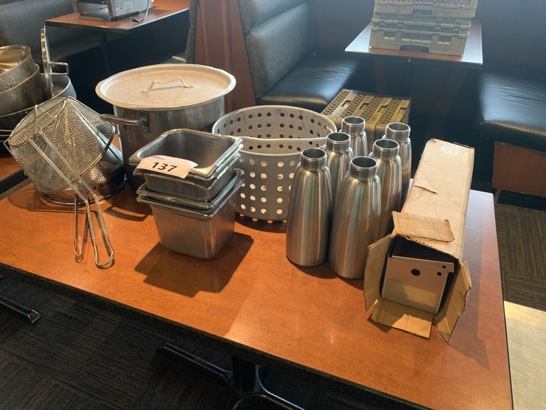 ASSORTED COMMERCIAL STAINLESS STEEL INSERTS, POTS, COLANDERS, WHIPPING CREAM CANISTERS & A GREASE TRAPPER KIT