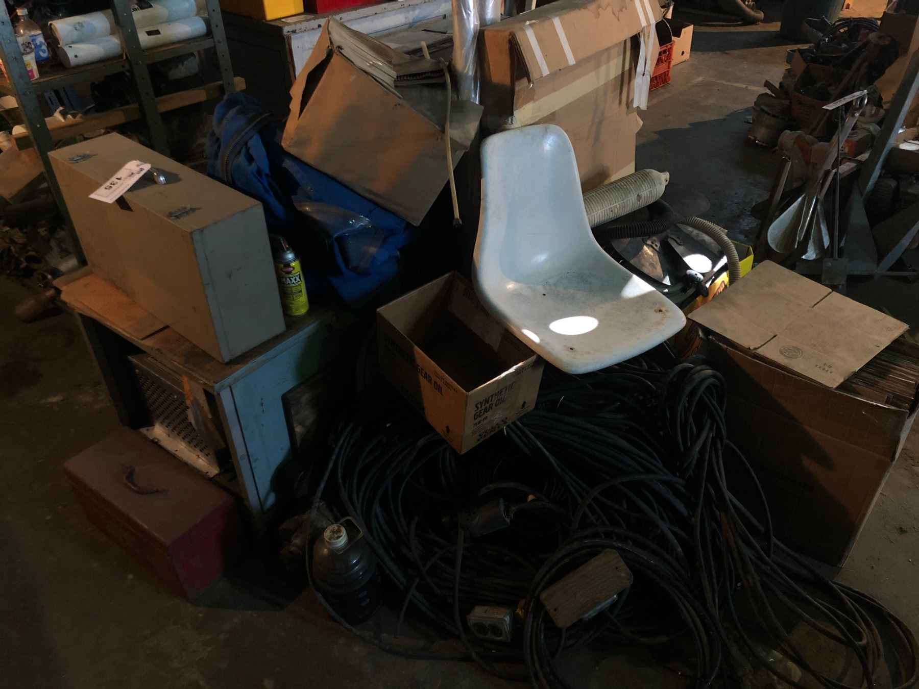 ASSORTED CONTENTS OF AREA INCLUDING CABLING, MARINE PARTS, TOOLS AND MORE