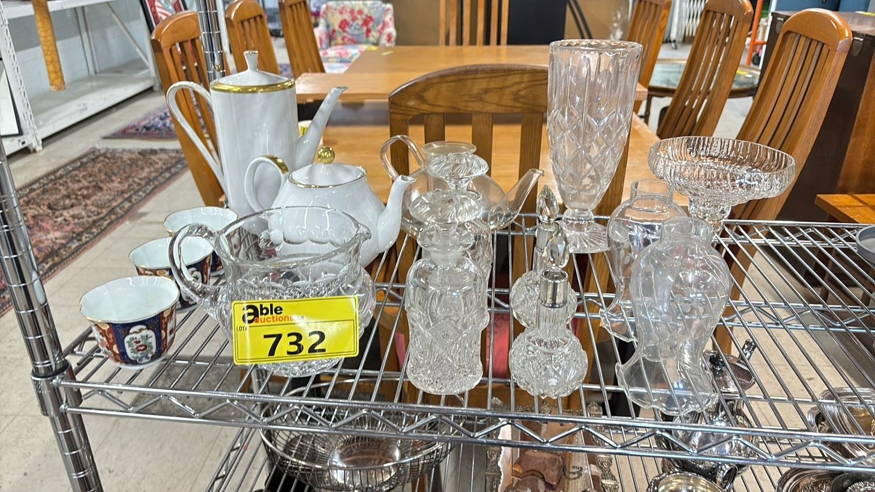 ASSORTED CRYSTALWARE & TEA POTS/CUPS