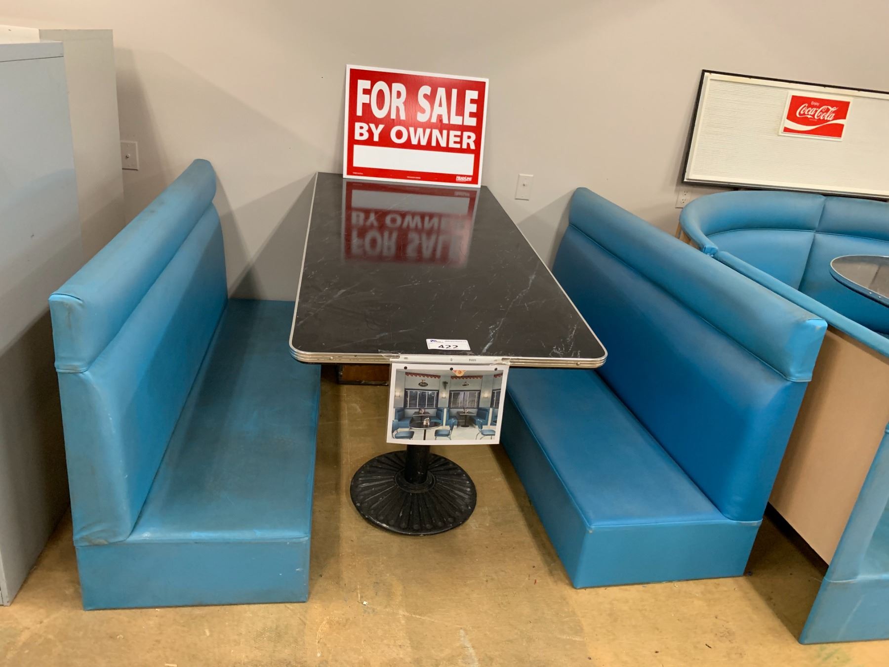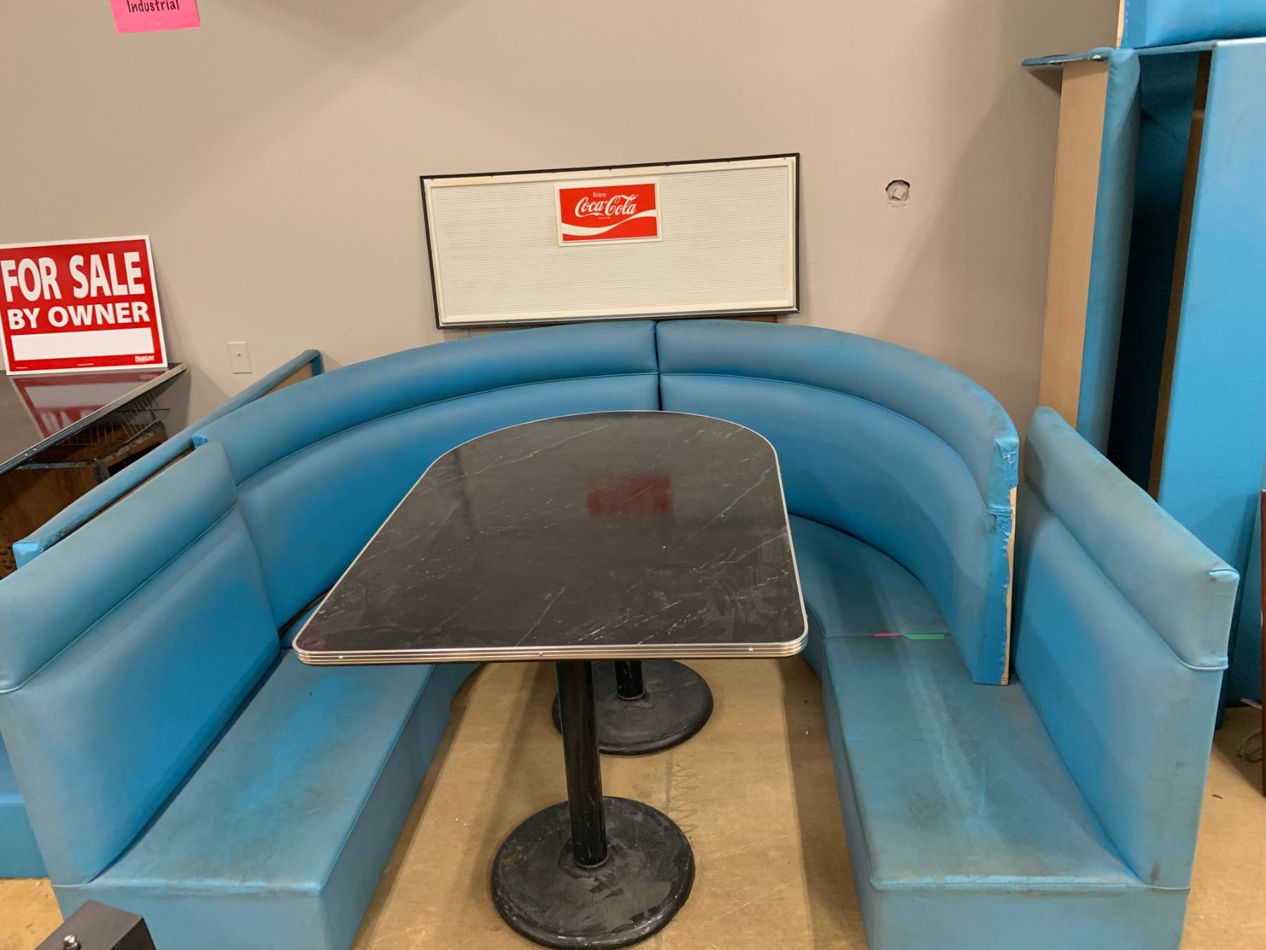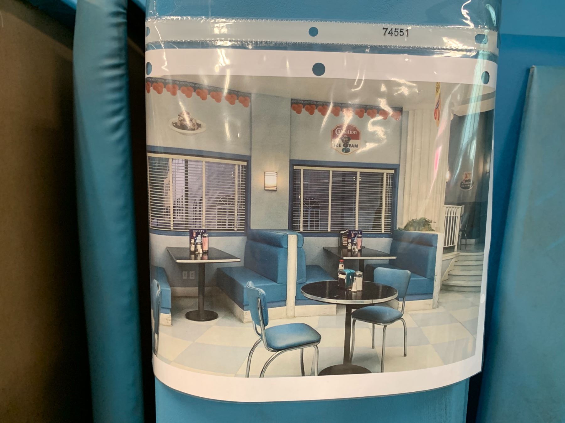 ASSORTED DINER FURNITURE INCLUDING; BOOTH SEATS, TABLES & LIGHT BOX (MUST TAKE ALL)