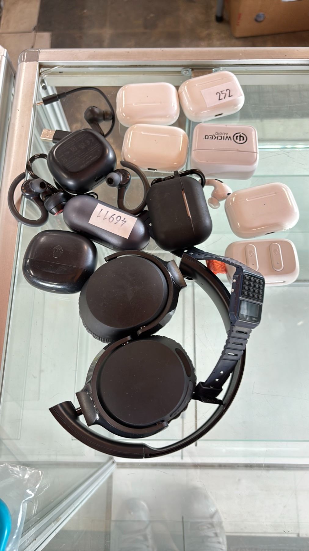 ASSORTED EARBUDS (MOSTLY CASES ONLY), CASIO WATCH & HEADPHONES