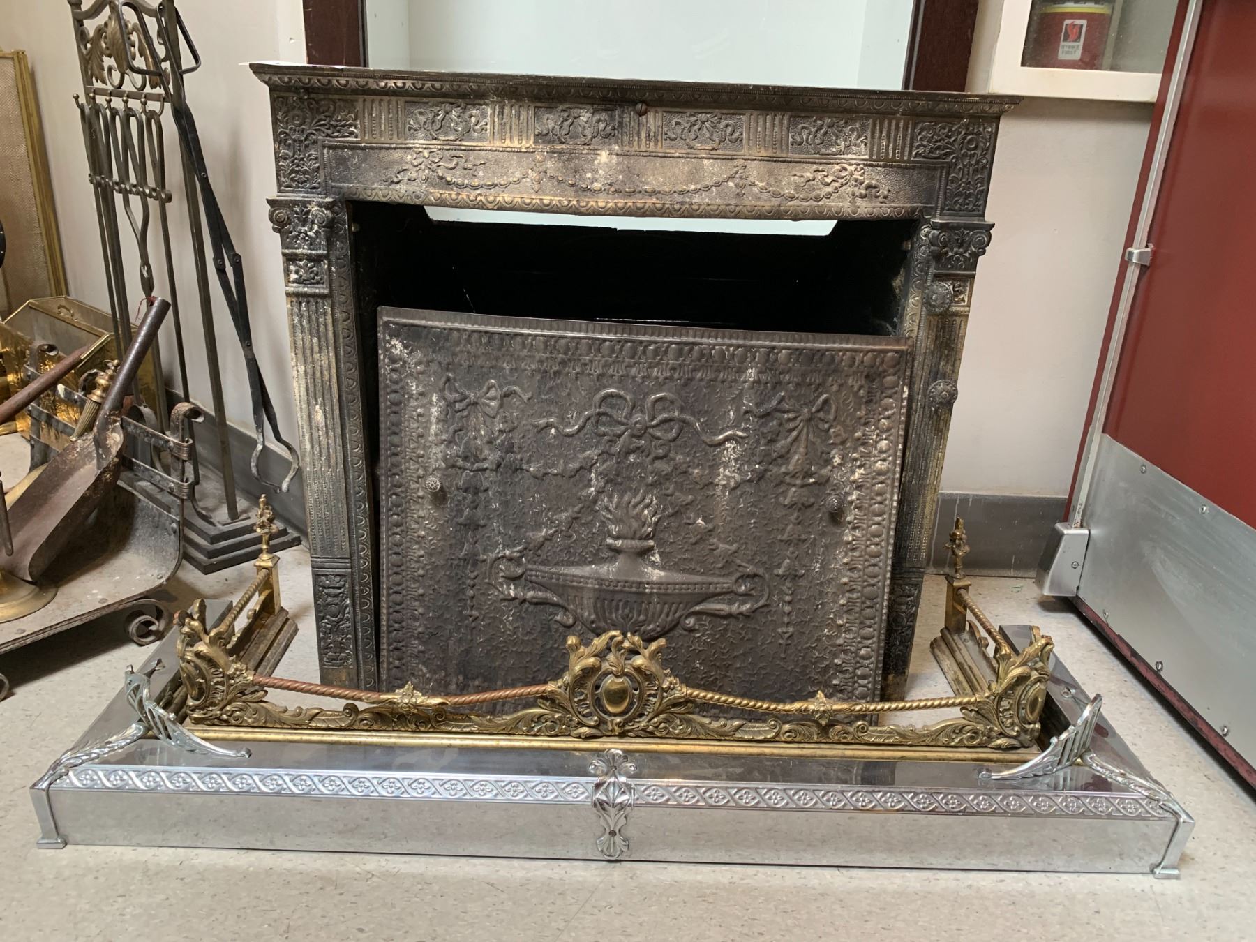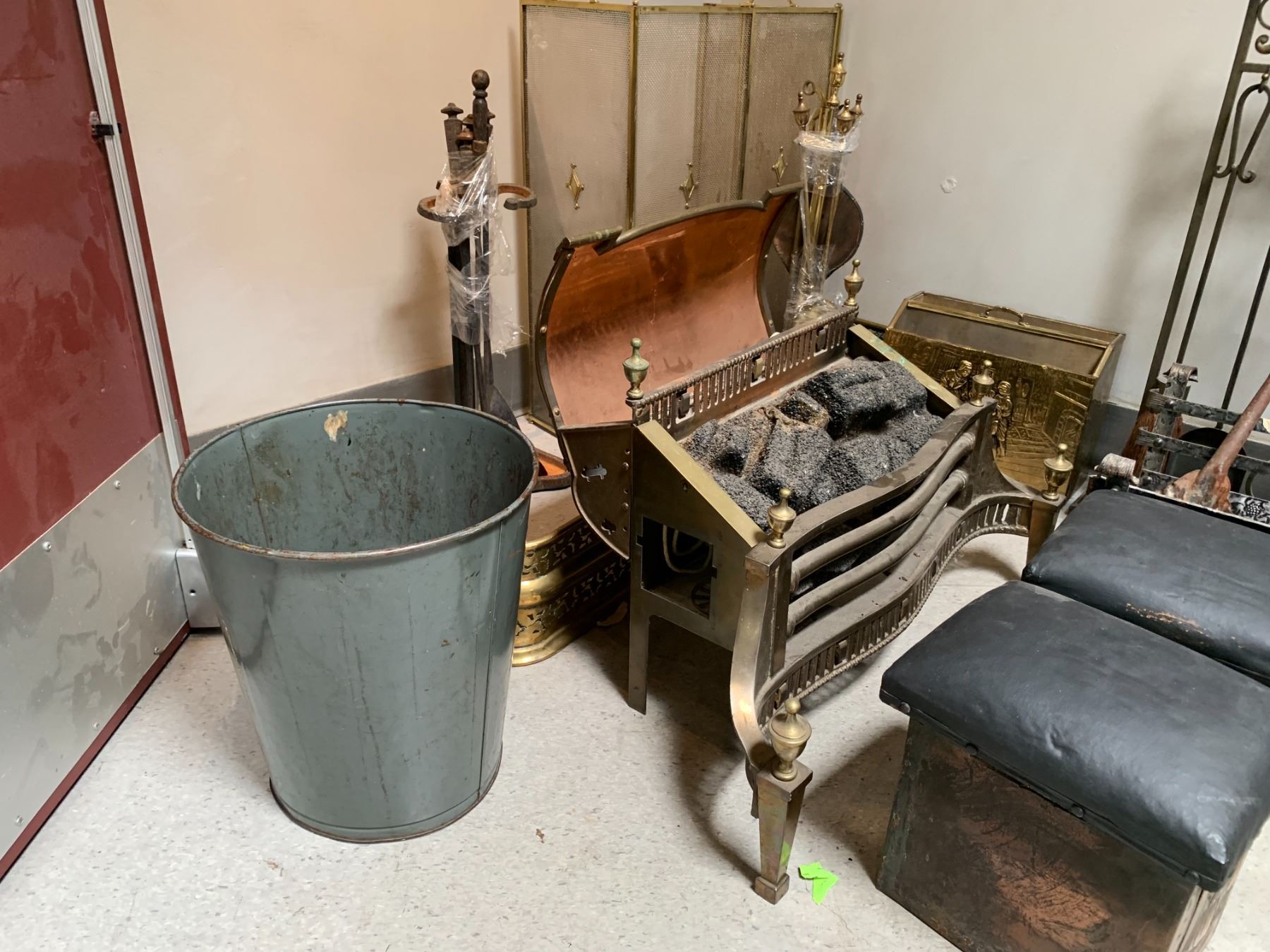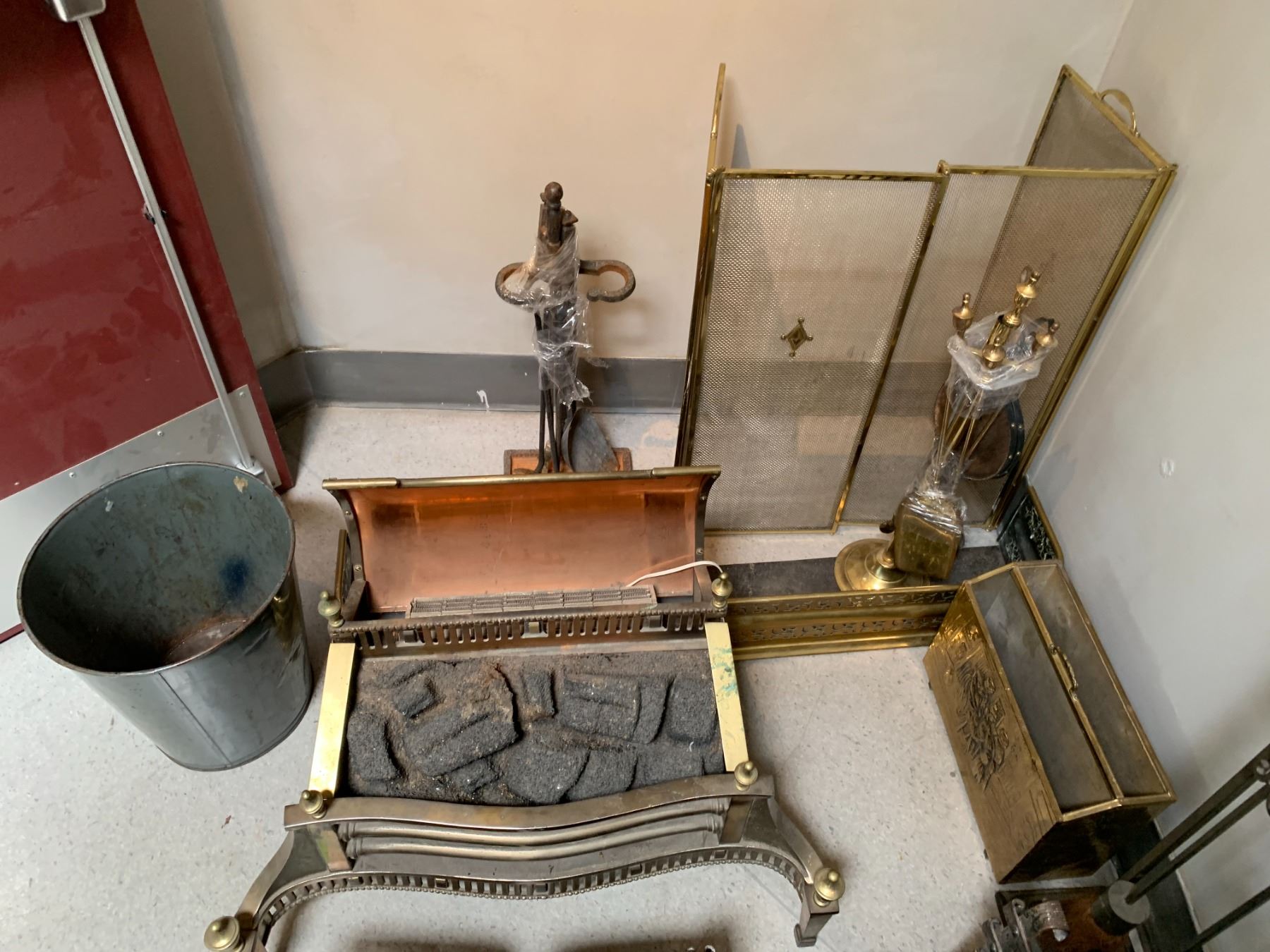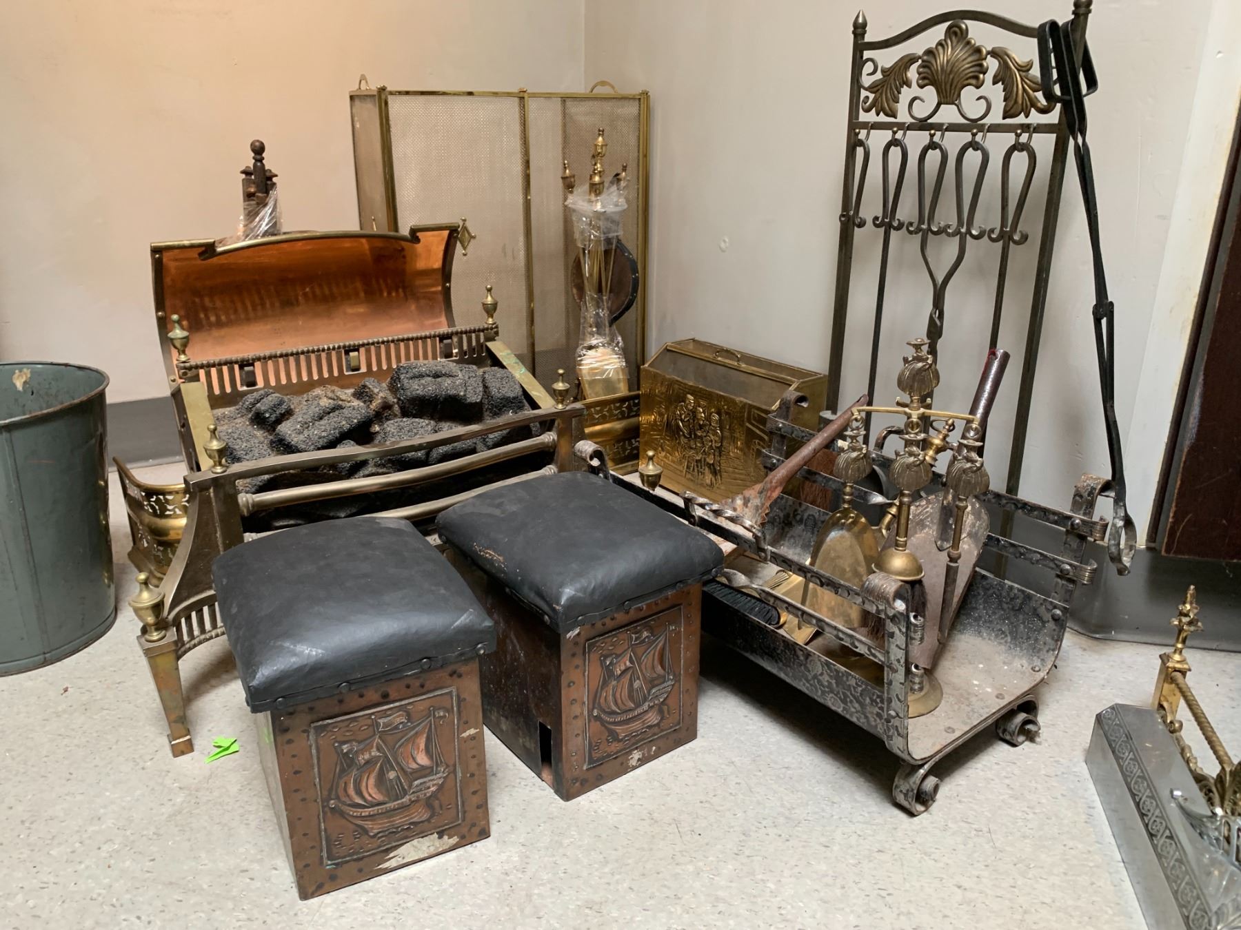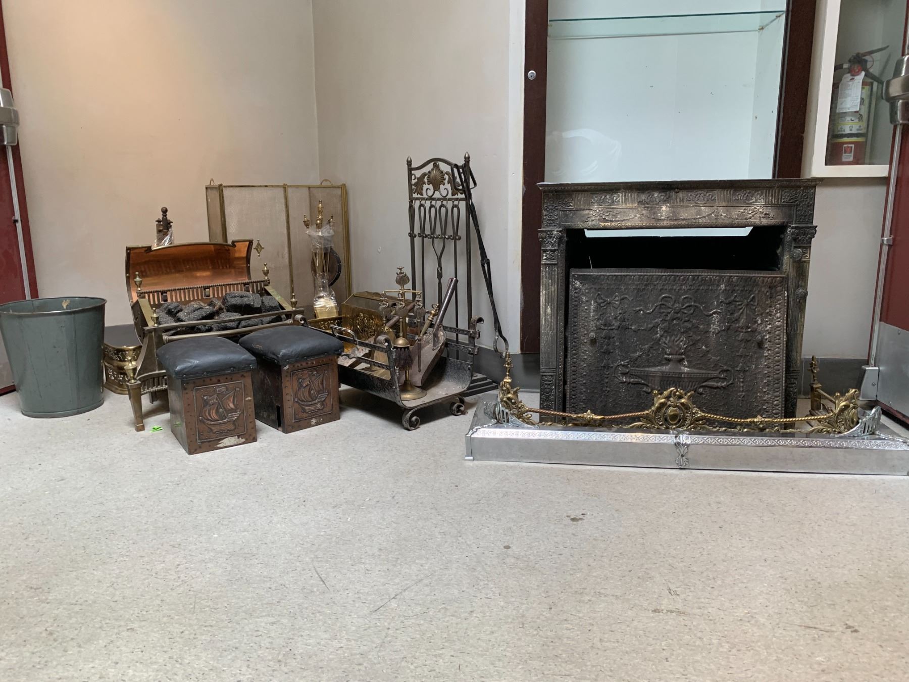 ASSORTED FIREPLACE ITEMS INCLUDING; TOOL SETS, FIREWOOD HOLDER, FIREPLACE FRAME & MORE