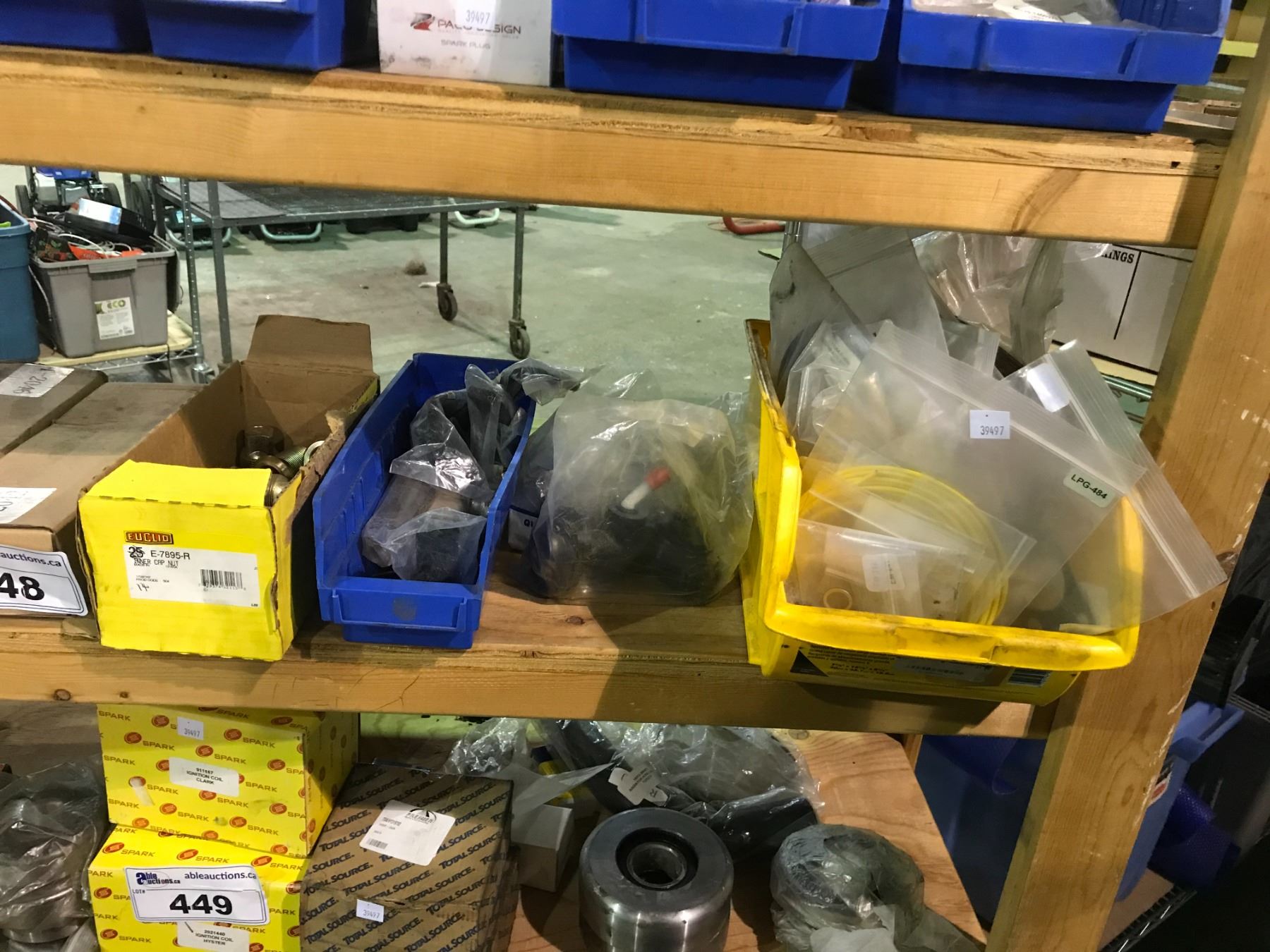 ASSORTED FORKLIFT PARTS & PIECES SUCH AS: SPARK PLUGS, SOLENOID, INNER CAP NUTS, NUTS, FUEL INDICATOR LIGHT, & MUCH MORE