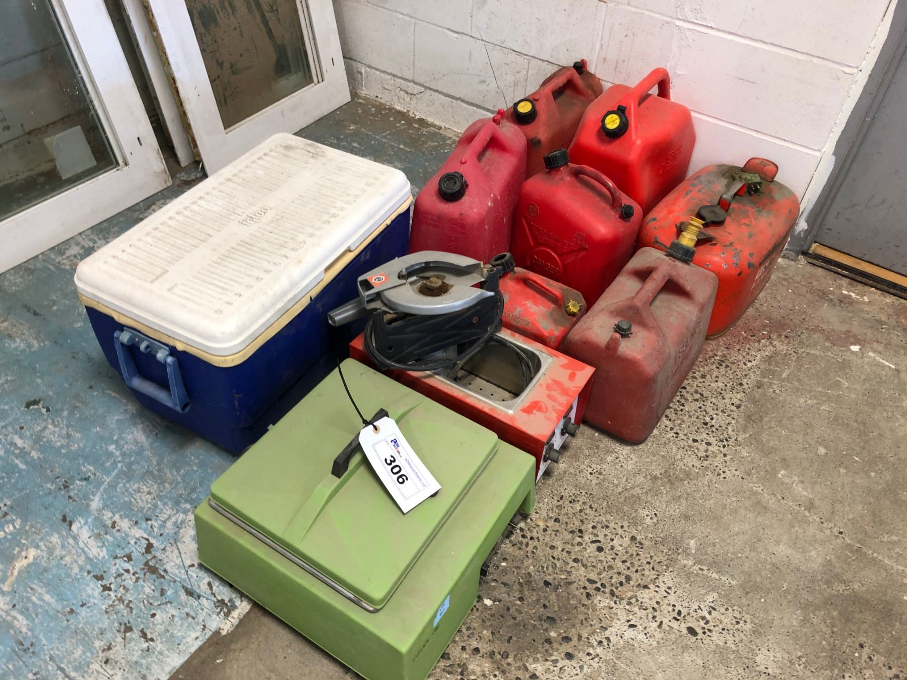 ASSORTED GAS CANS, COOLER, CIRCULAR SAW & MORE