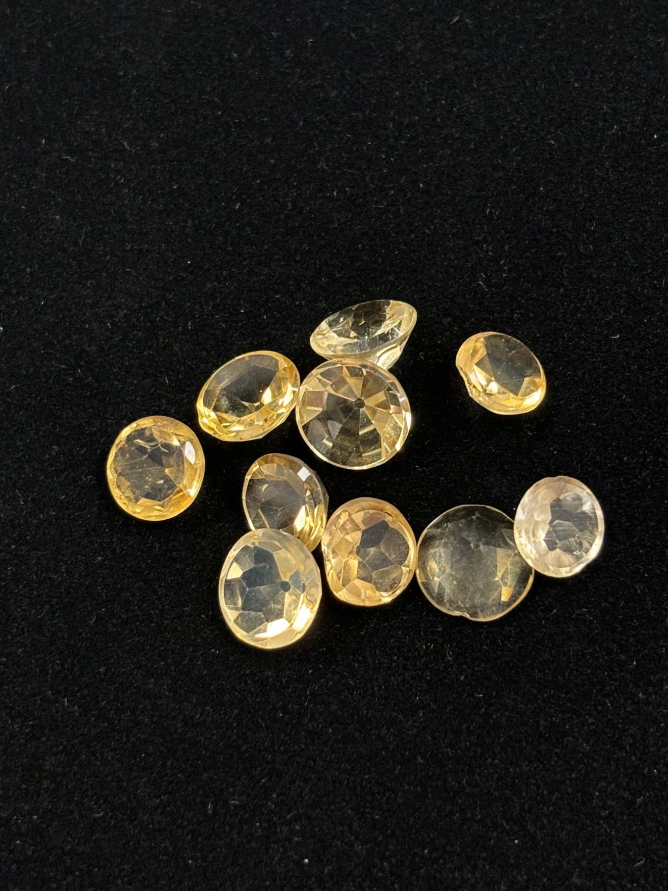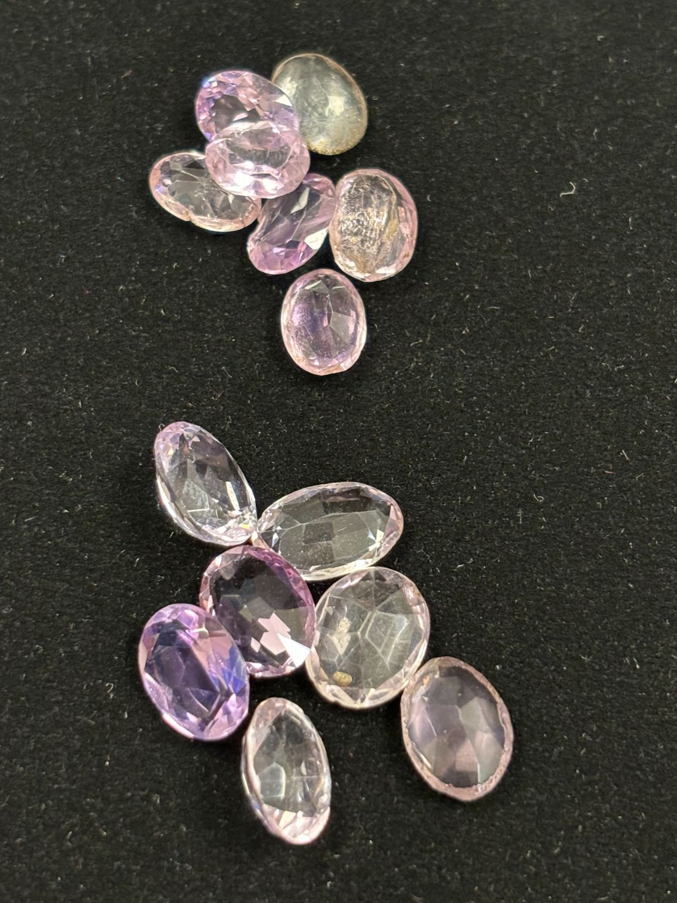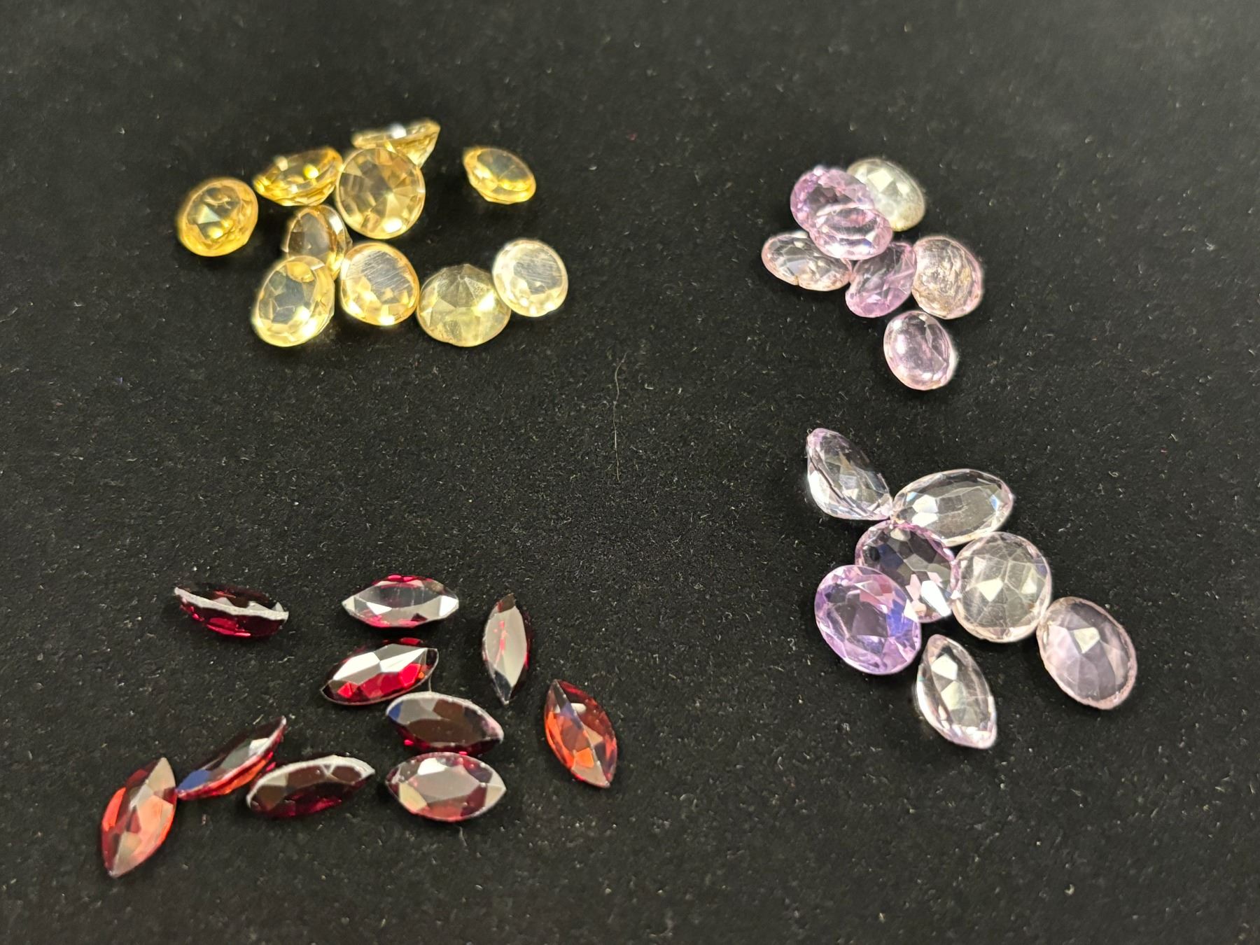 ASSORTED GEMS INCLUDING; 10 CITRINE, 10 GARNATES, & 14 AMETHYSTS. VARIOUS SIZES AND SHAPES