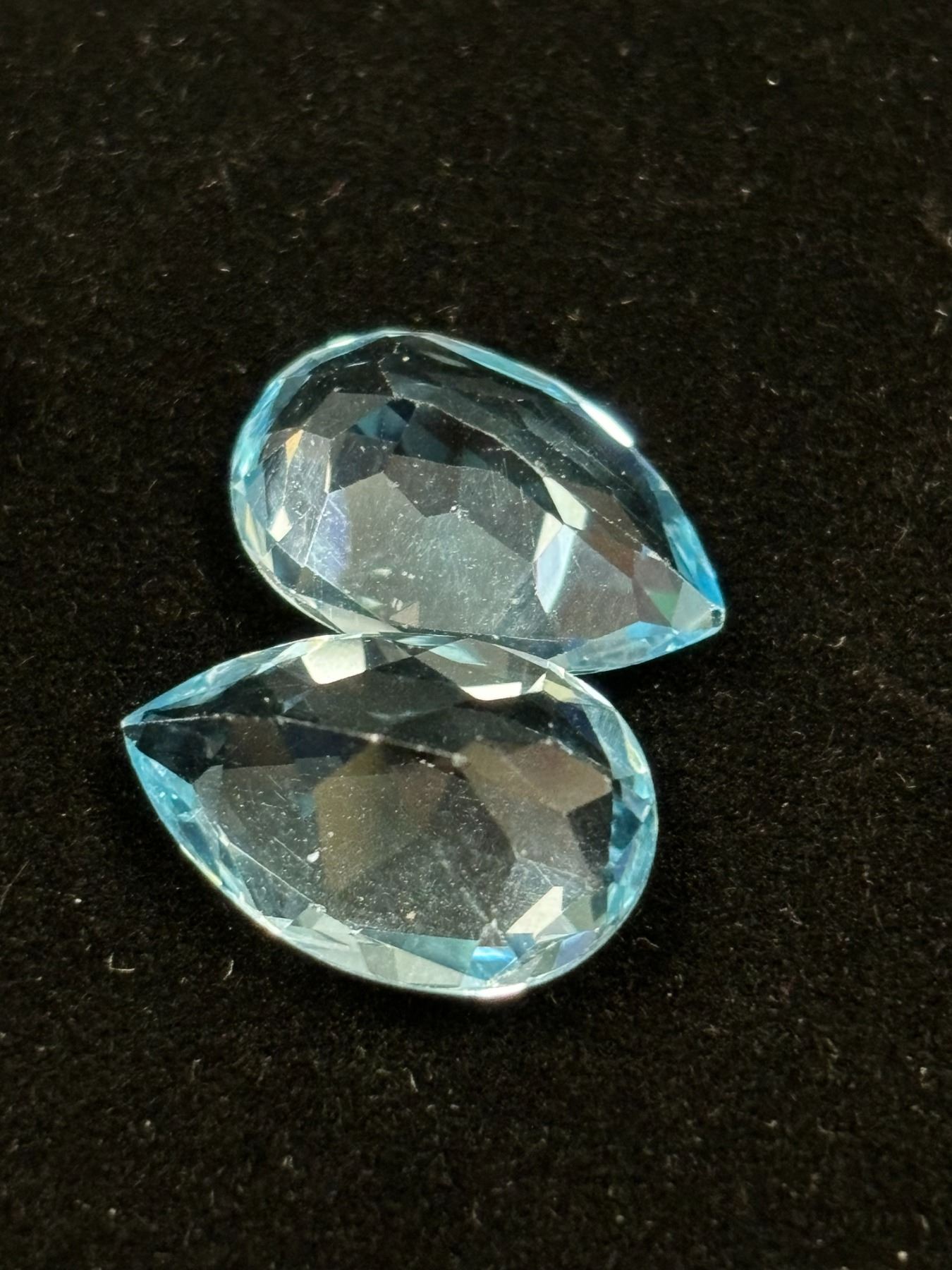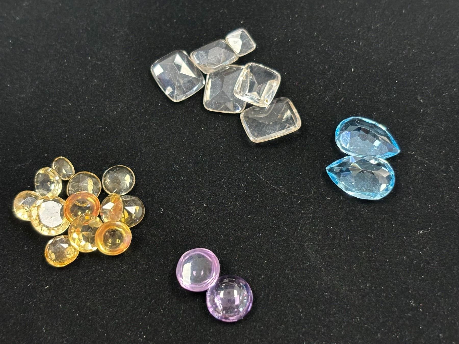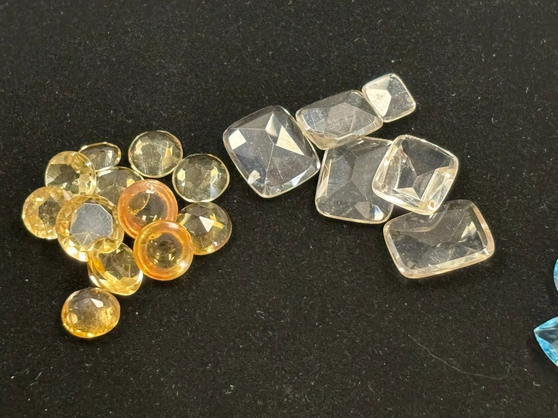 ASSORTED GEMS INCLUDING; 2 BLUE TOPAZ, 18 CITRINE, & 2 AMETHYSTS. VARIOUS SIZES AND SHAPES