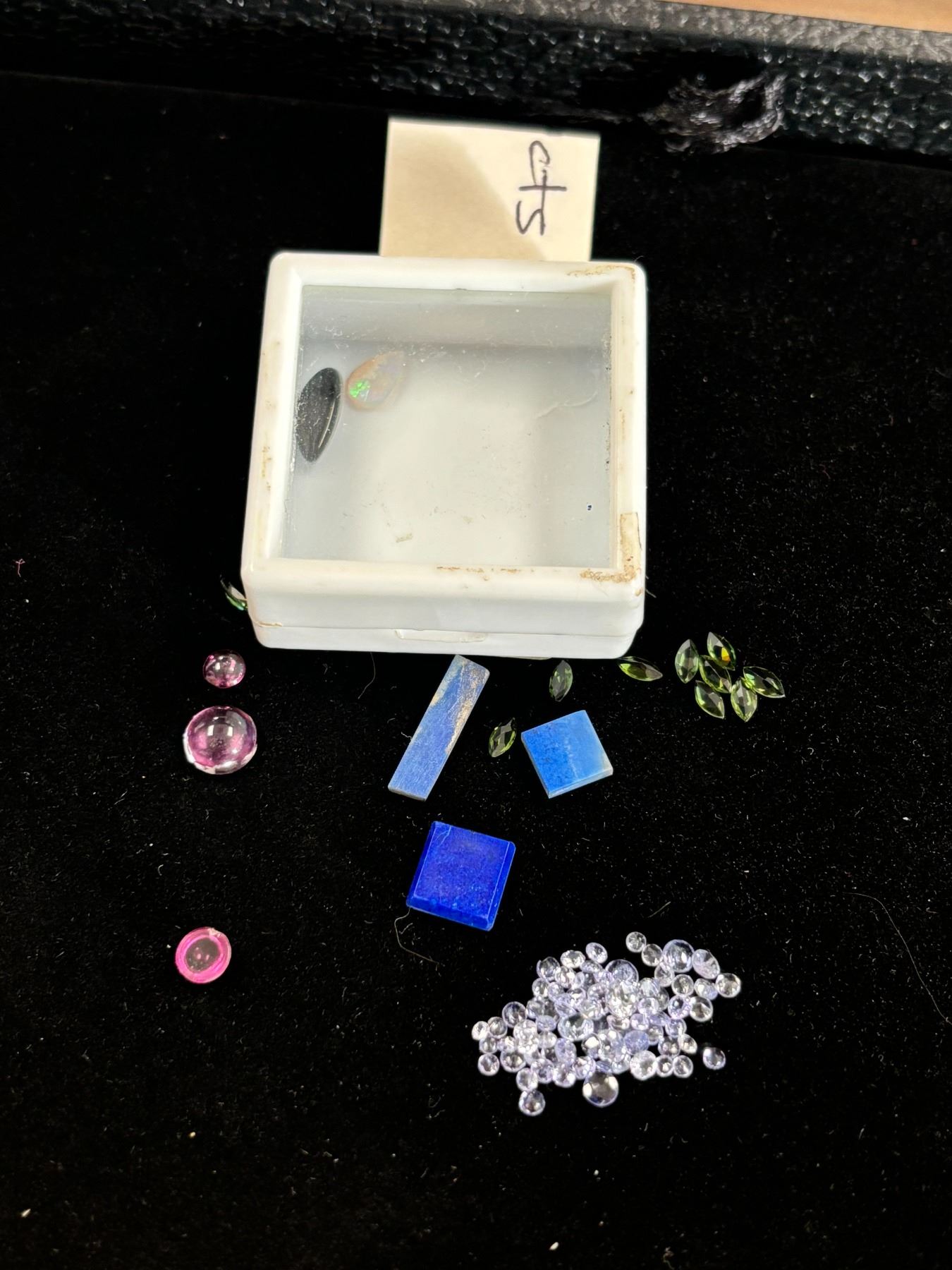 ASSORTED GEMS INCLUDING; 2 OPALS, 3 LAPIS LAZULI, MIXED TANZANITE, 10 TOURMALINES, & 3 GARNETS.