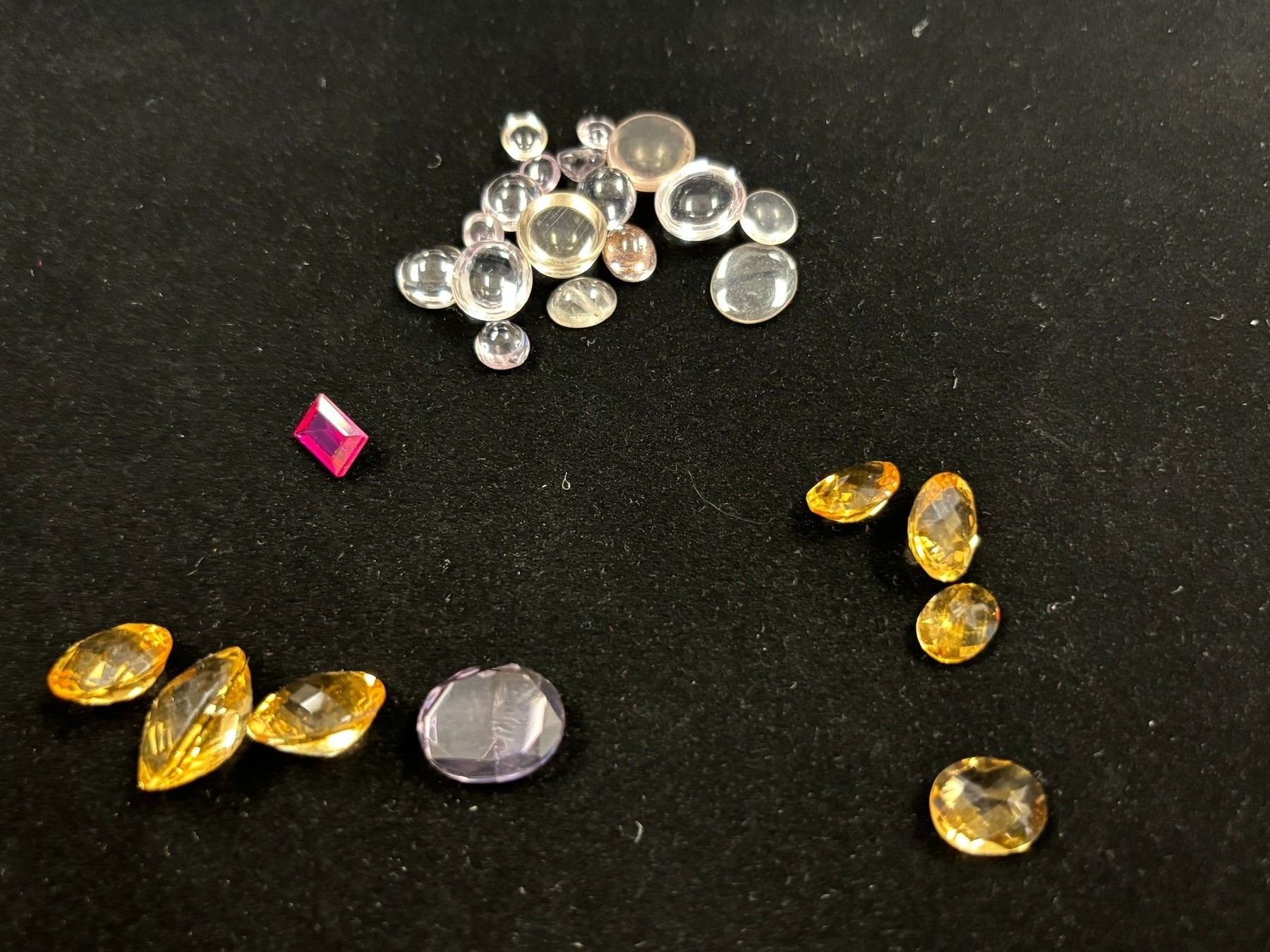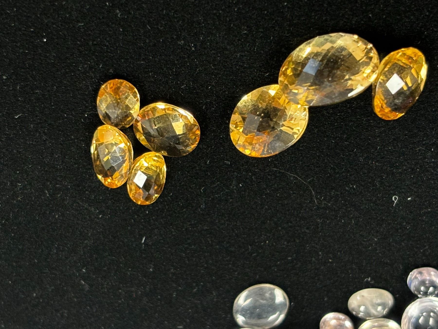 ASSORTED GEMS INCLUDING, 7 CITRINE, CLEAR CITRINE,1 AMETHYST, 1 RED SAPPHIRE. VARIOUS SIZES AND SHAPES