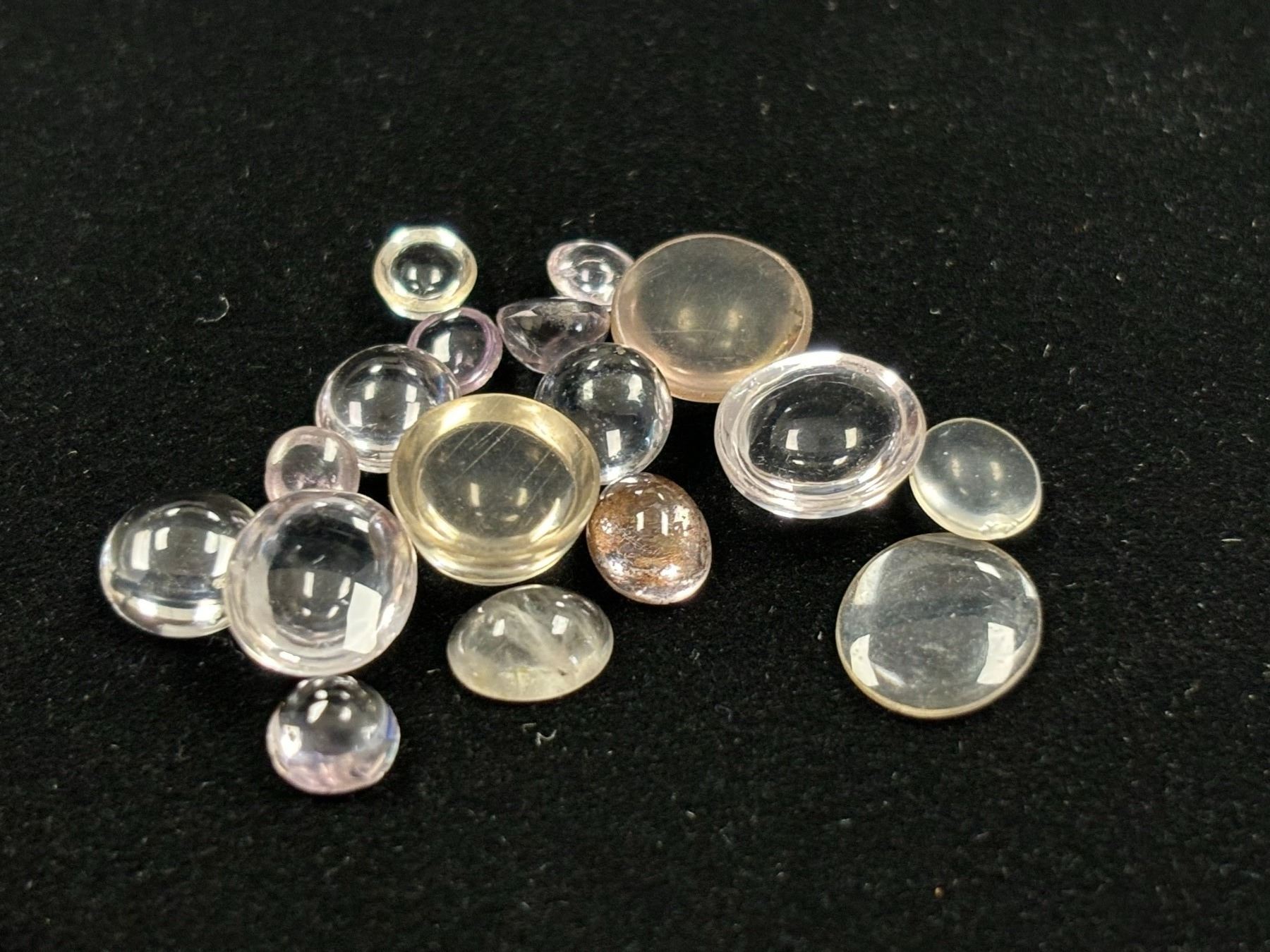 ASSORTED GEMS INCLUDING, 7 CITRINE, CLEAR CITRINE,1 AMETHYST, 1 RED SAPPHIRE.