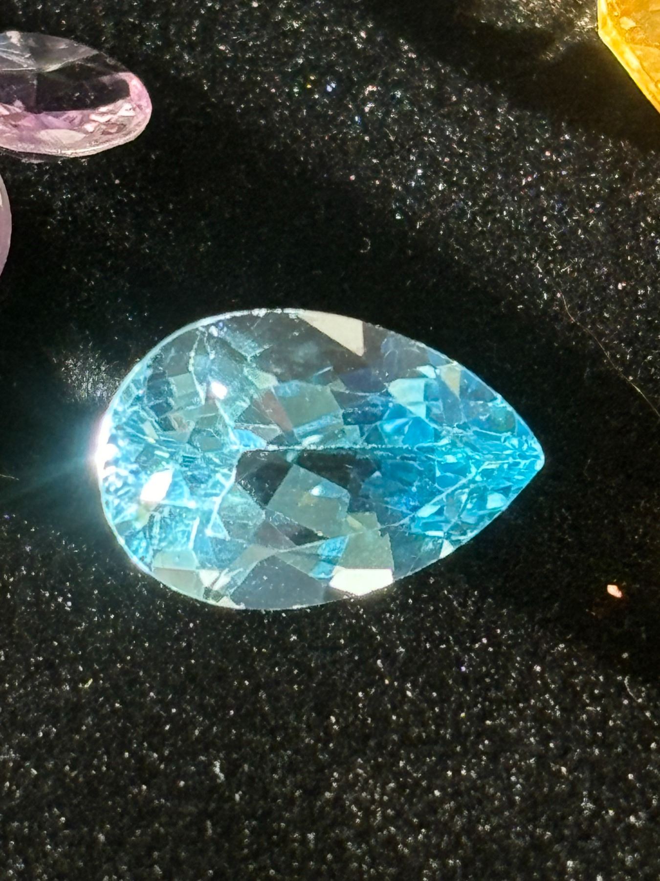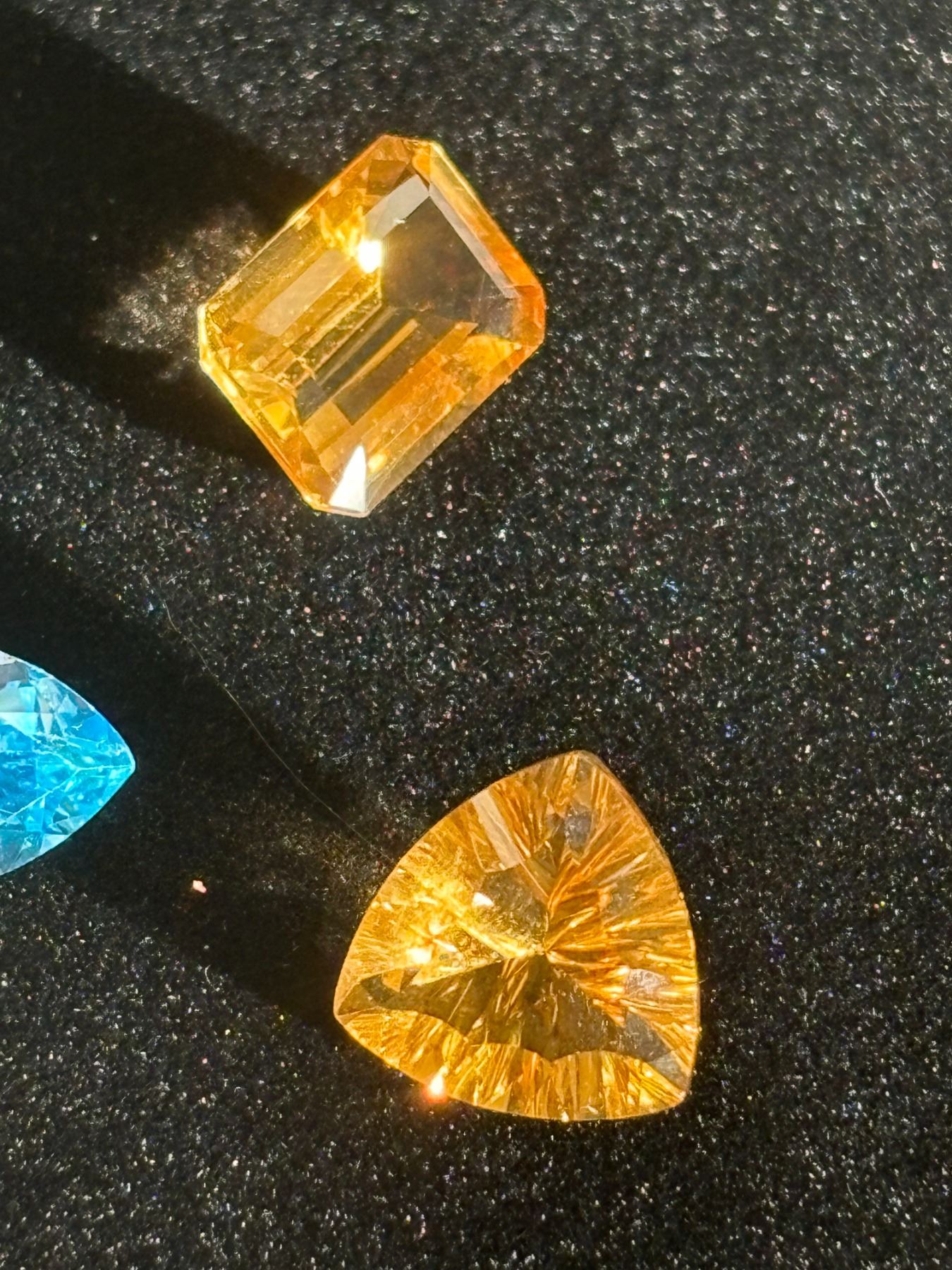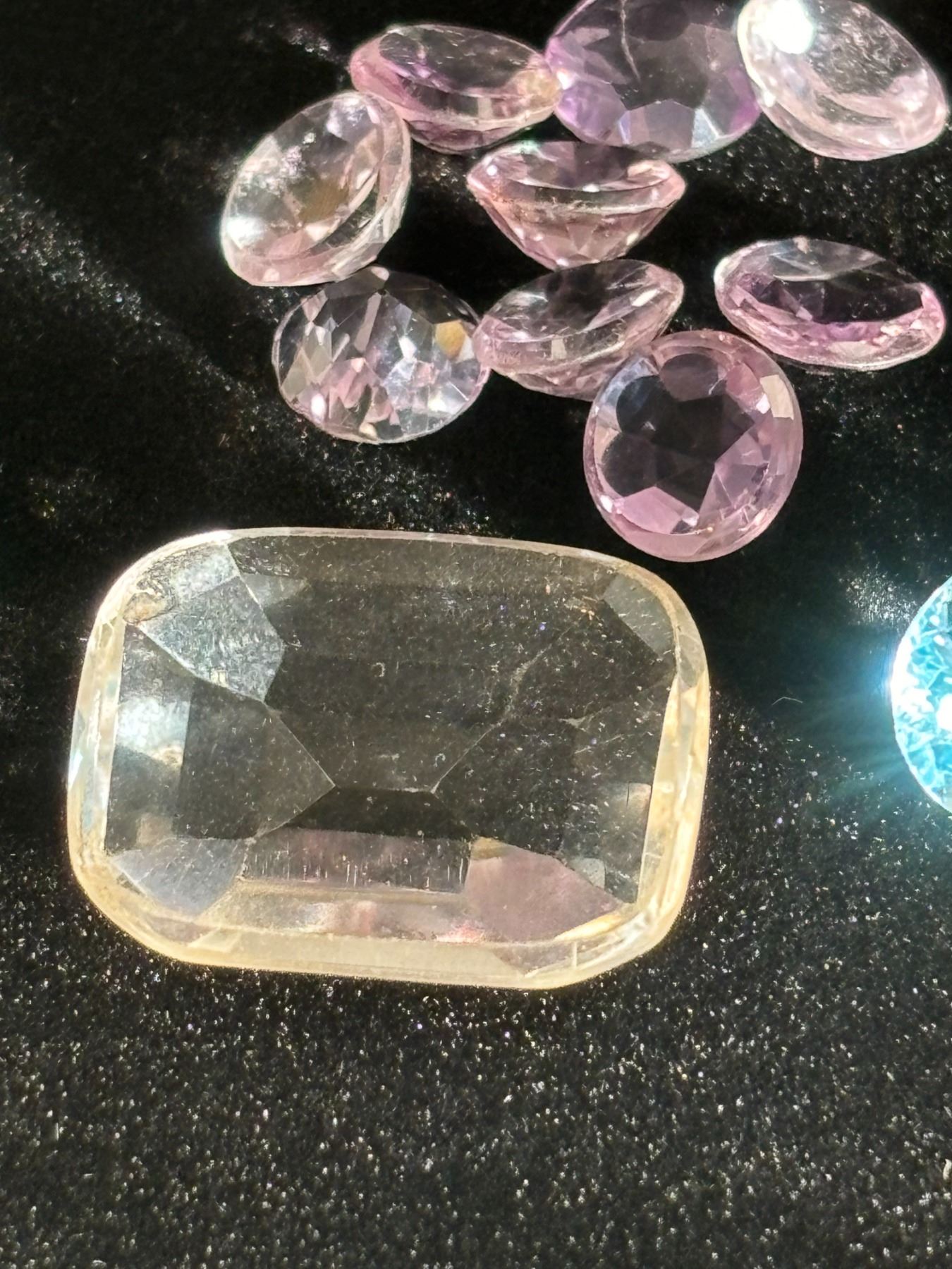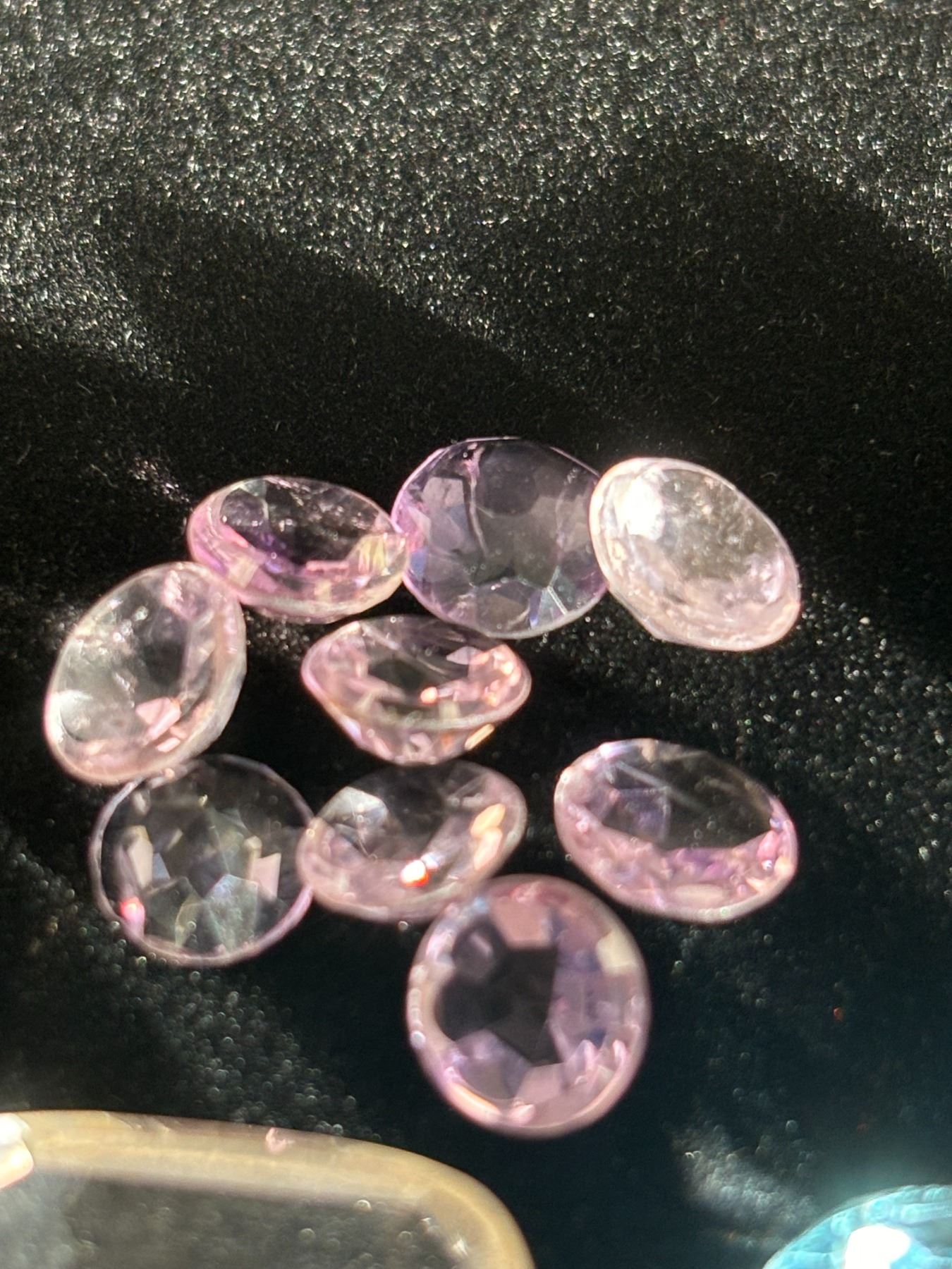 ASSORTED GEMS INCLUDING, 9 AMETHYSTS, 1 TOPAZ, 2 CITRINE, 1 SMOKEY QUARTZ. VARIOUS SIZES