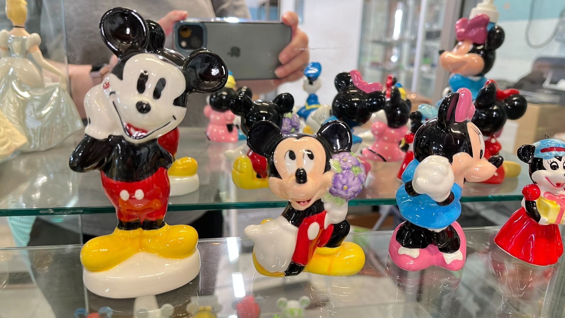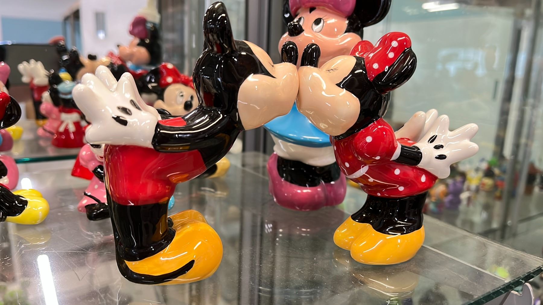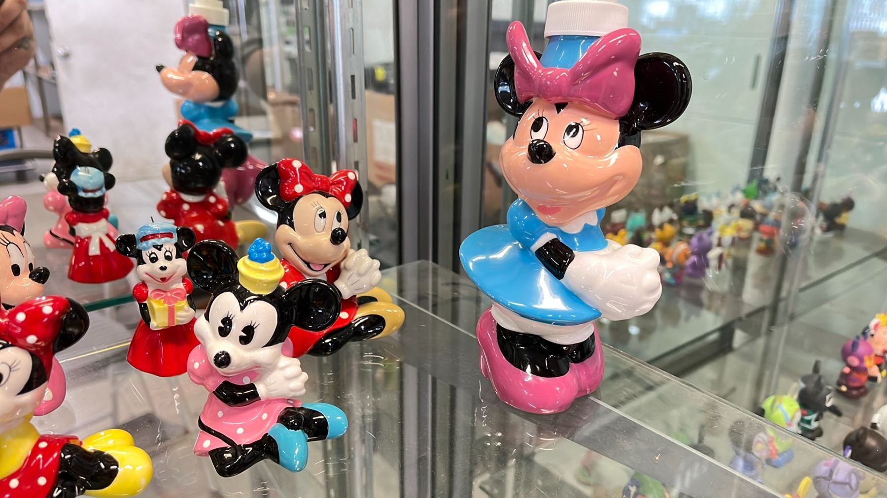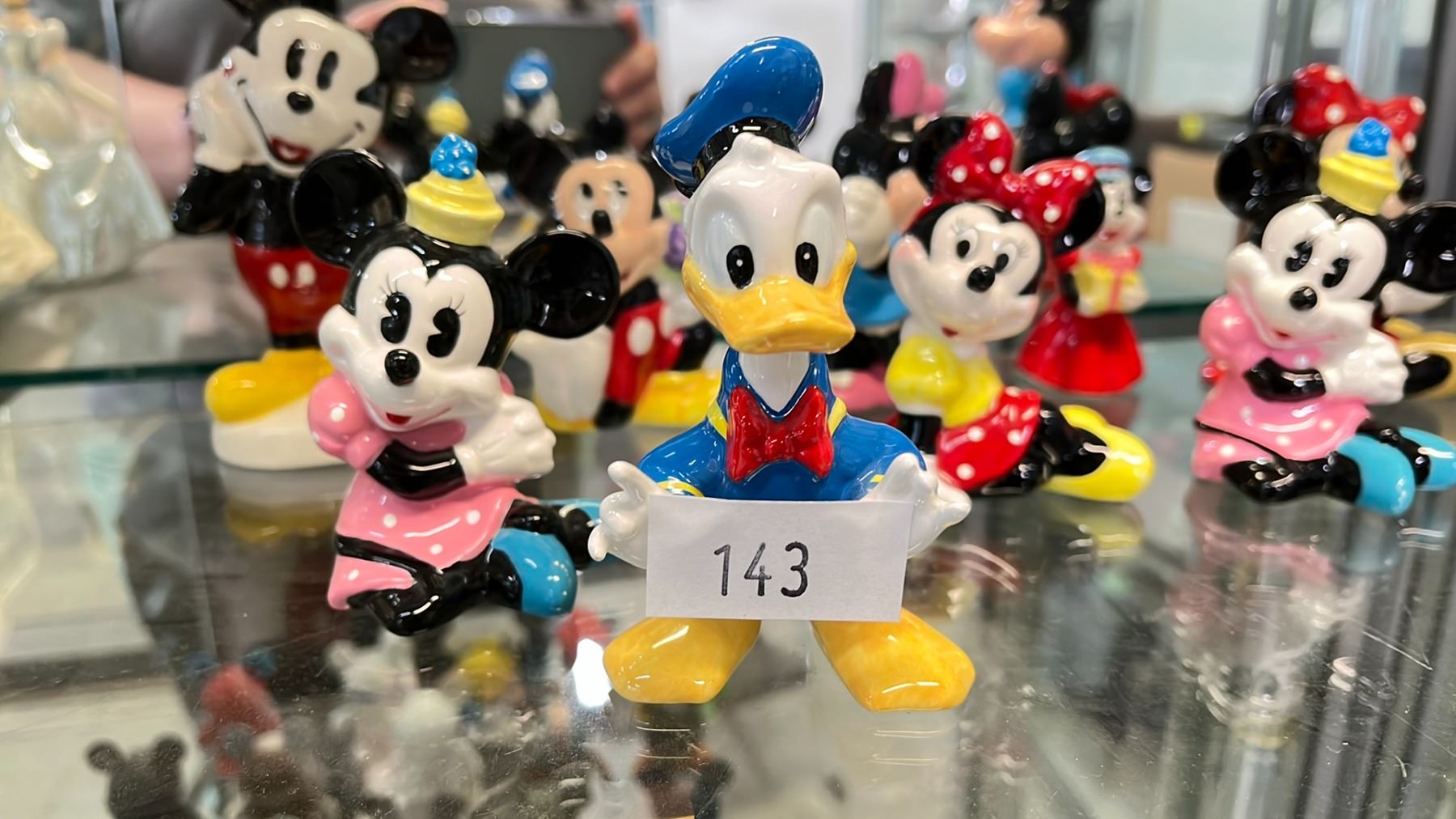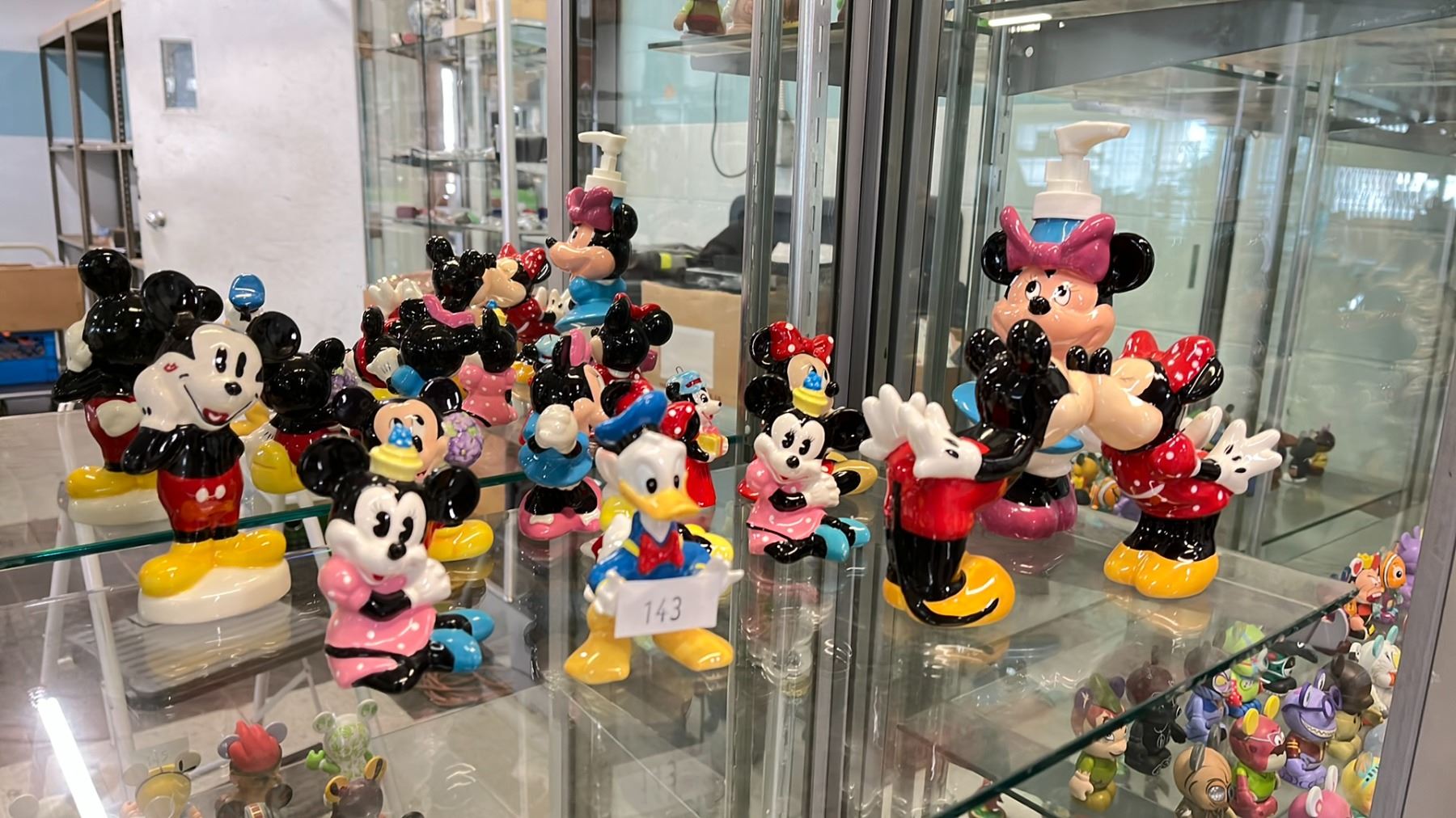 ASSORTED GLASS MICKEY, MINNIE + DONALD DUCK FIGURES & A MINNIE SOAP DISPENSER