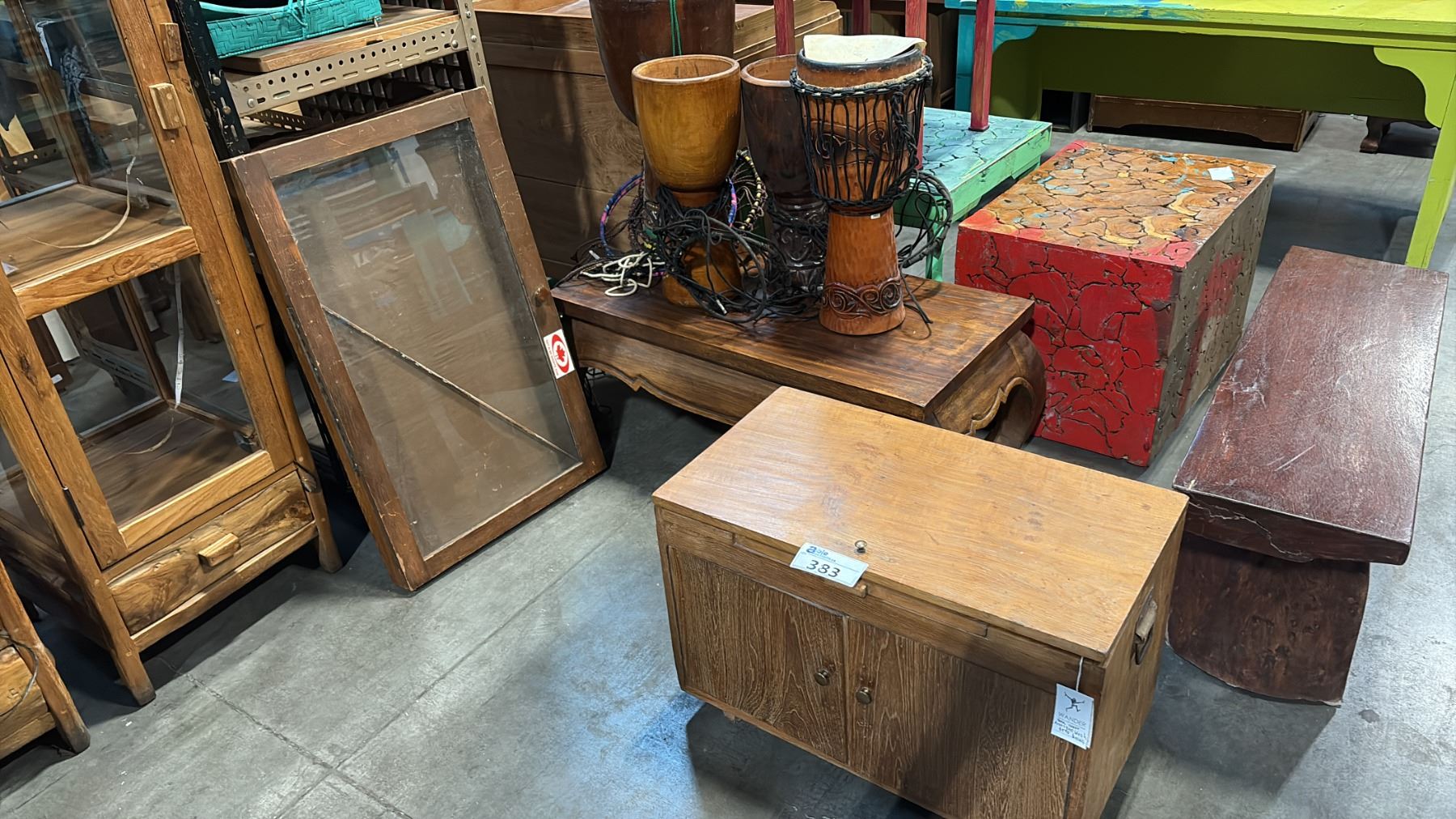ASSORTED HARDWOOD TABLES AND MISC DECOR