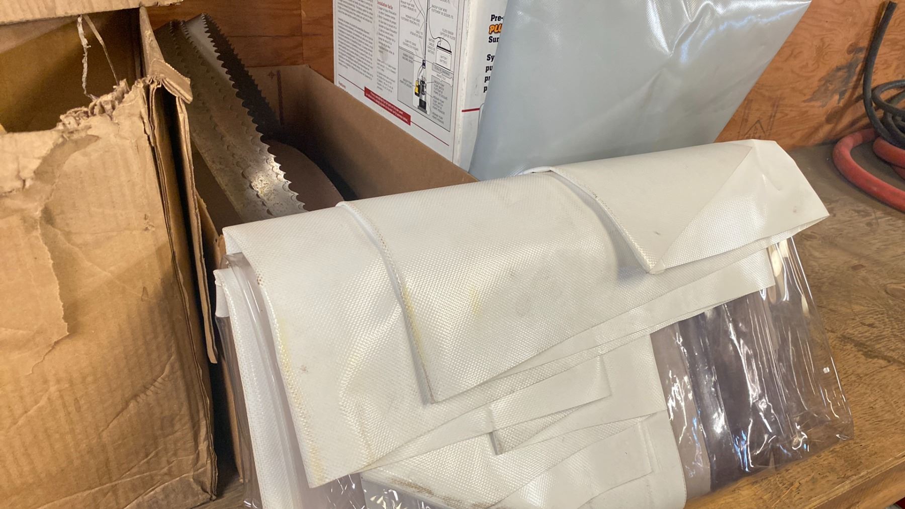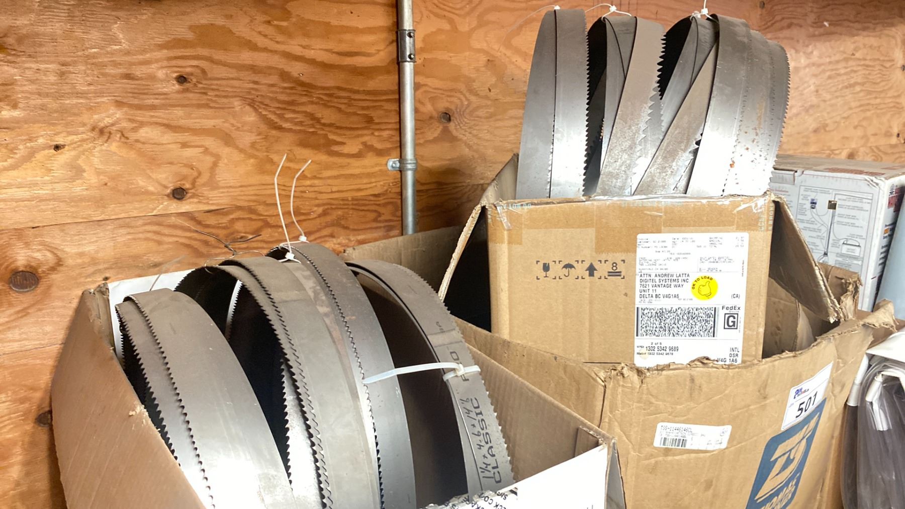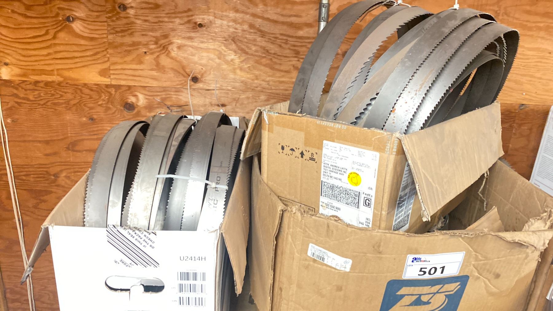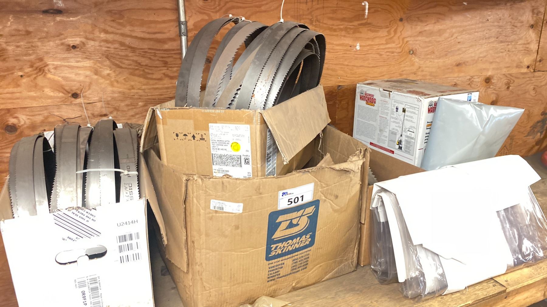 ASSORTED INDUSTRIAL BANDSAW BLADES & WHITE/CLEAR PLASTIC COVER