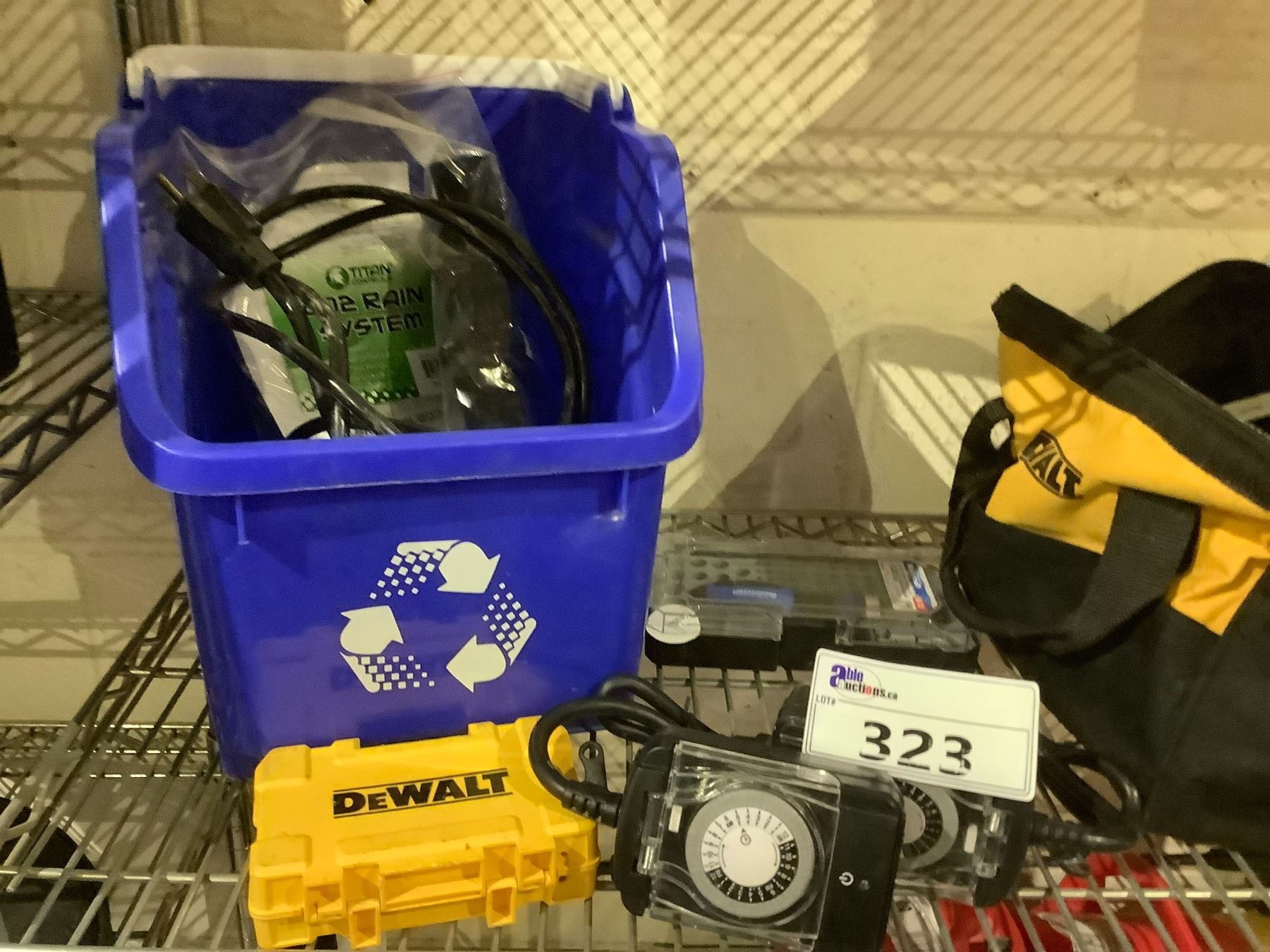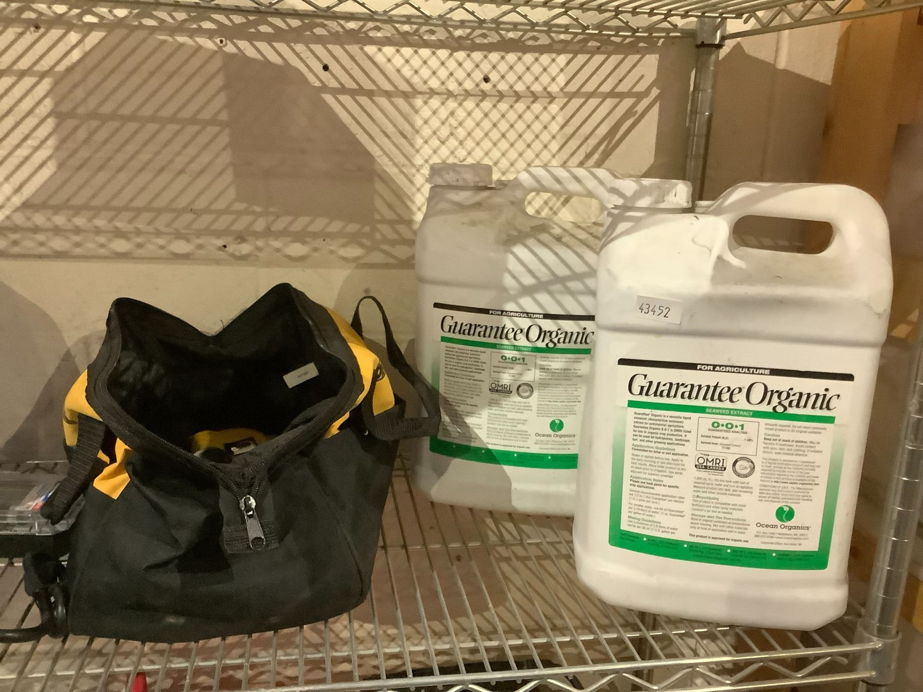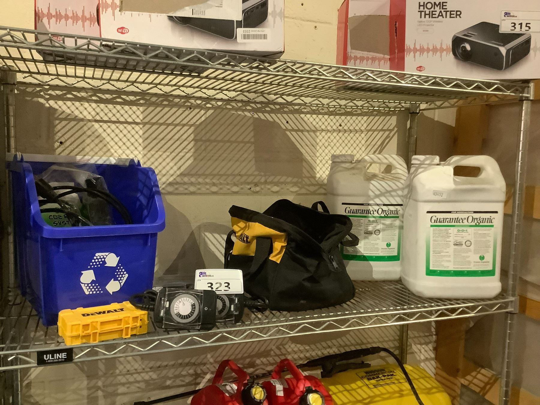 ASSORTED ITEMS INCLUDING; 2 BOTTLES GUARANTEE ORGANIC SEAWEED EXTRACT, DEWALT TOOL BAG, OUTDOOR TIMER OUTLETS & MORE
