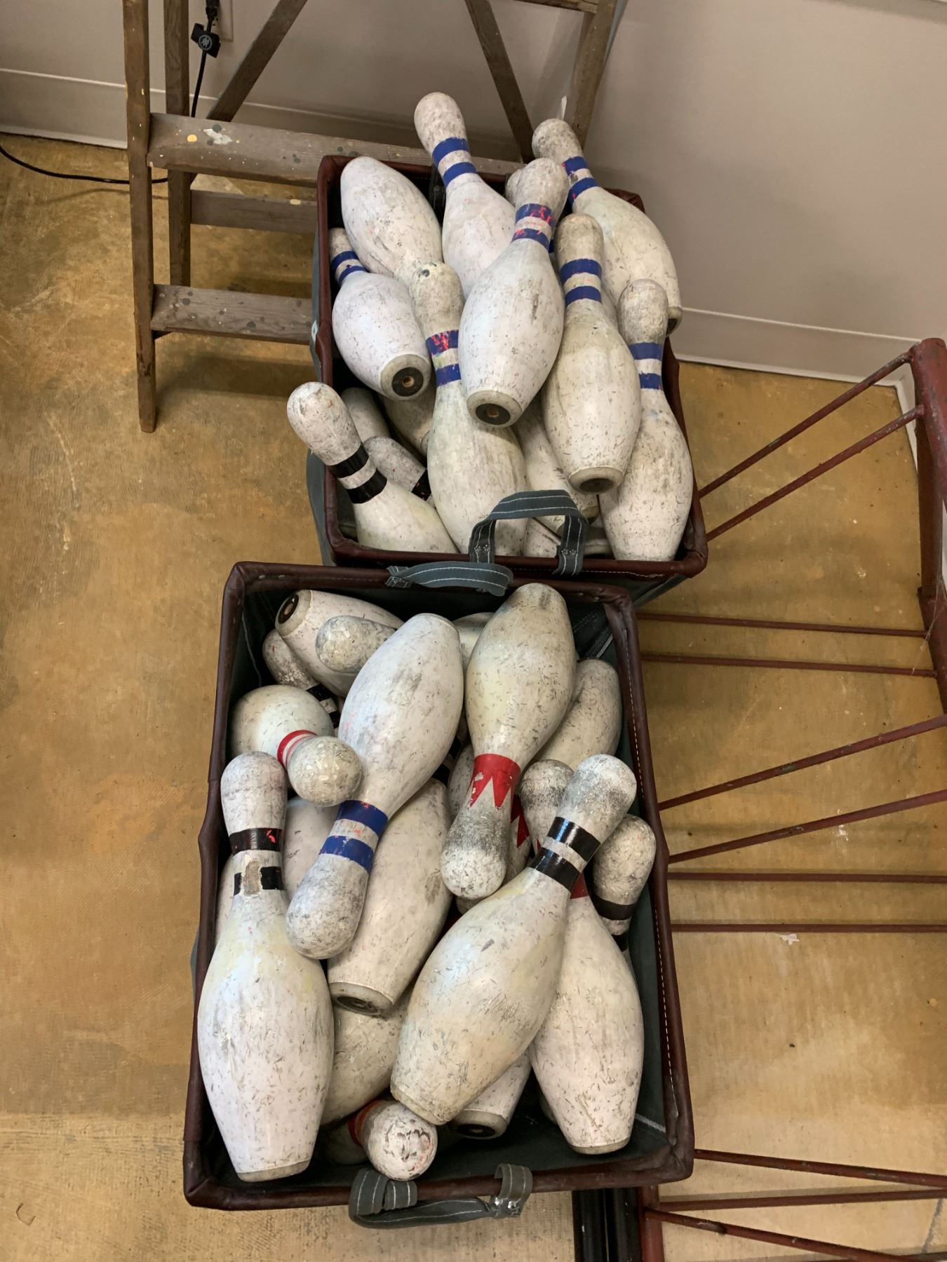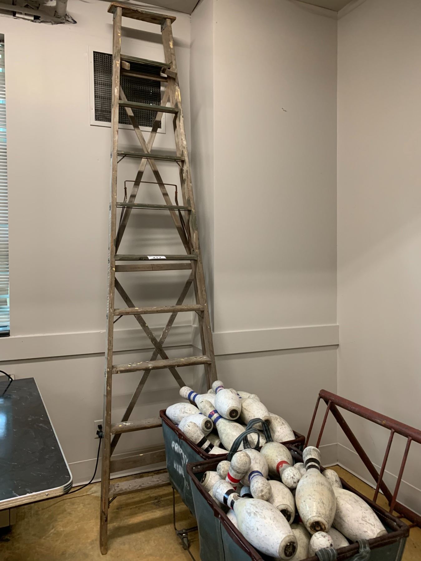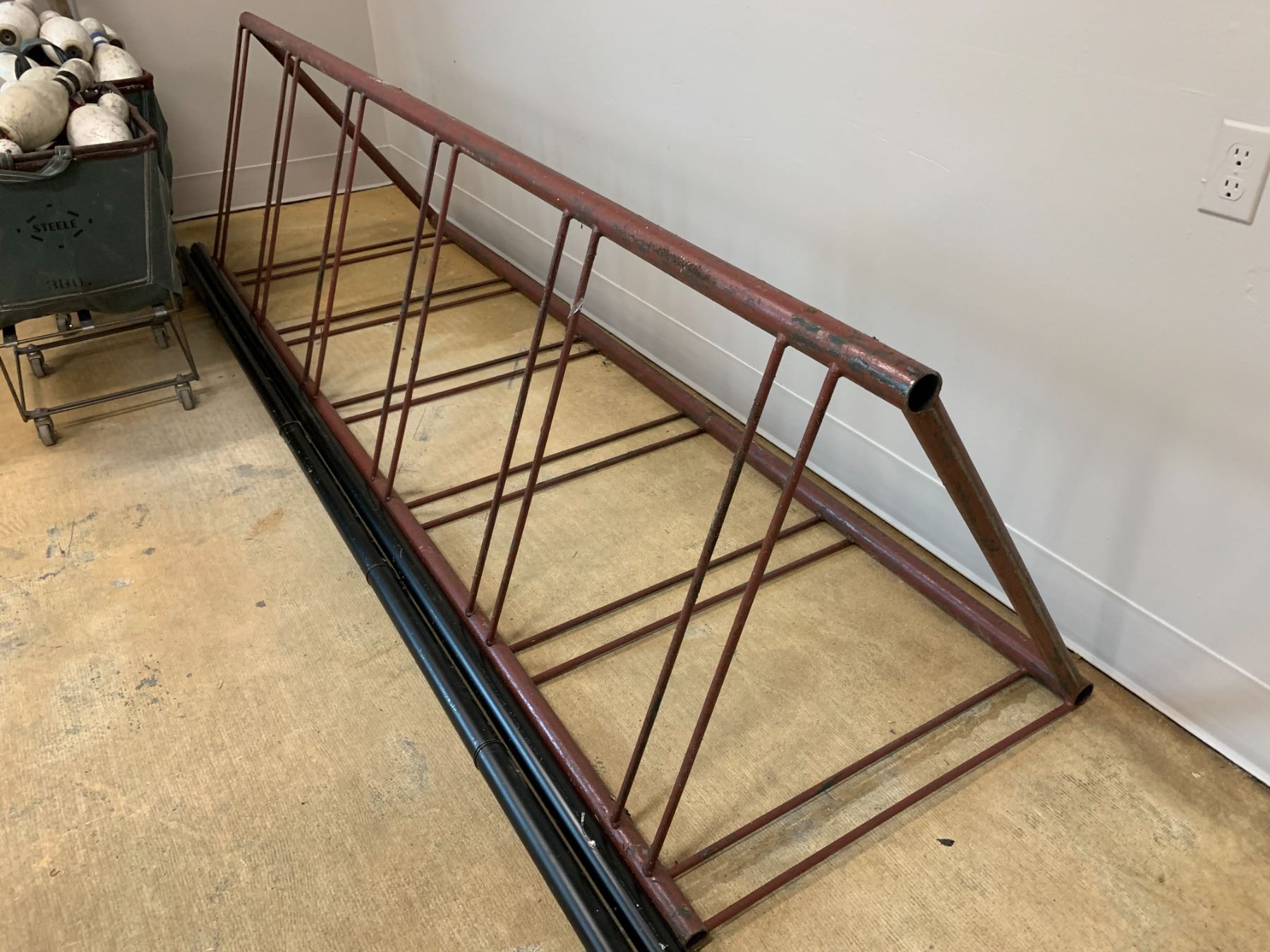 ASSORTED ITEMS INCLUDING; 2 FABRIC ROLLING BINS OF BOWLING PINS, METAL BICYCLE RACK, WOOD LADDER & 2 METAL PIPES