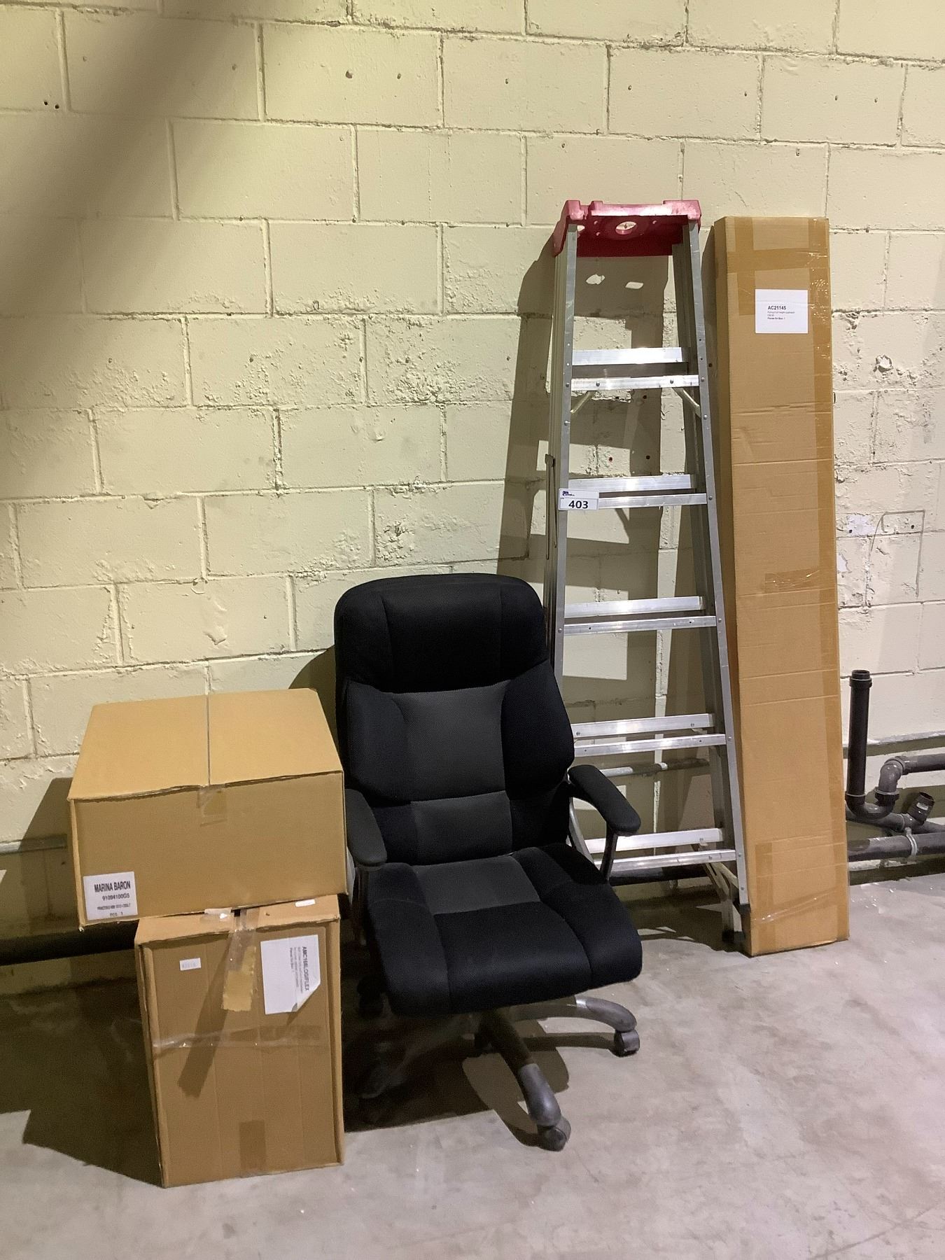ASSORTED ITEMS INCLUDING: 6FT ALUMINUM STEP LADDER, ROLLER OFFICE CHAIR, PULLOUT FULL HEIGHT CUPBOARD 45CM AND MORE