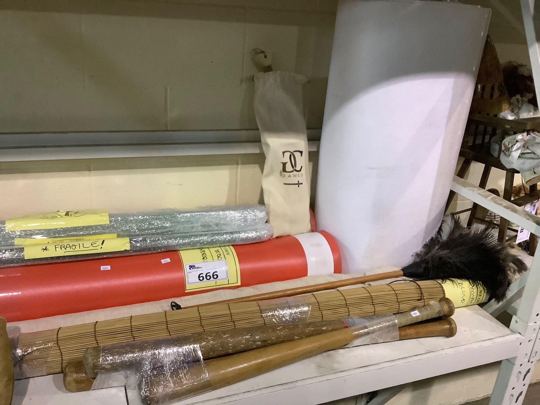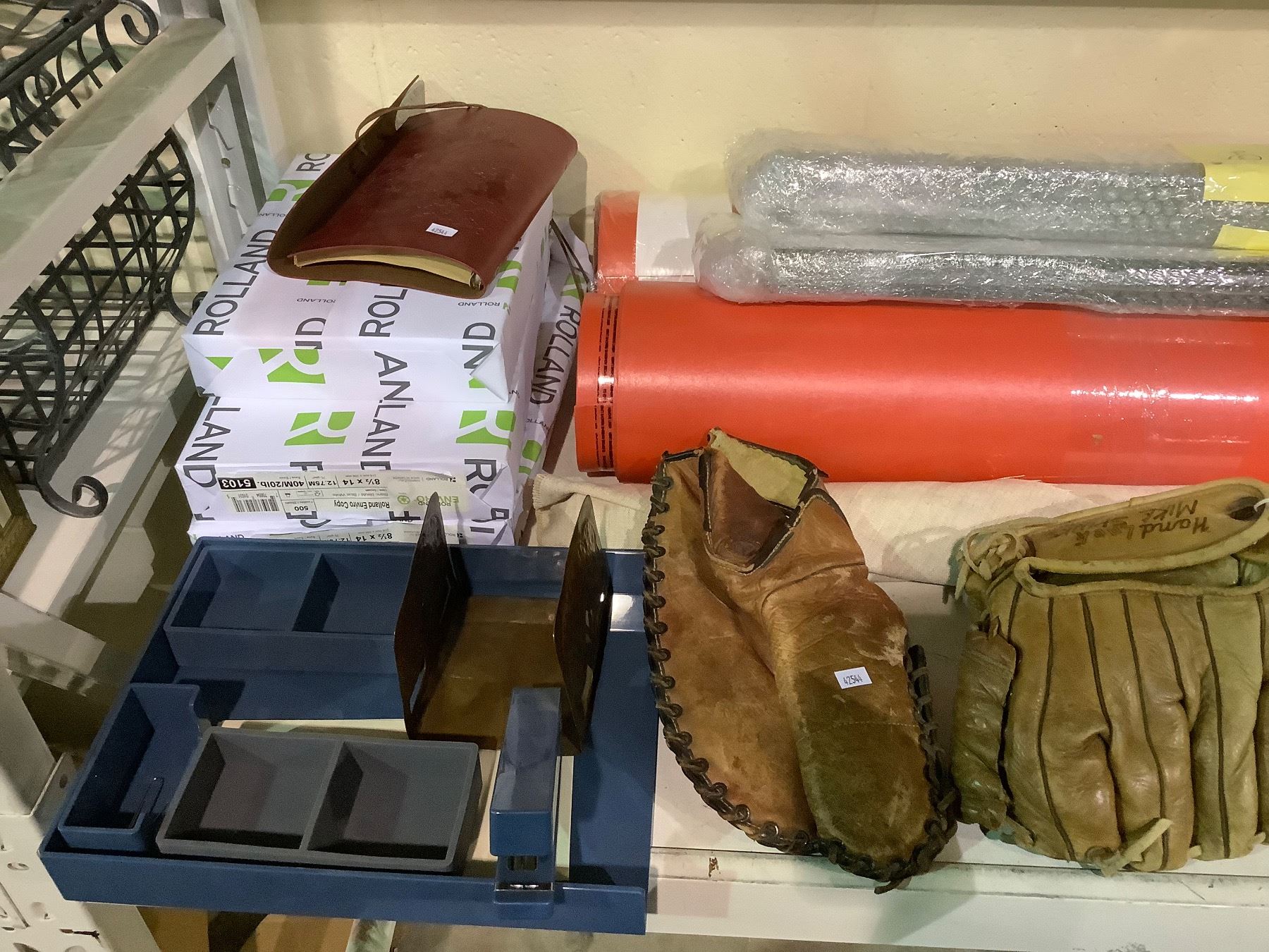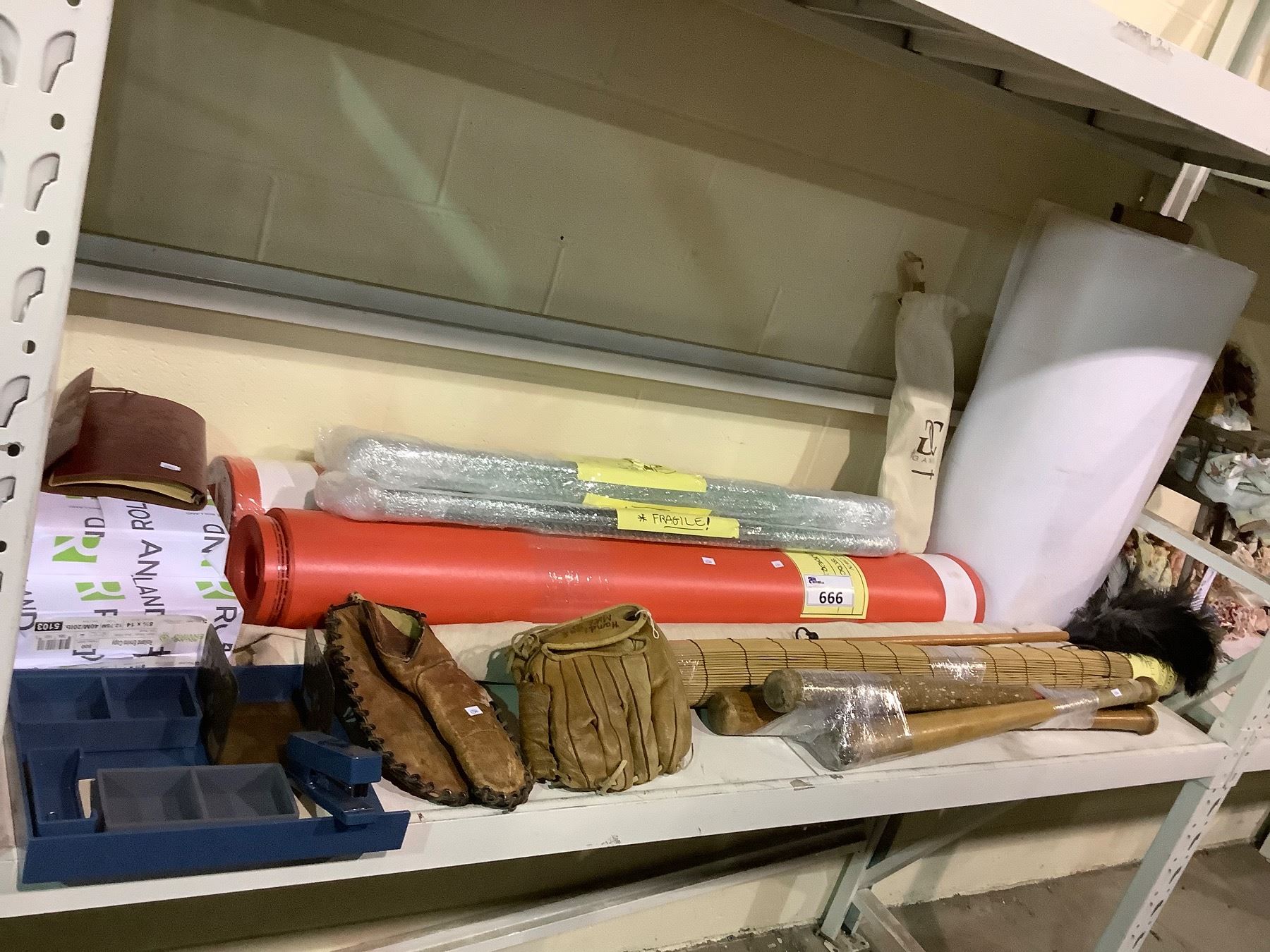 ASSORTED ITEMS INCLUDING; BASEBALL GLOVES & BATS, WOODEN PRACTICE SWORDS, PAPER & MORE