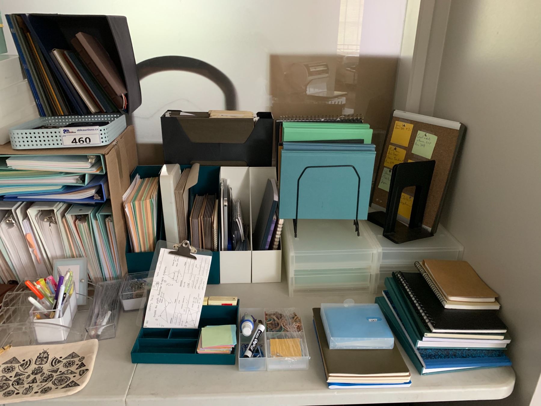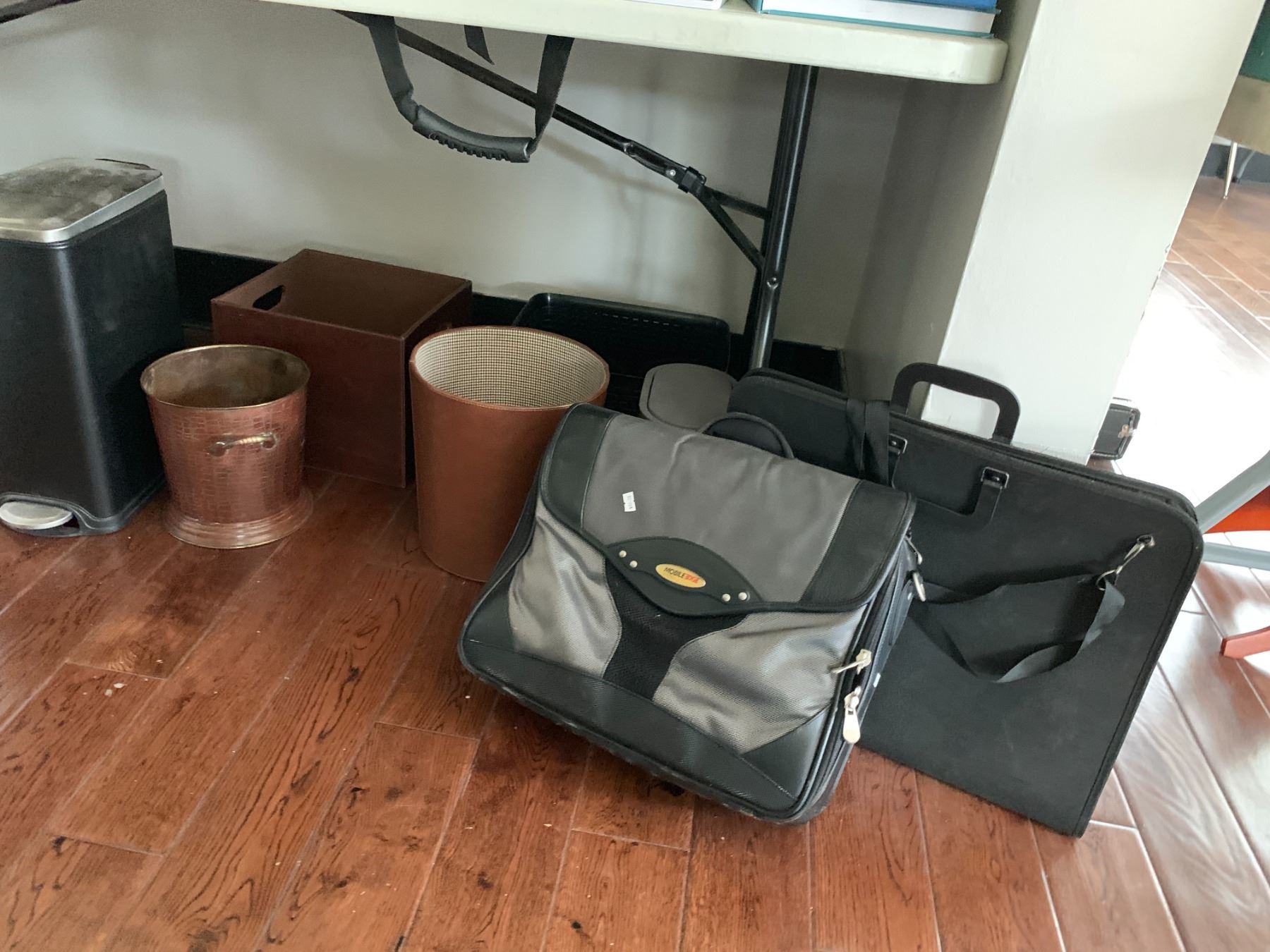 ASSORTED ITEMS INCLUDING; BINDERS, WASTE BINS, LAPTOP BAG & MORE (TABLE NOT INCLUDED)