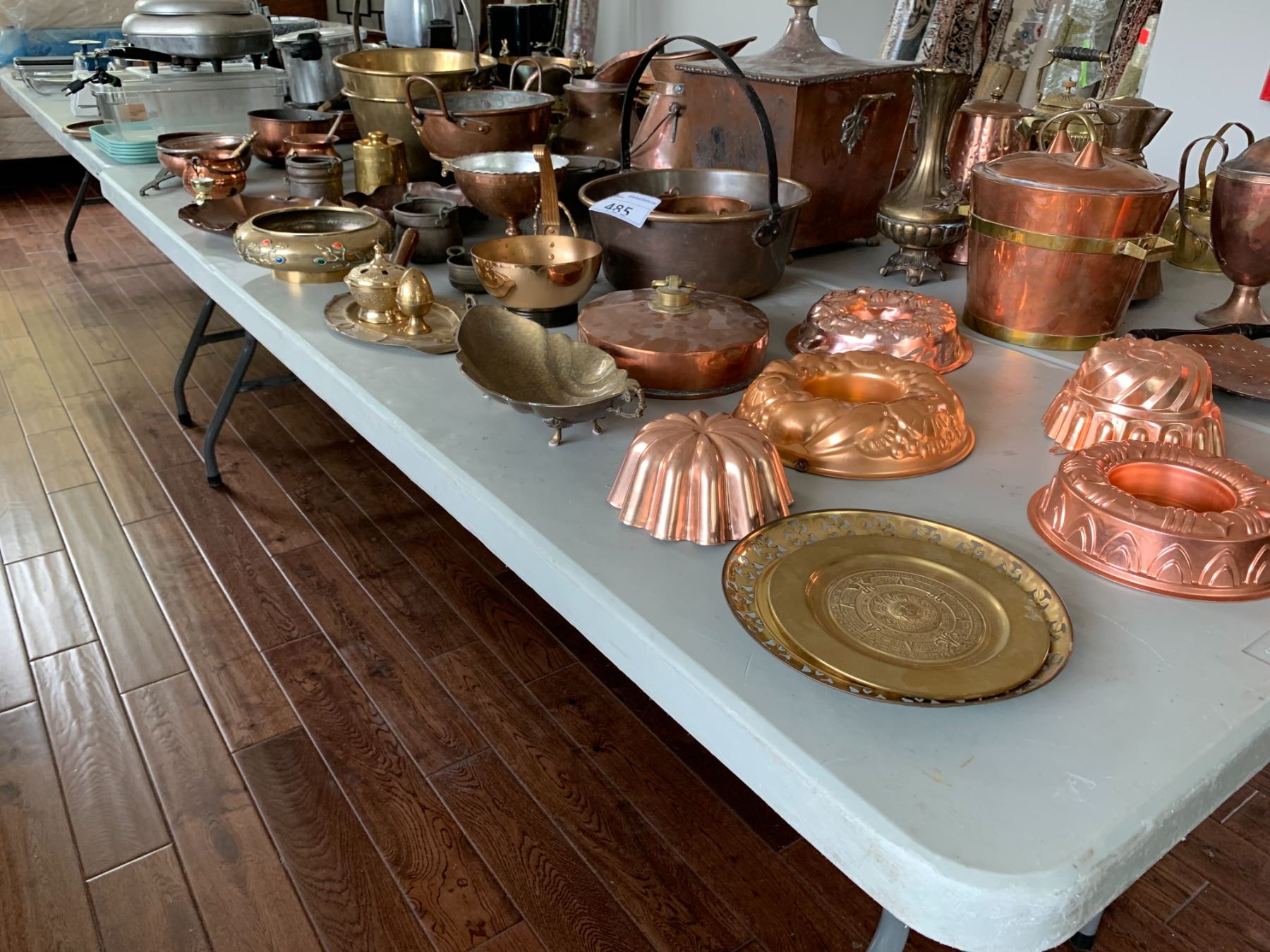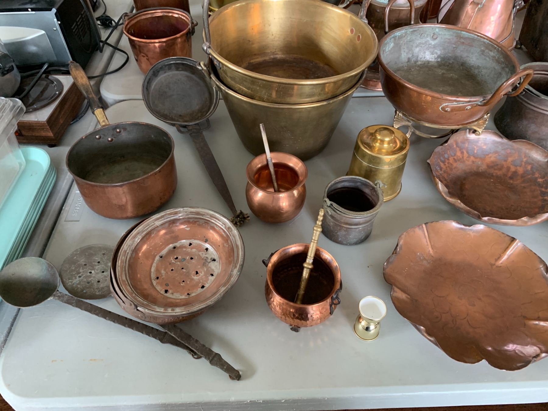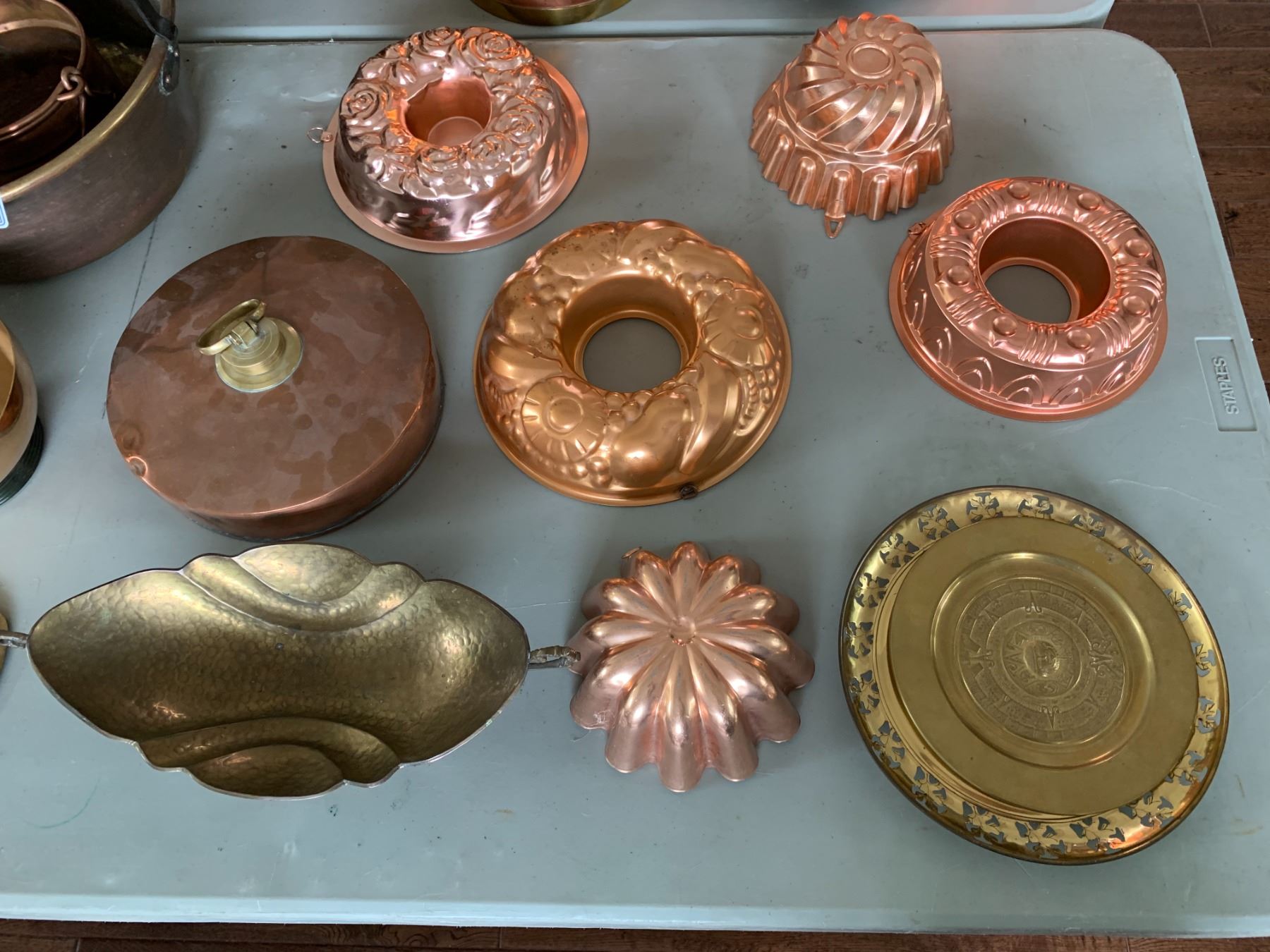 ASSORTED ITEMS INCLUDING; CAKE MOLDS, COPPER DISHES, EGG DISH & MORE (TABLE NOT INCLUDED)