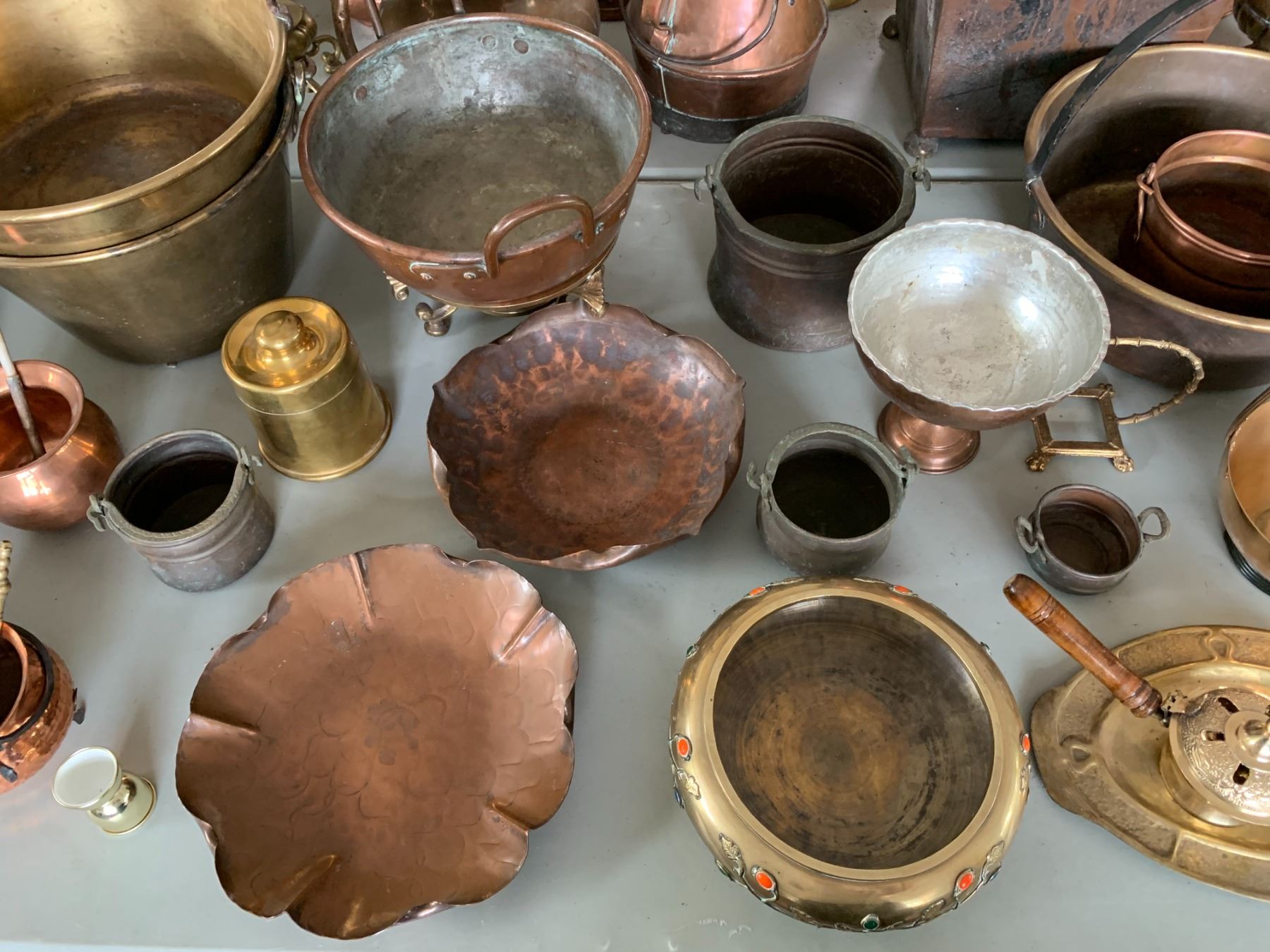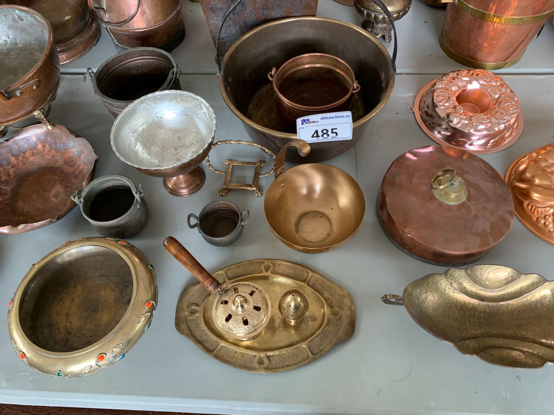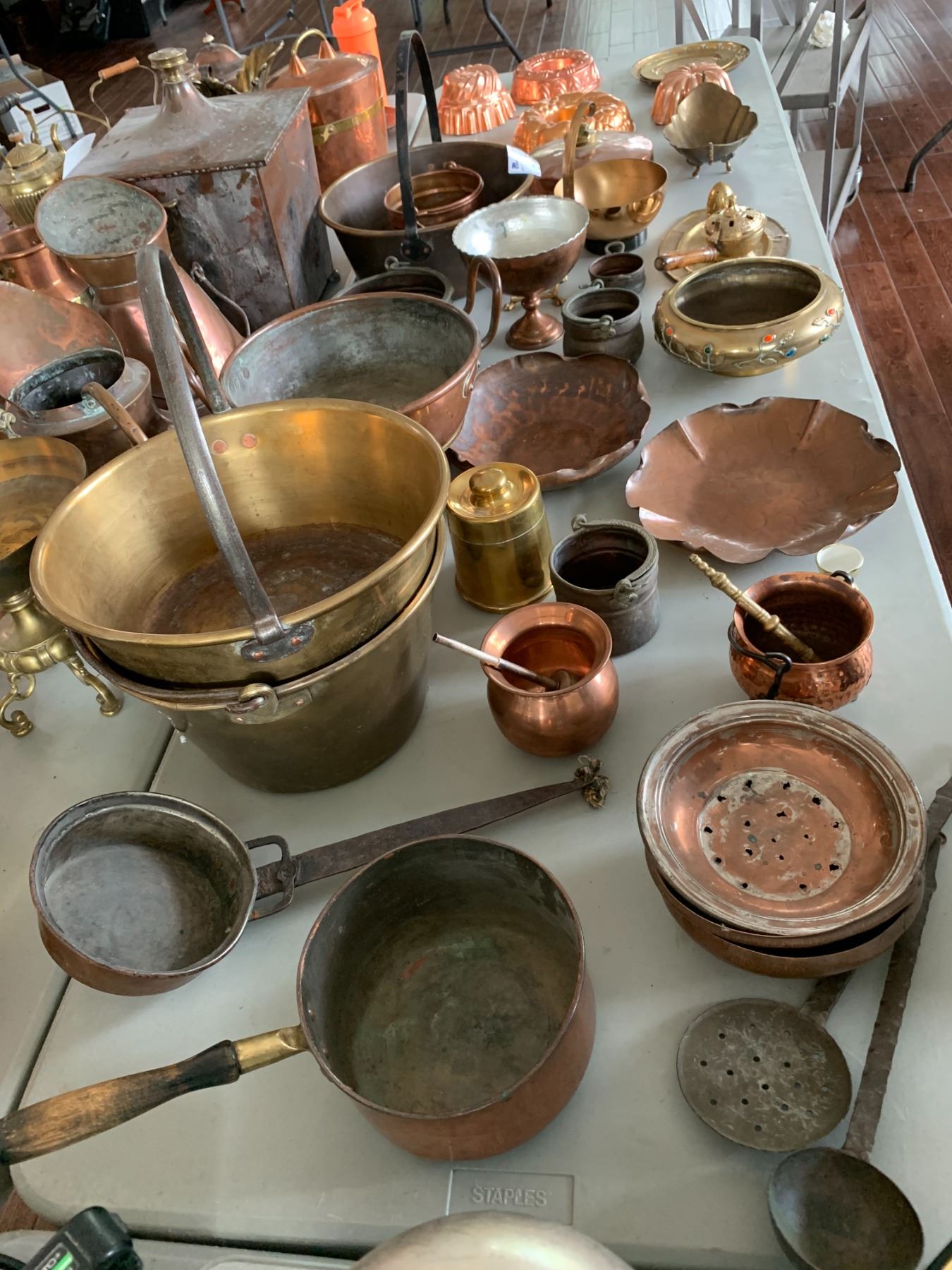 ASSORTED ITEMS INCLUDING; CAKE MOLDS, COPPER DISHES, EGG DISH & MORE (TABLE NOT INCLUDED)