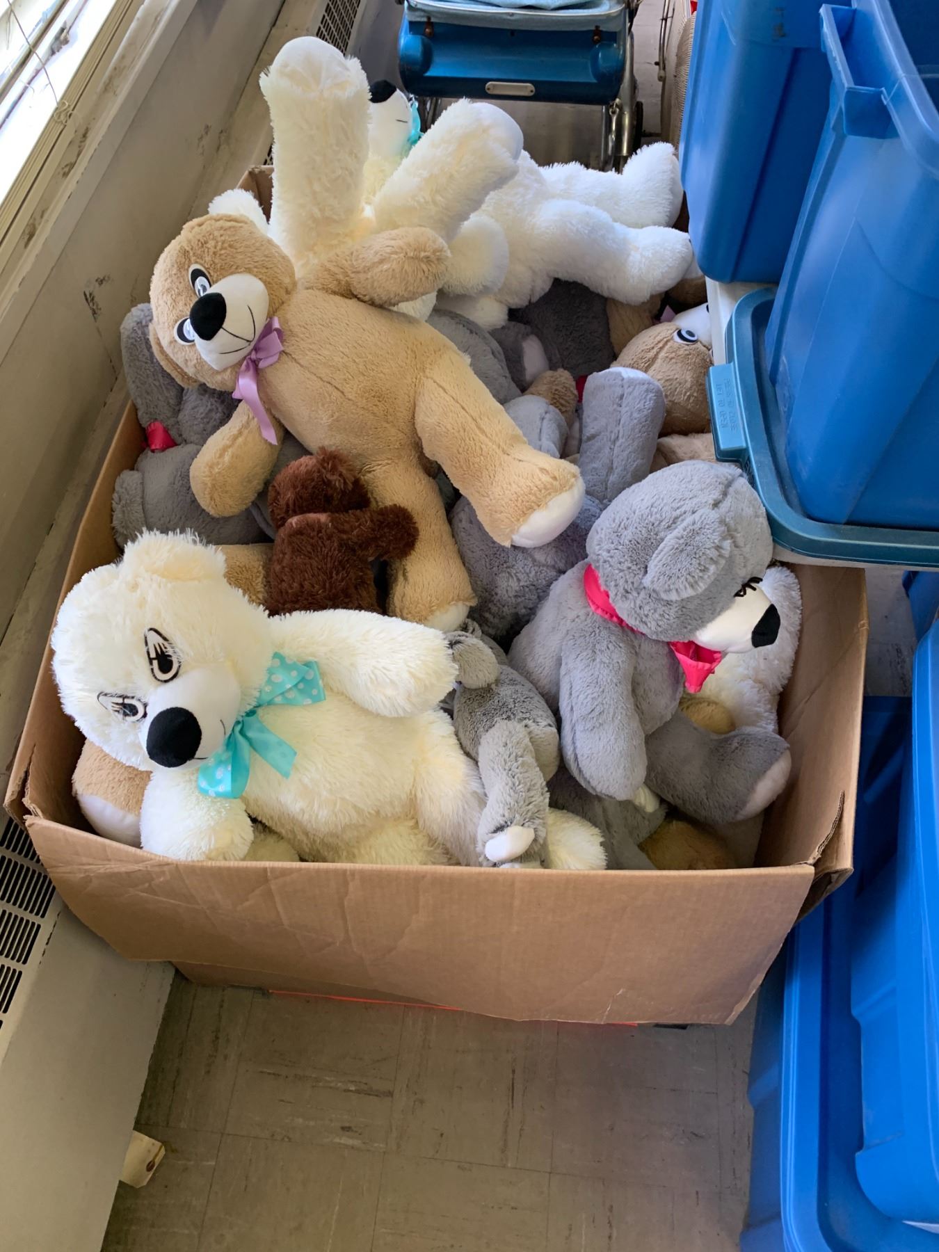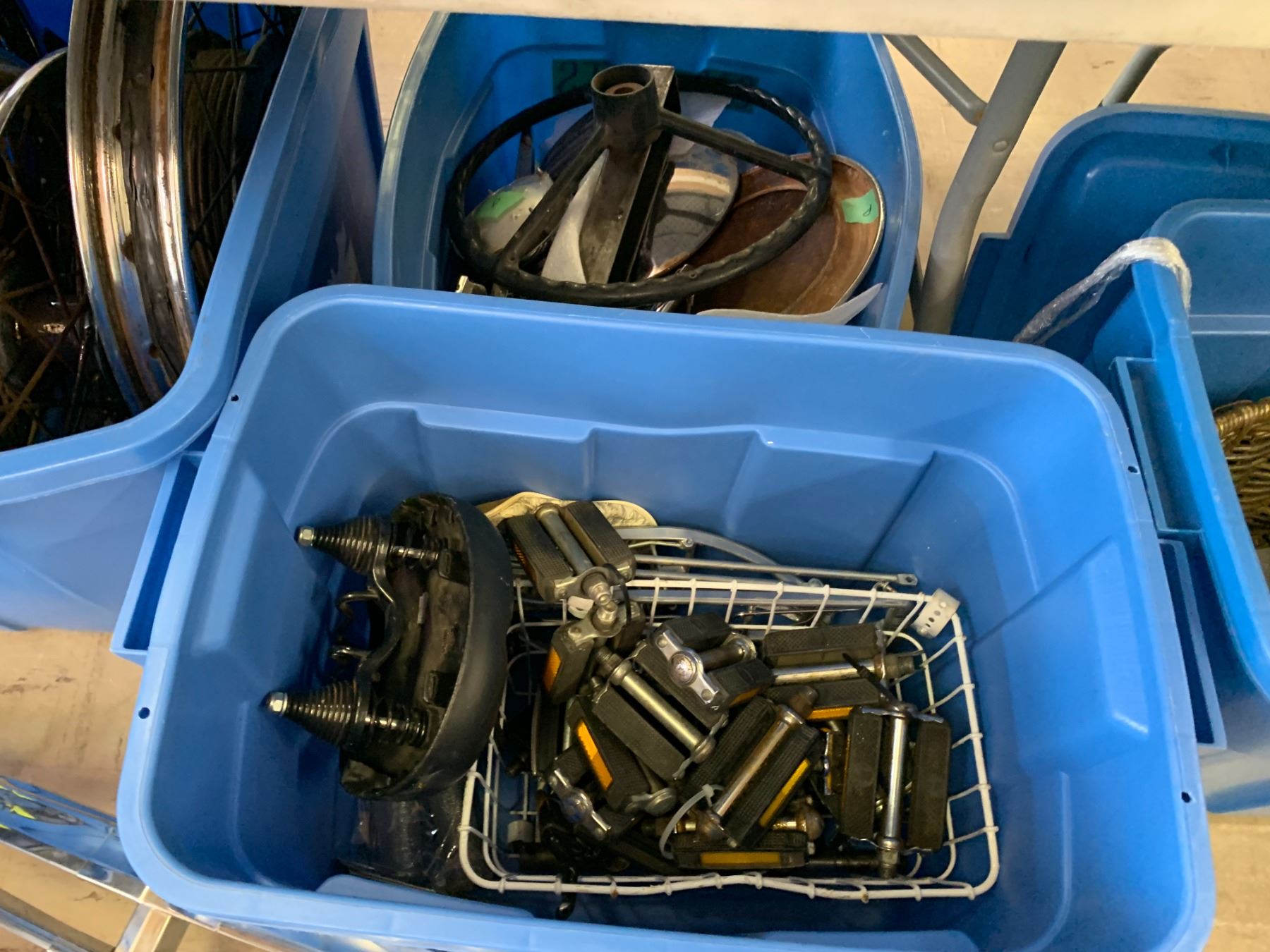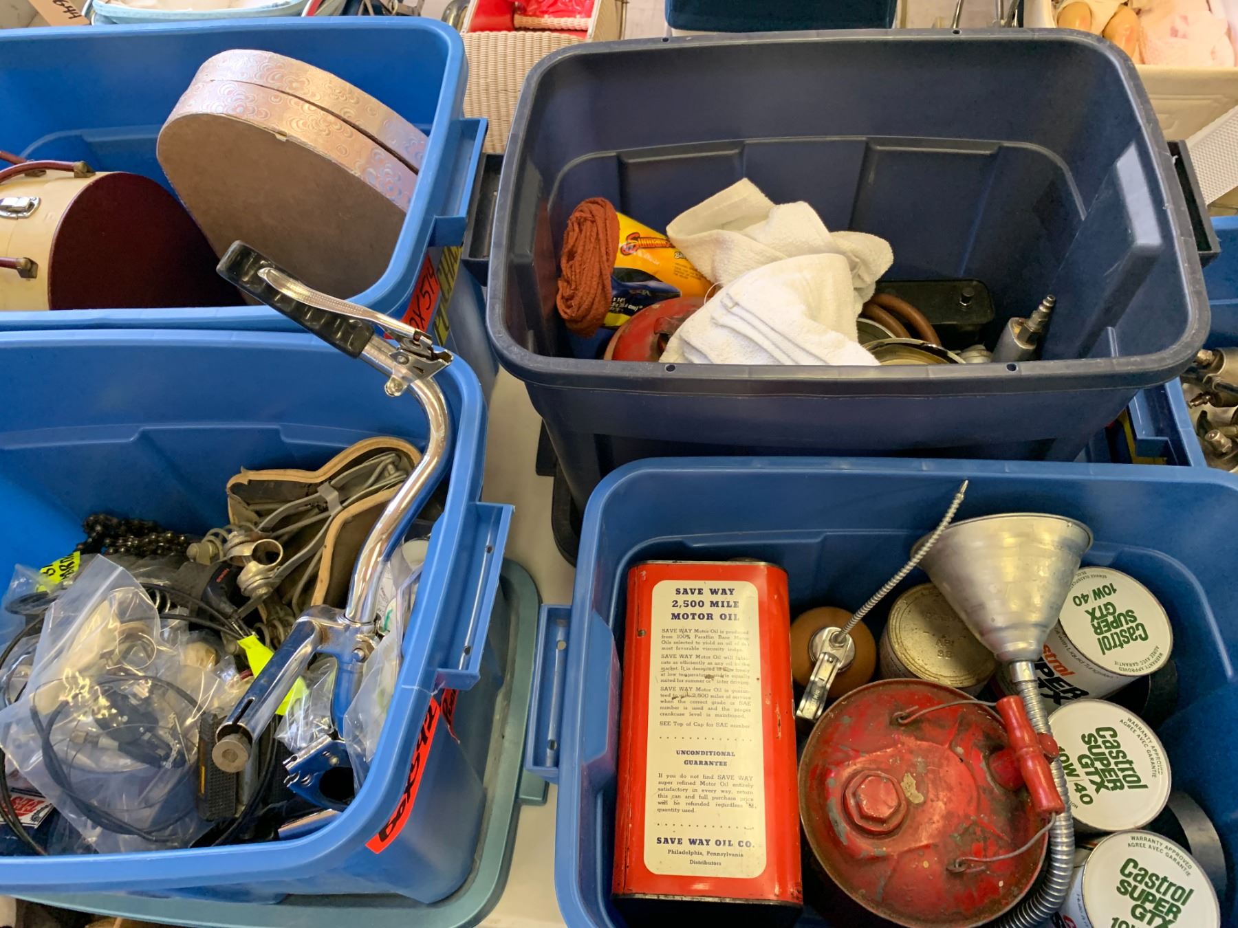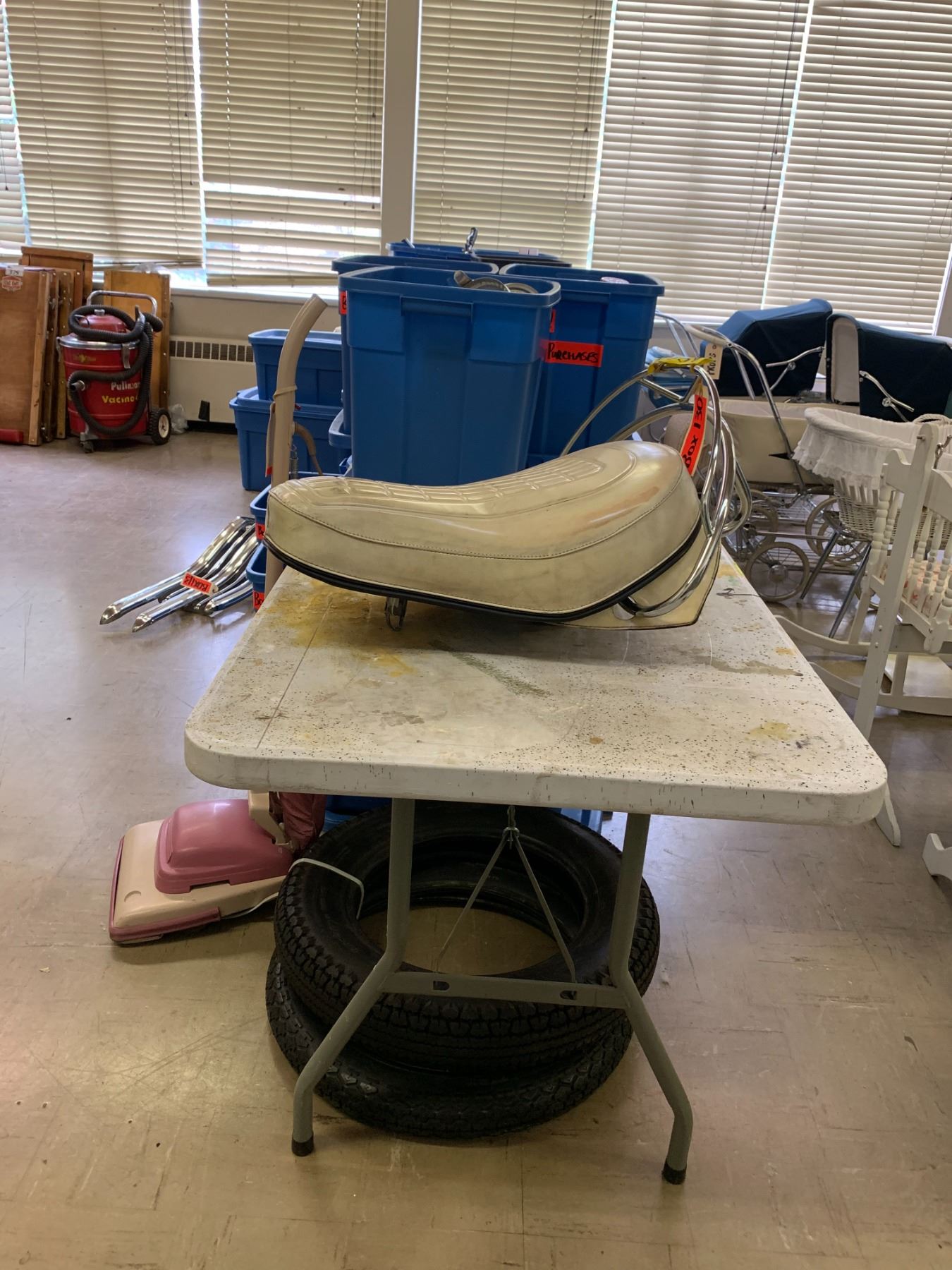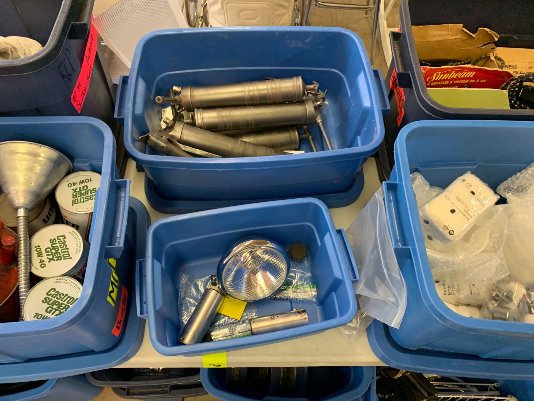 ASSORTED ITEMS INCLUDING; CAR PARTS, BICYCLE PARTS, BOX OF STUFFED BEARS, VACUUM, VINTAGE RADIO & MORE (TABLES NOT INCLUDED)
