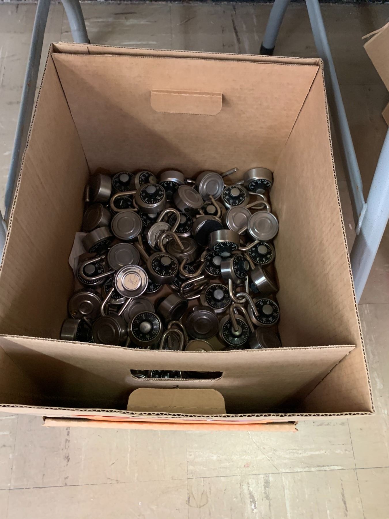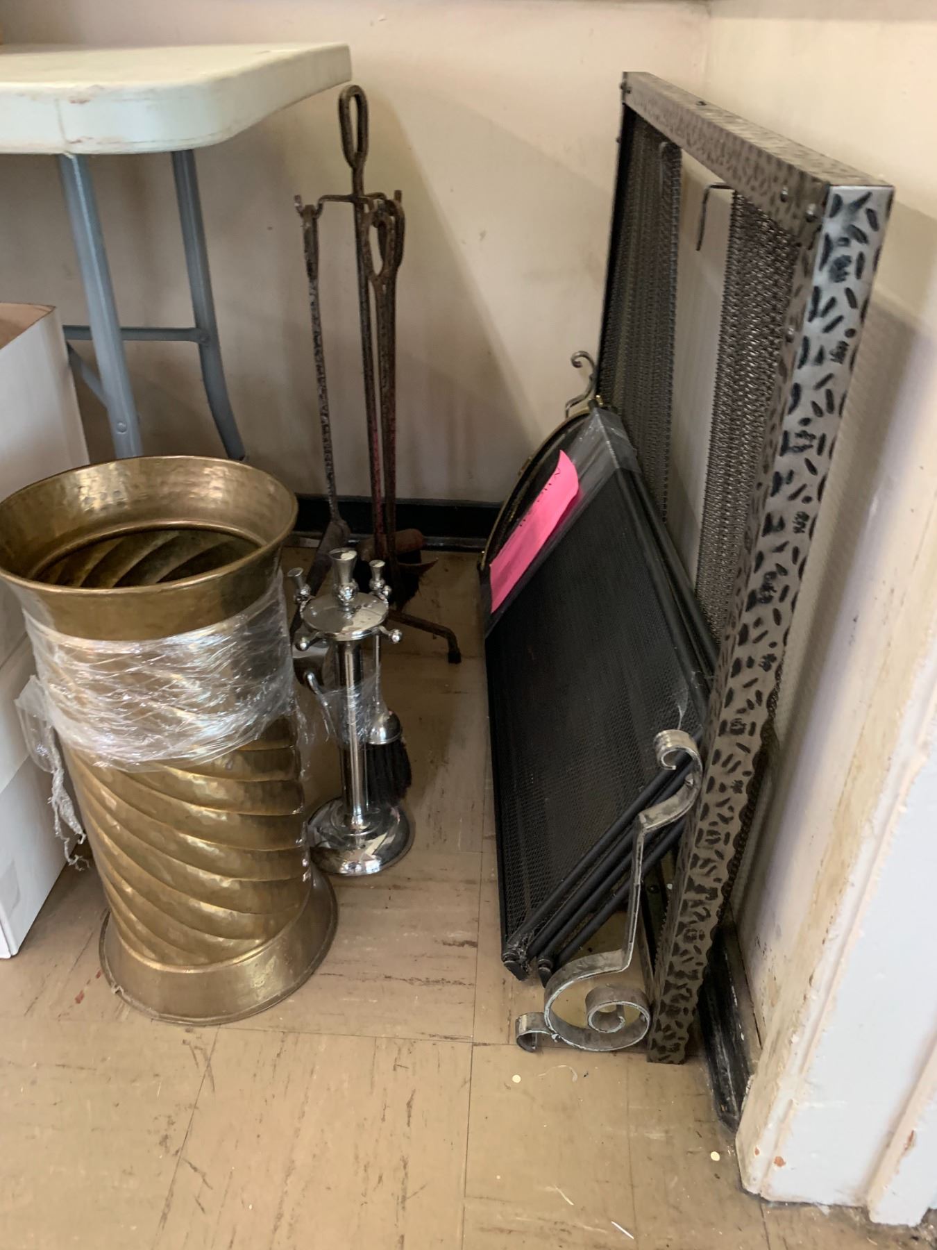 ASSORTED ITEMS INCLUDING; COMBINATION PAD LOCKS, GLASSWARE, FIREPLACE SET & MORE (TABLE NOT INCLUDED)