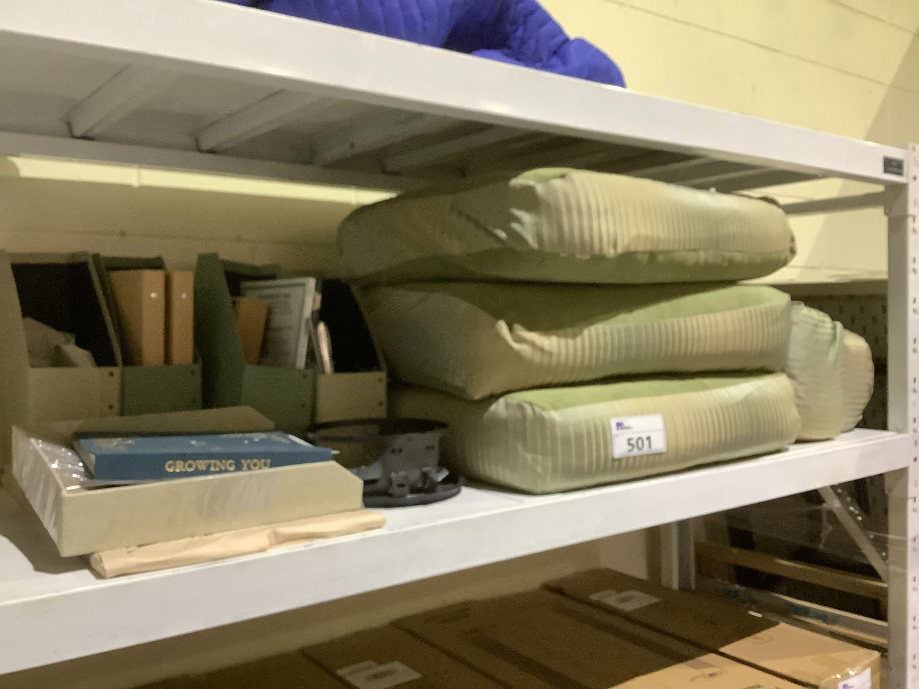 ASSORTED ITEMS INCLUDING; CUSHIONS, BINDER HOLDERS, FONDUE PARTS & MORE