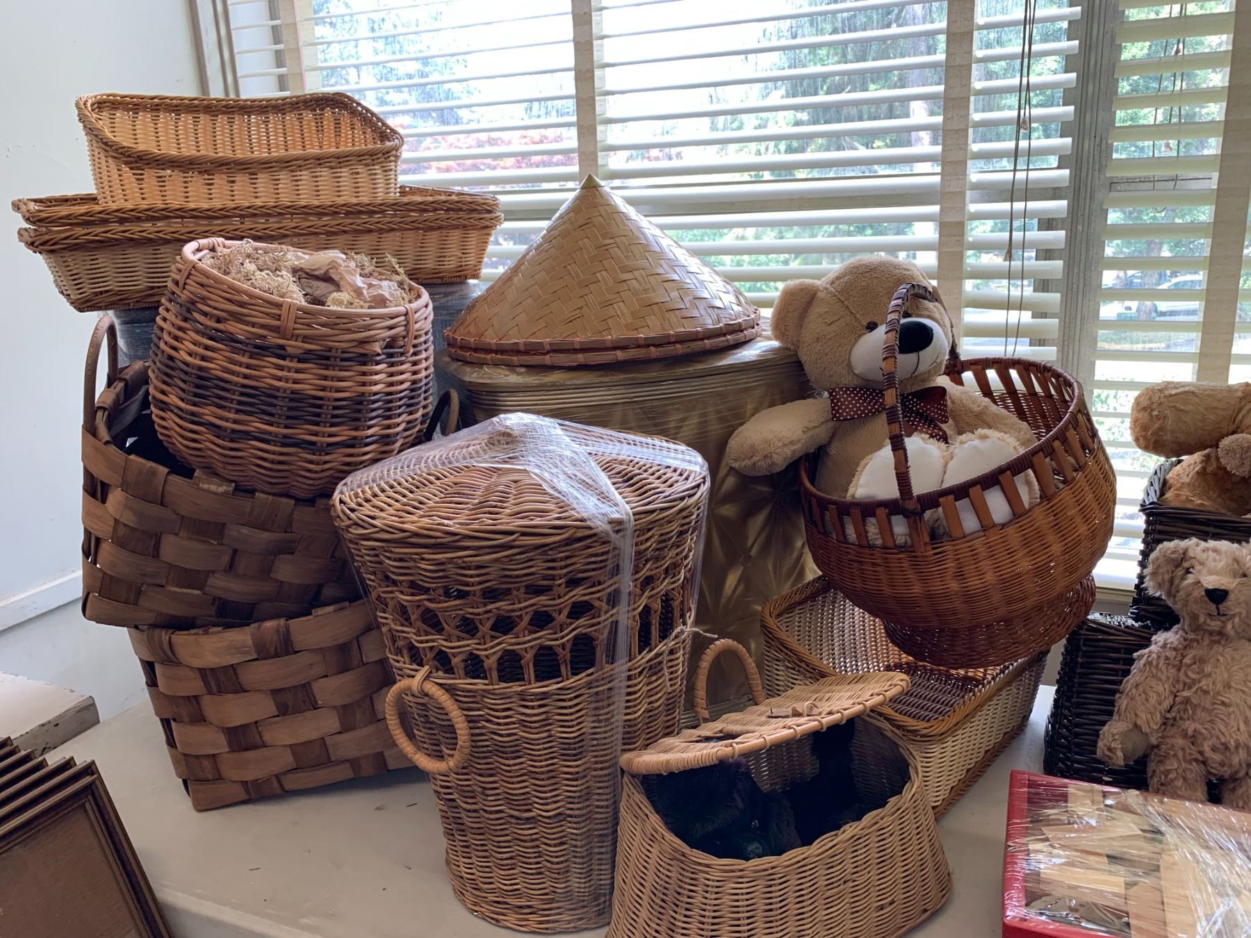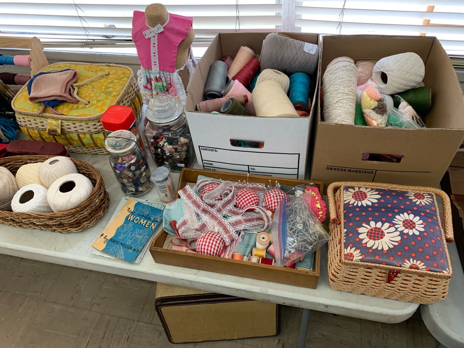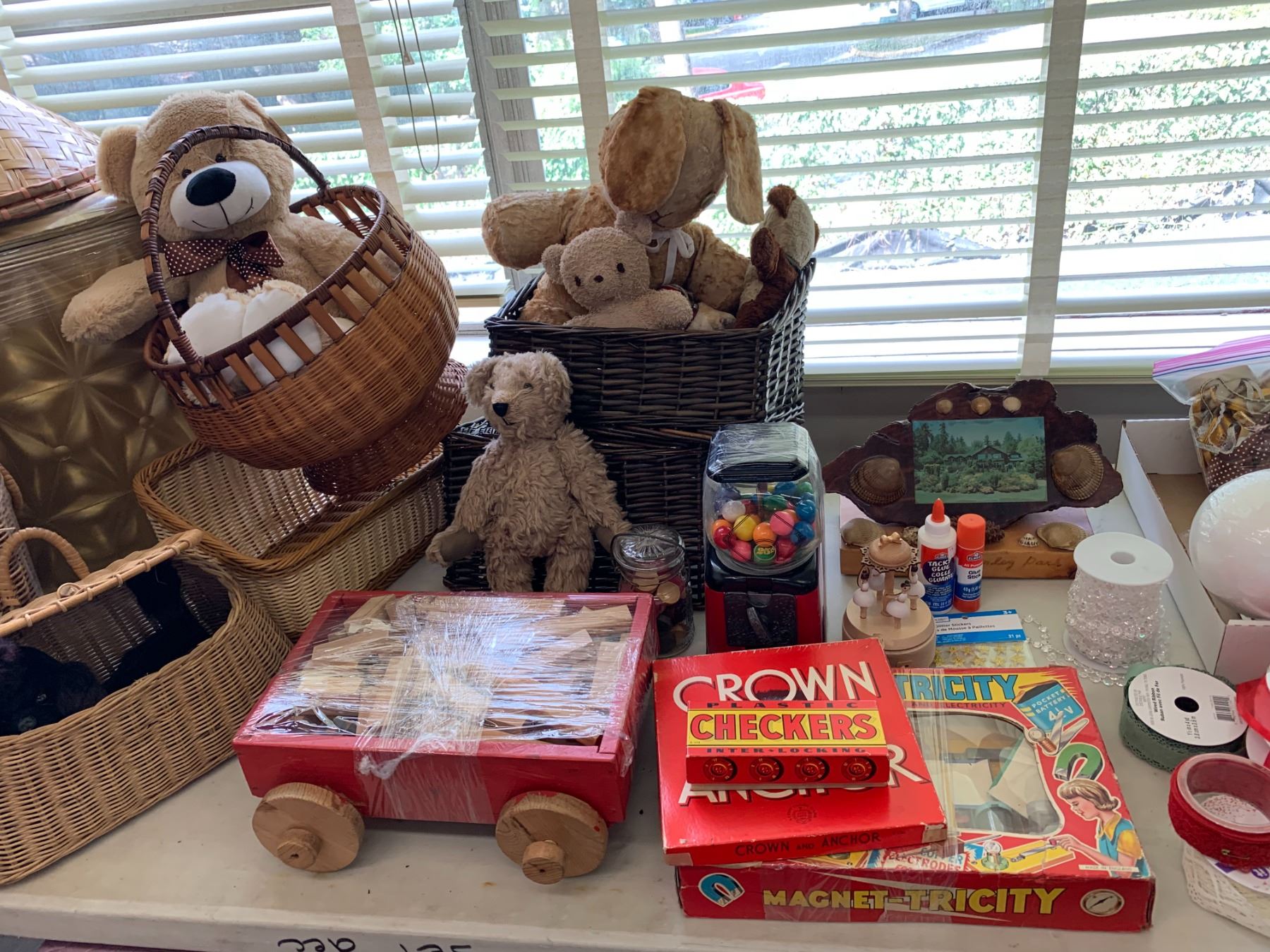 ASSORTED ITEMS INCLUDING; DESK TOP GUMBALL MACHINE, ASSORTED BASKETS, SEWING/KNITTING SUPPLIES, STUFFED ANIMALS & MORE (TABLES NOT INCLUDED)