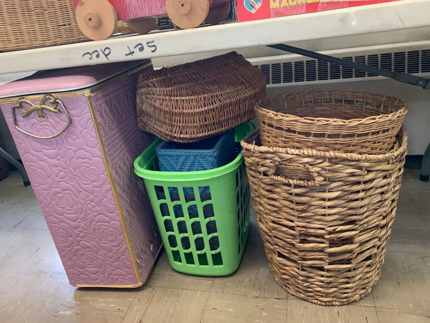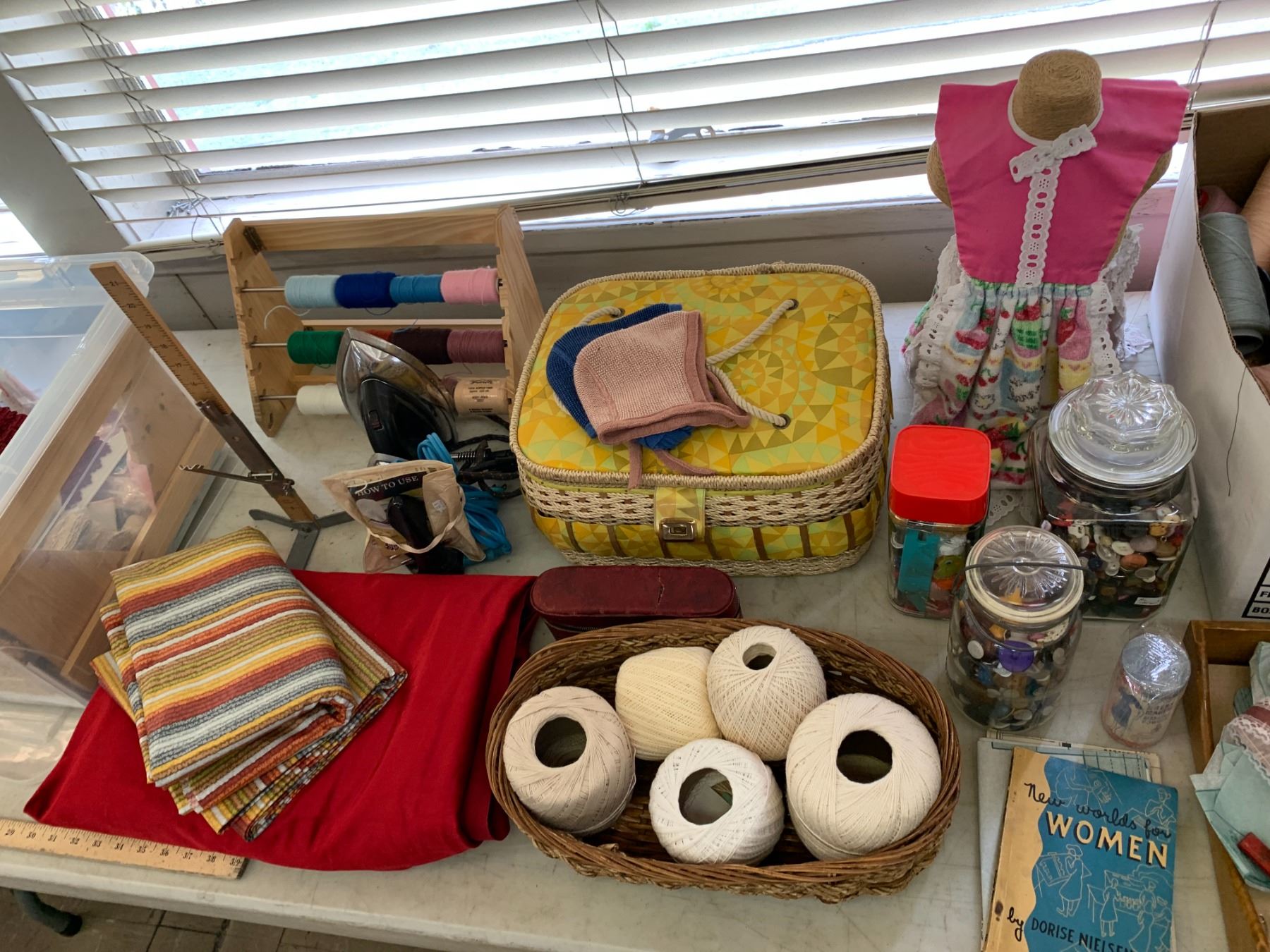 ASSORTED ITEMS INCLUDING; DESK TOP GUMBALL MACHINE, ASSORTED BASKETS, SEWING/KNITTING SUPPLIES, S...