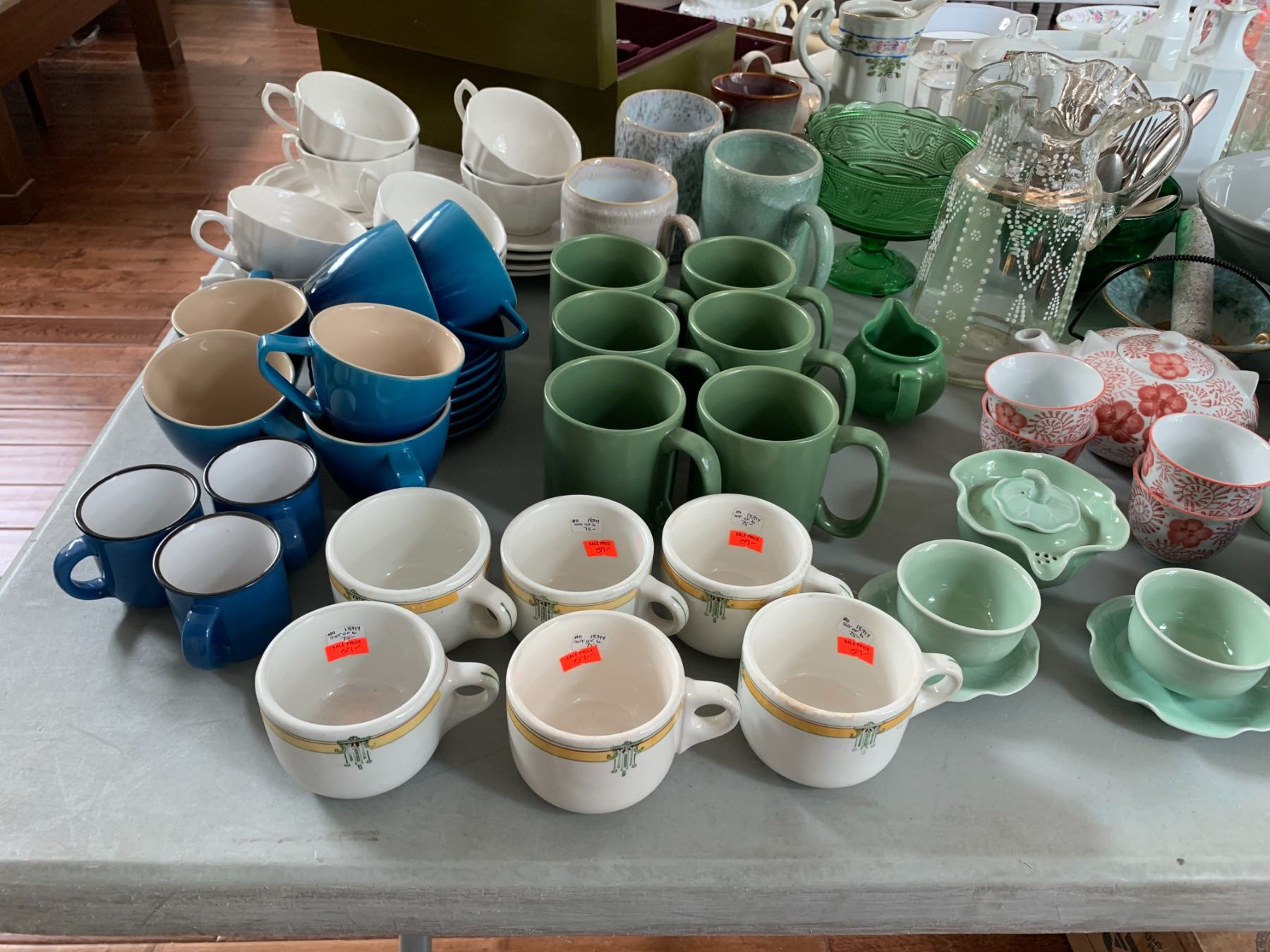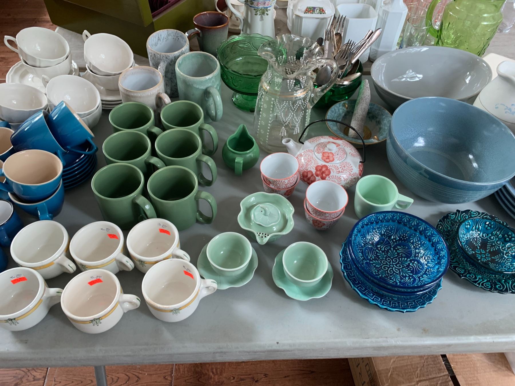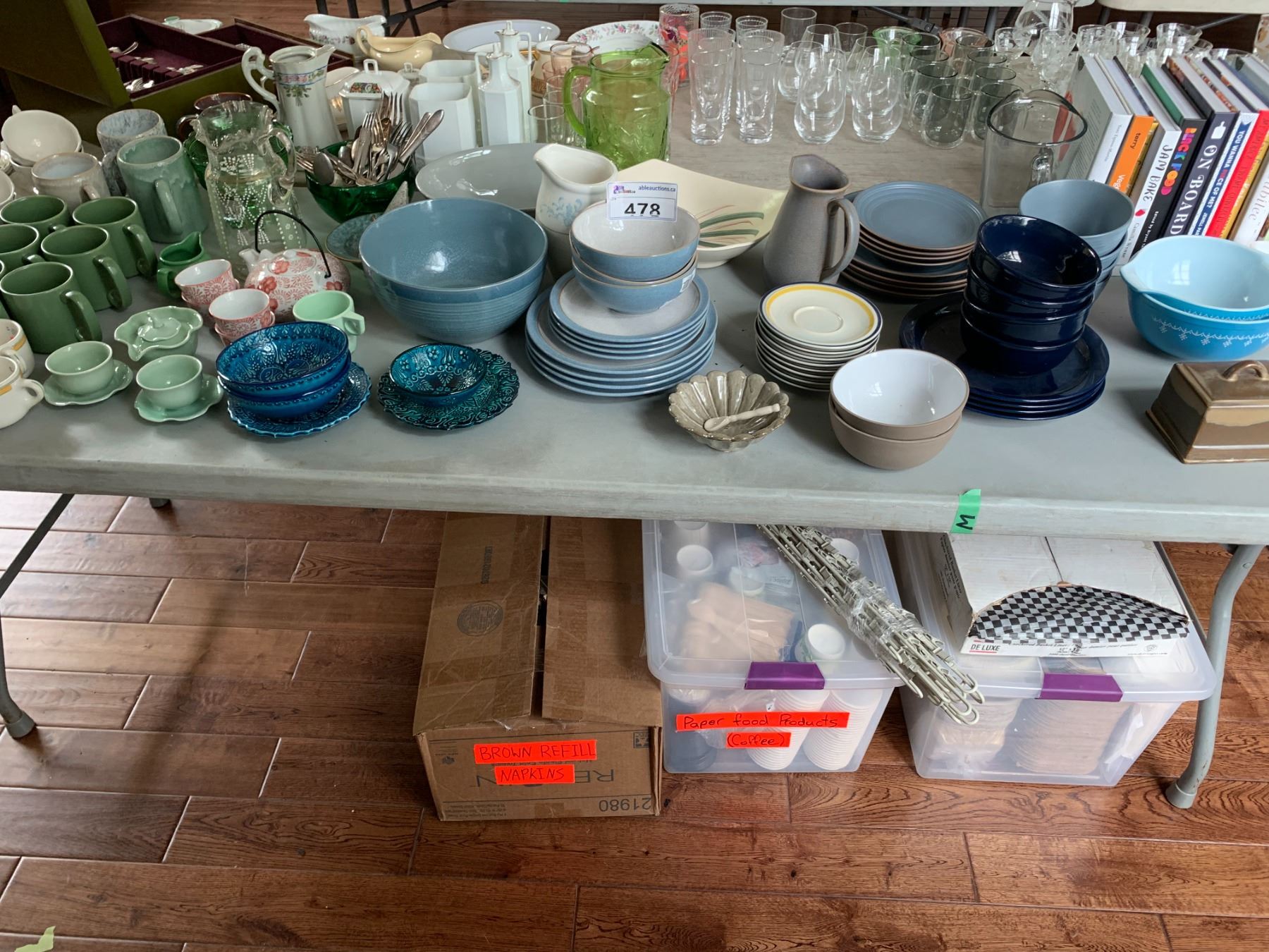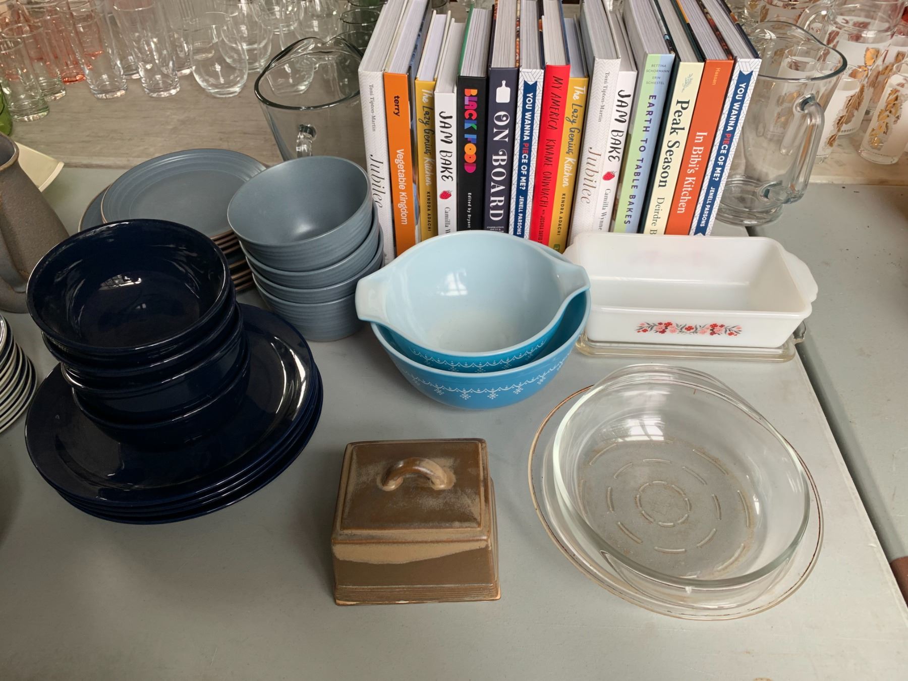 ASSORTED ITEMS INCLUDING; DISHWARE, BOOKS, PAPER FOOD PRODUCTS & MORE (TABLE NOT INCLUDED)