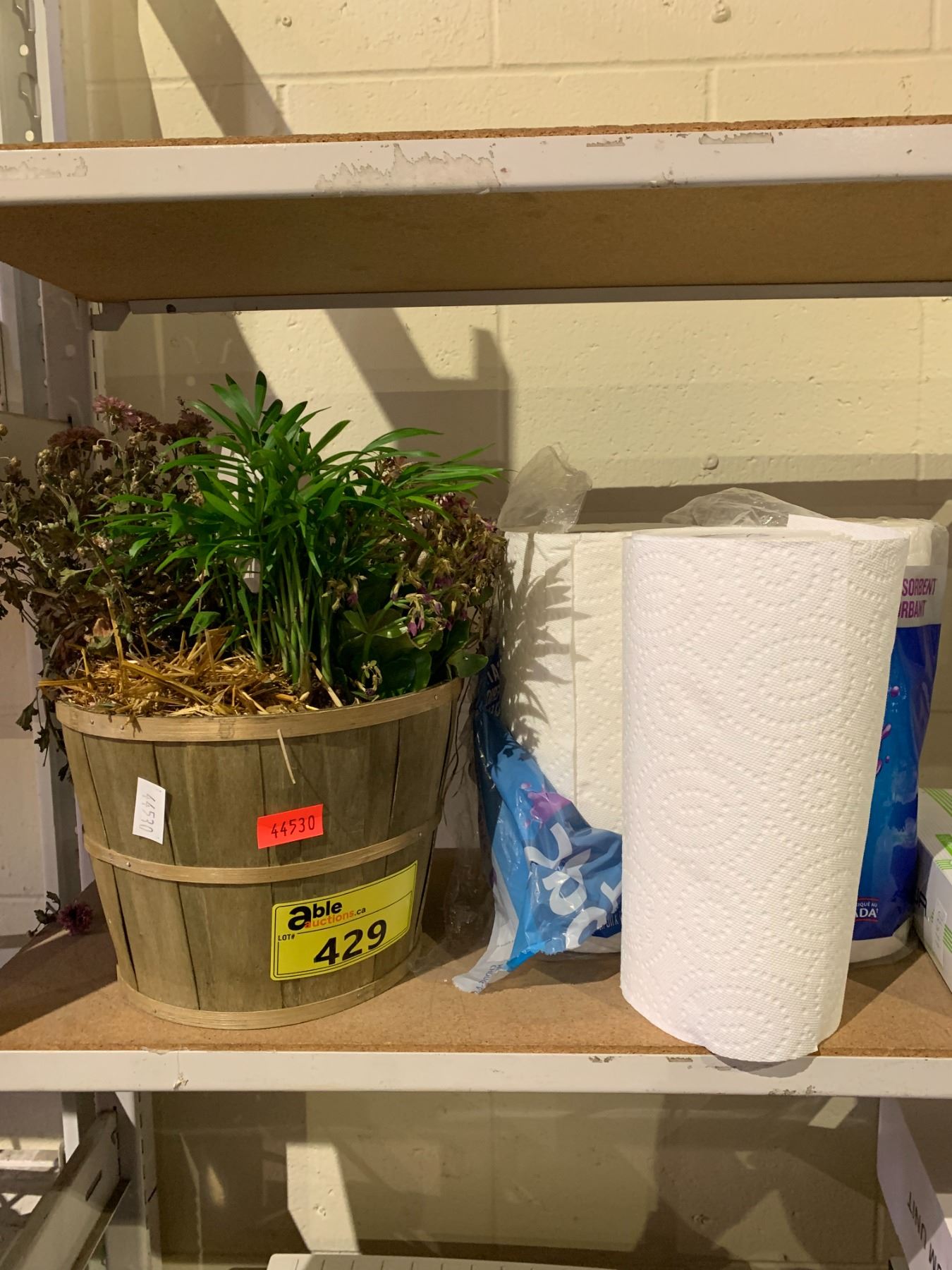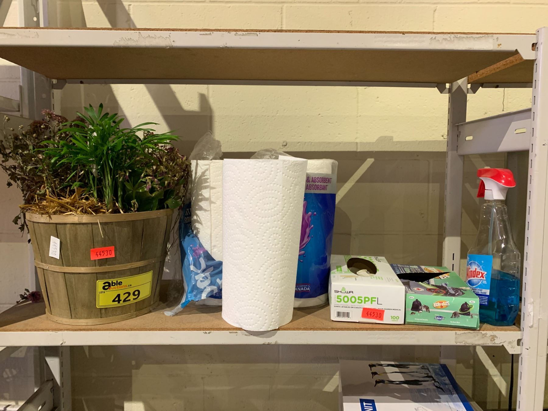 ASSORTED ITEMS INCLUDING; FAUX PLANT, PAPER TOWEL, DISPOSABLE GLOVES & MORE