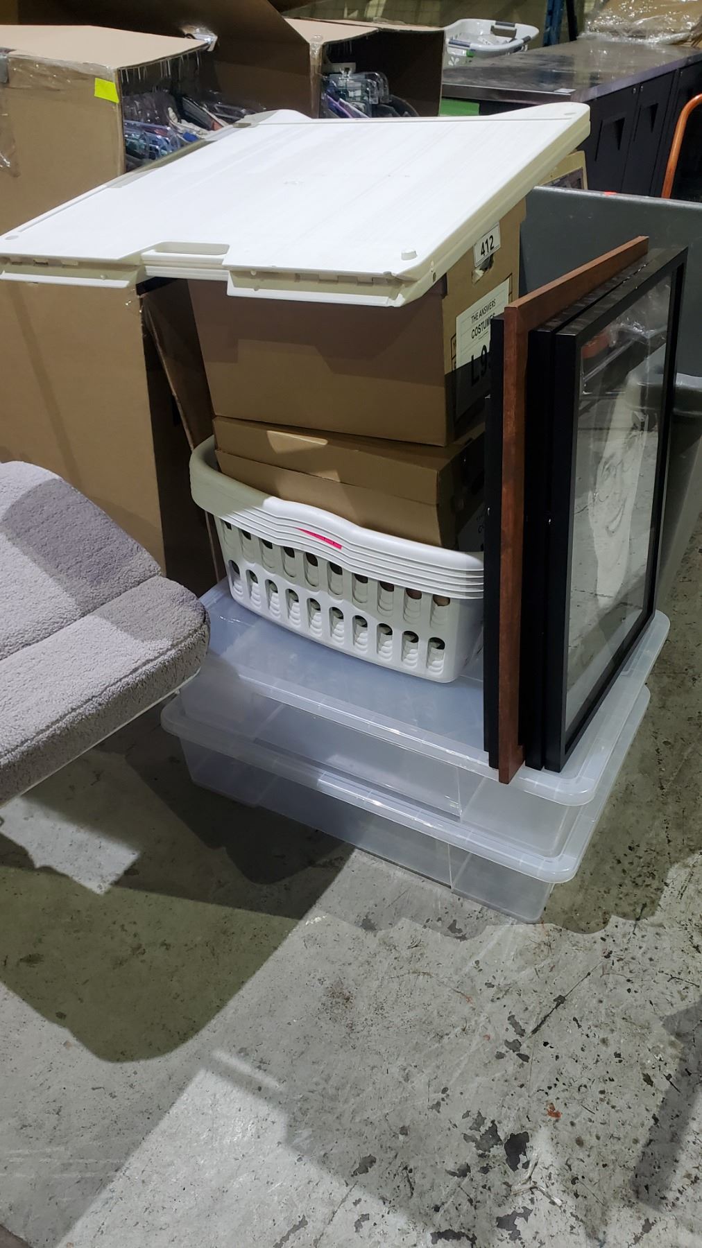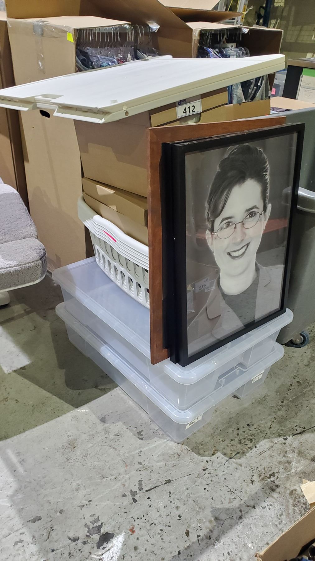 ASSORTED ITEMS INCLUDING; FRAMED HEADSHOTS, LAUNDRY BASKETS TOTES & MORE