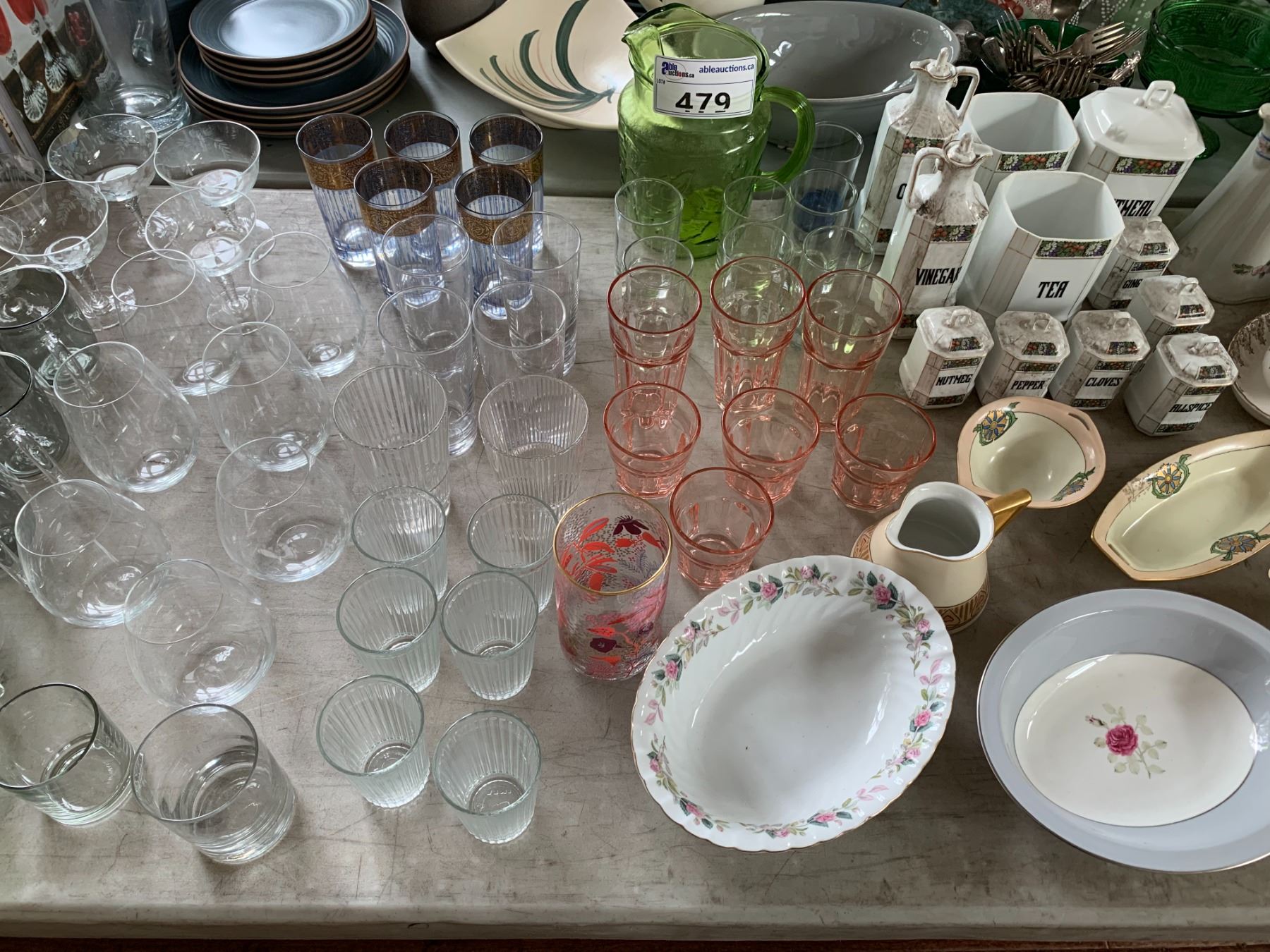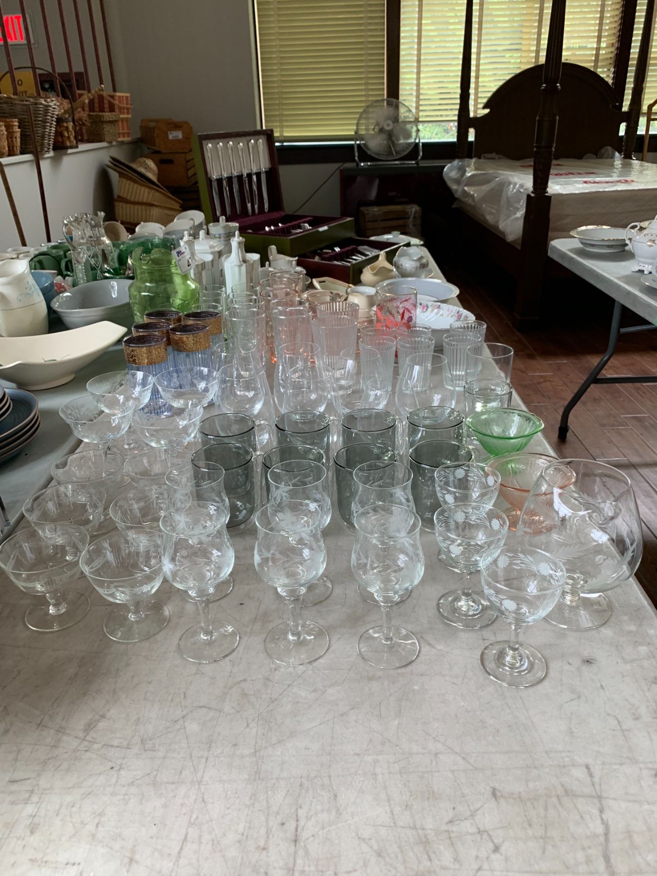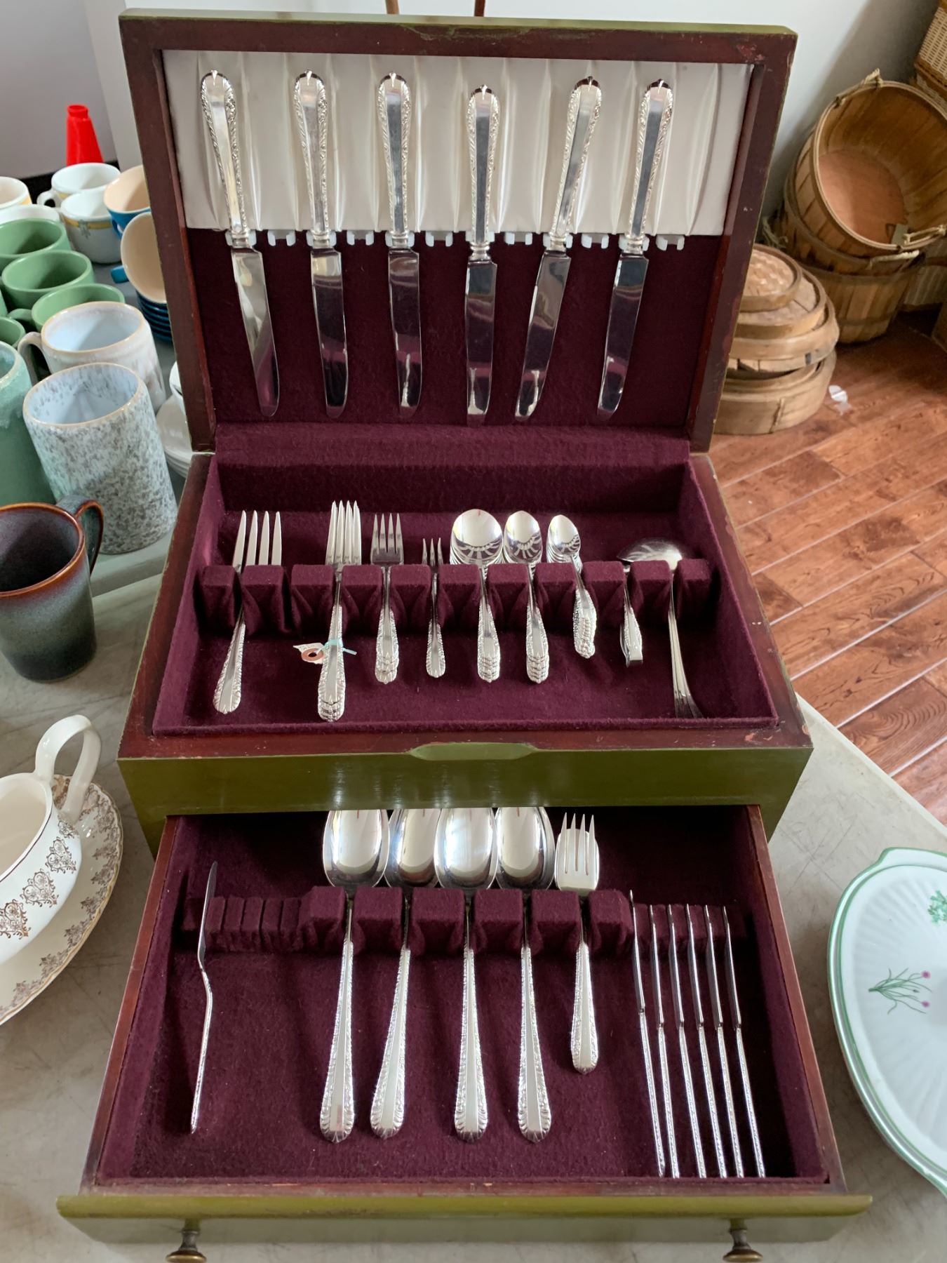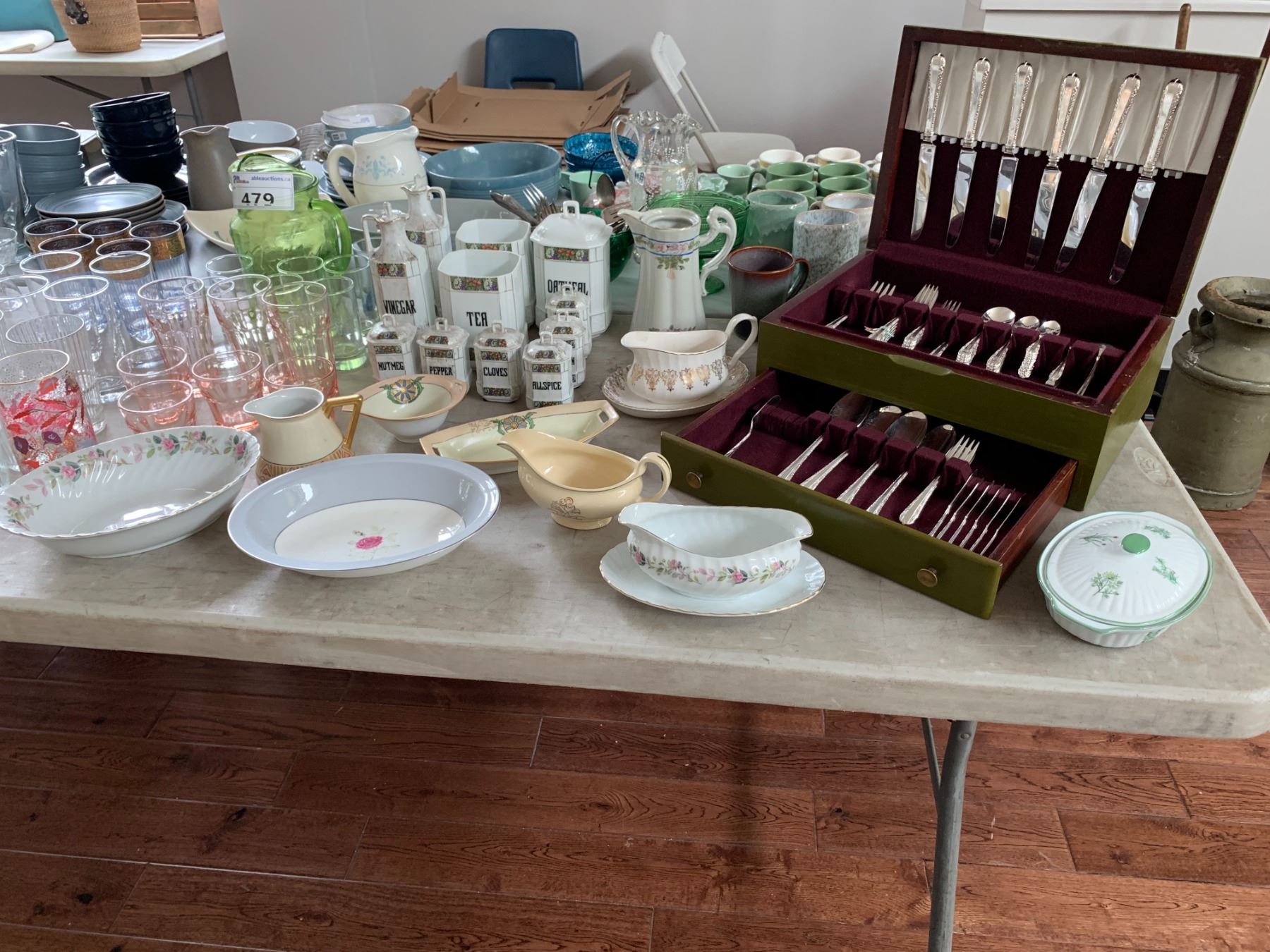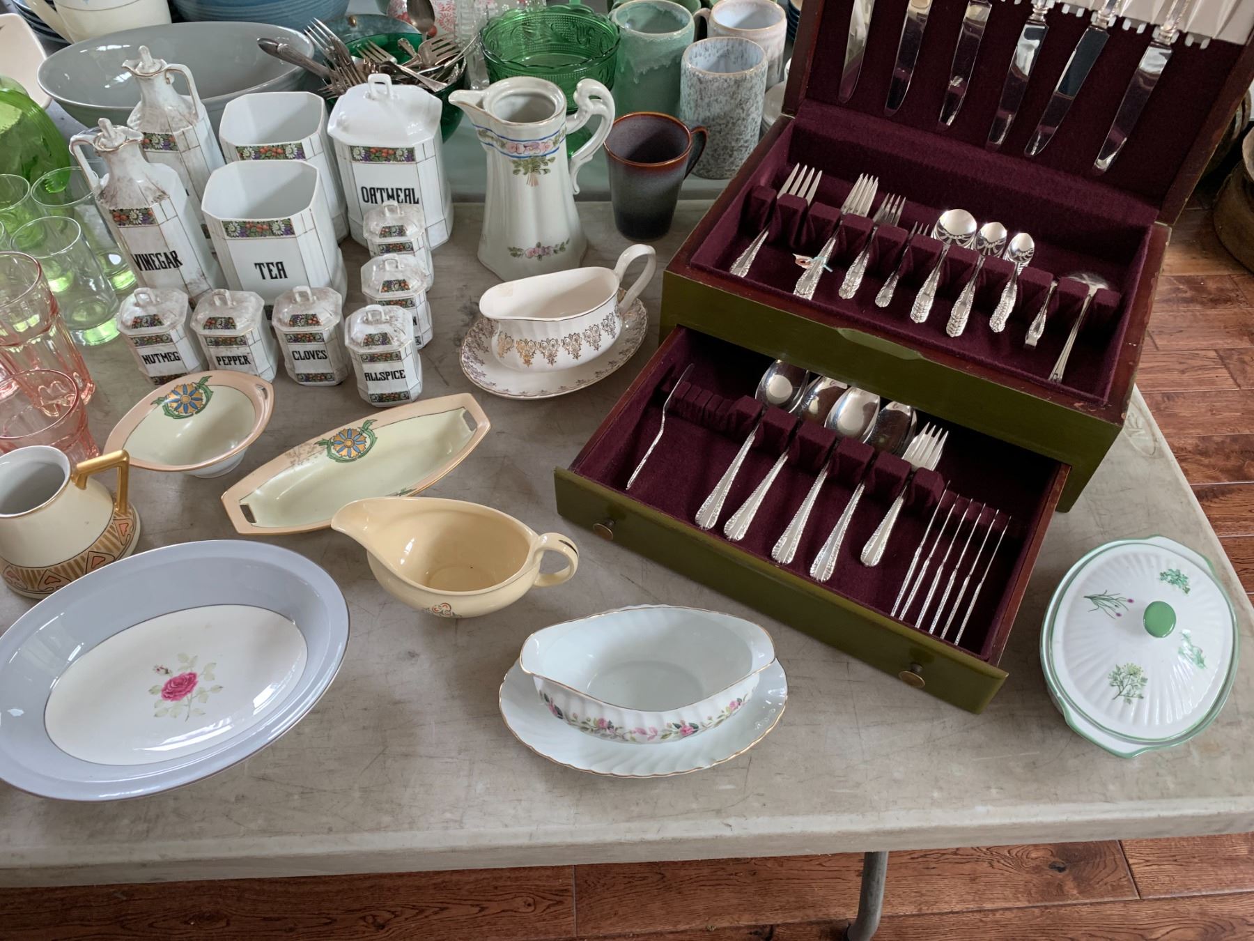 ASSORTED ITEMS INCLUDING; GLASSWARE, SILVER PLATED FLATWARE SET, GRAVY BOATS & MORE (TABLE NOT INCLUDED)