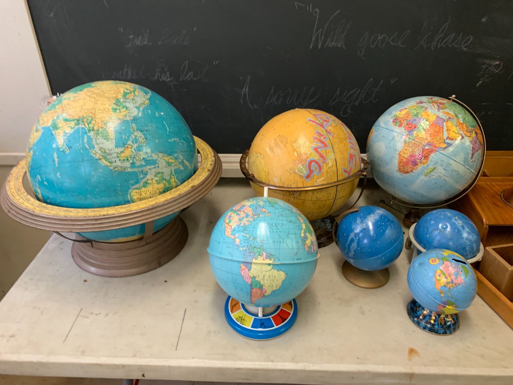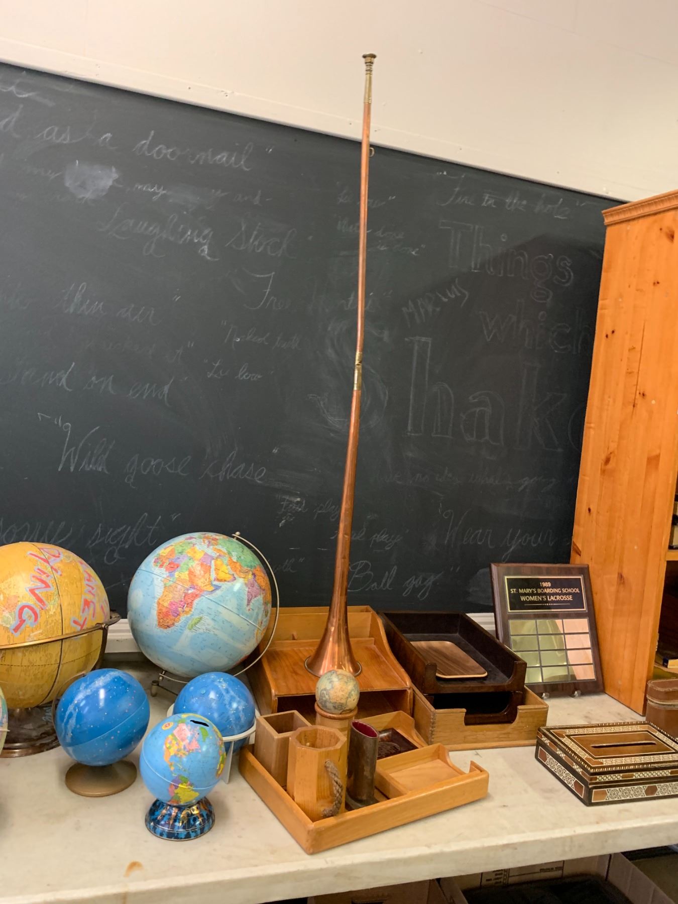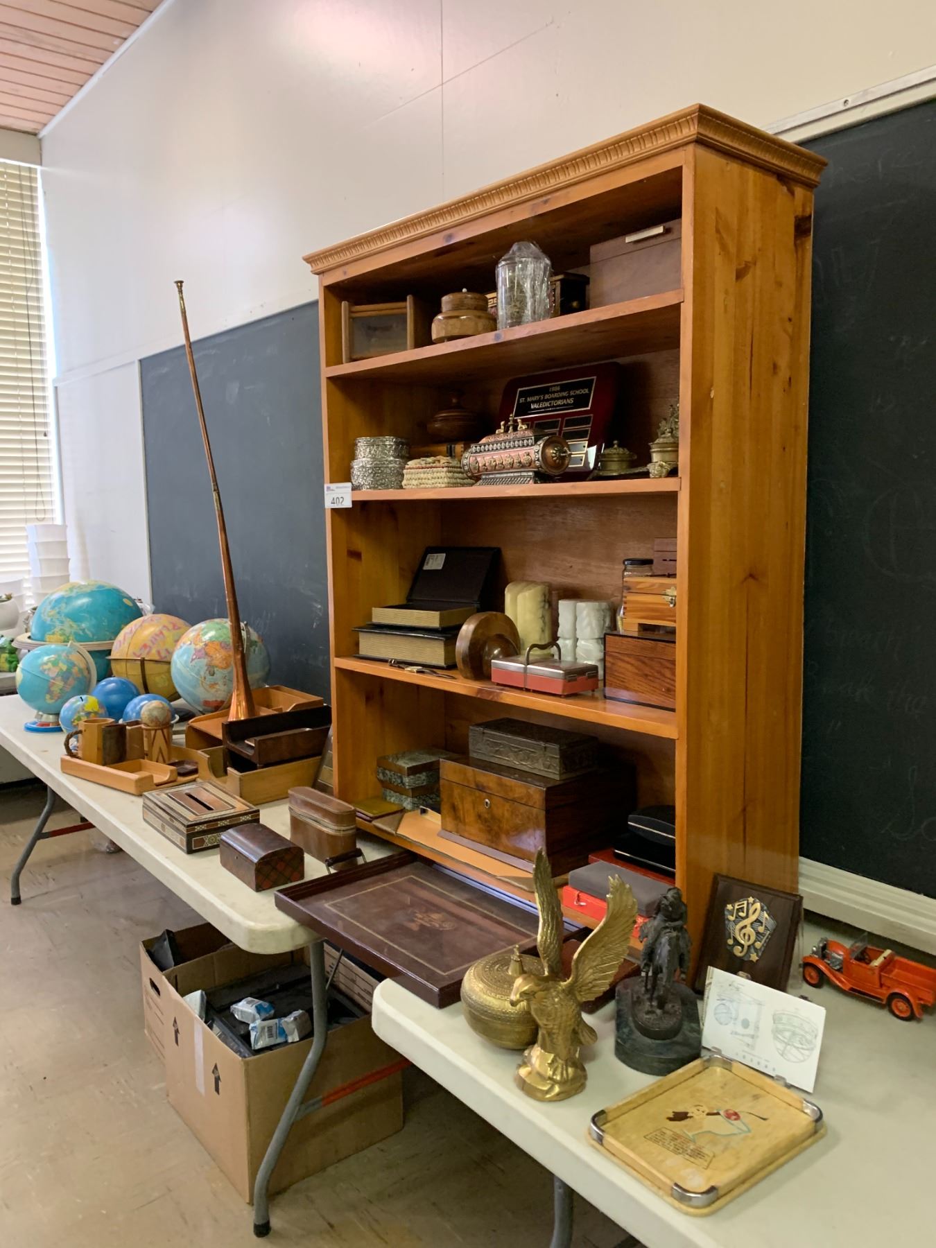 ASSORTED ITEMS INCLUDING; GLOBES, LOCKBOXES, PLAQUES, DESK TOP ACCENTS & MORE (TABLE NOT INCLUDED)