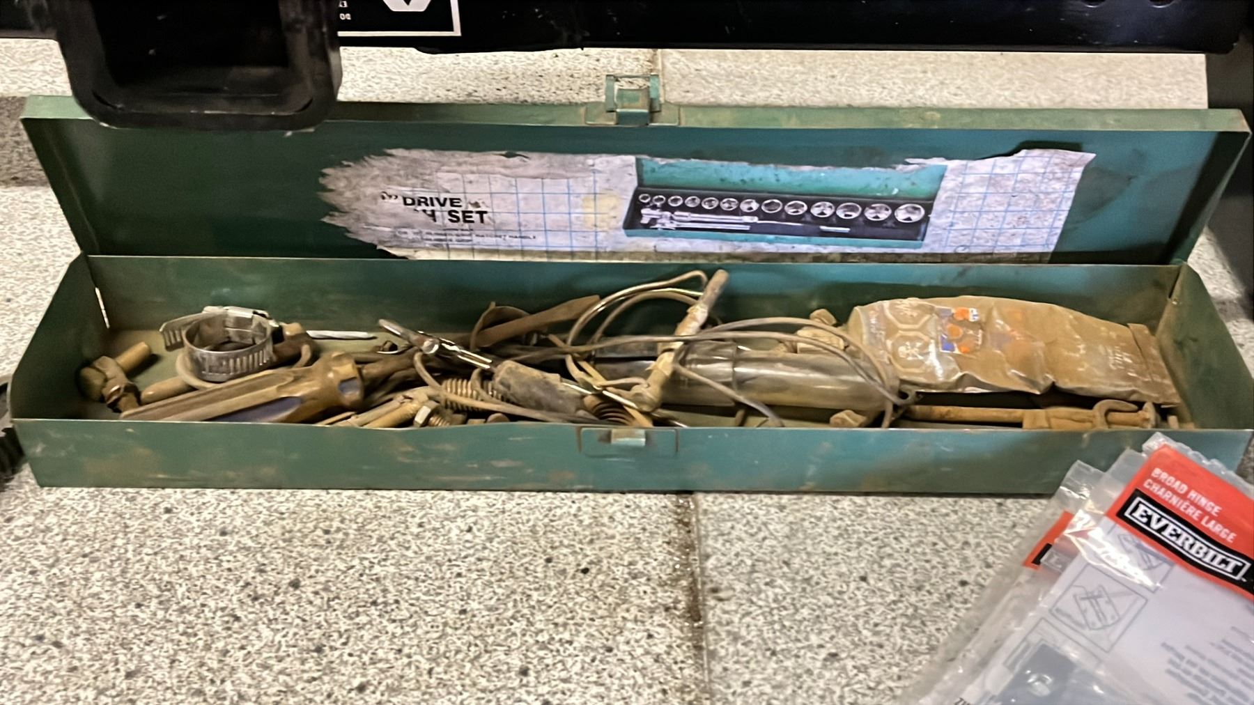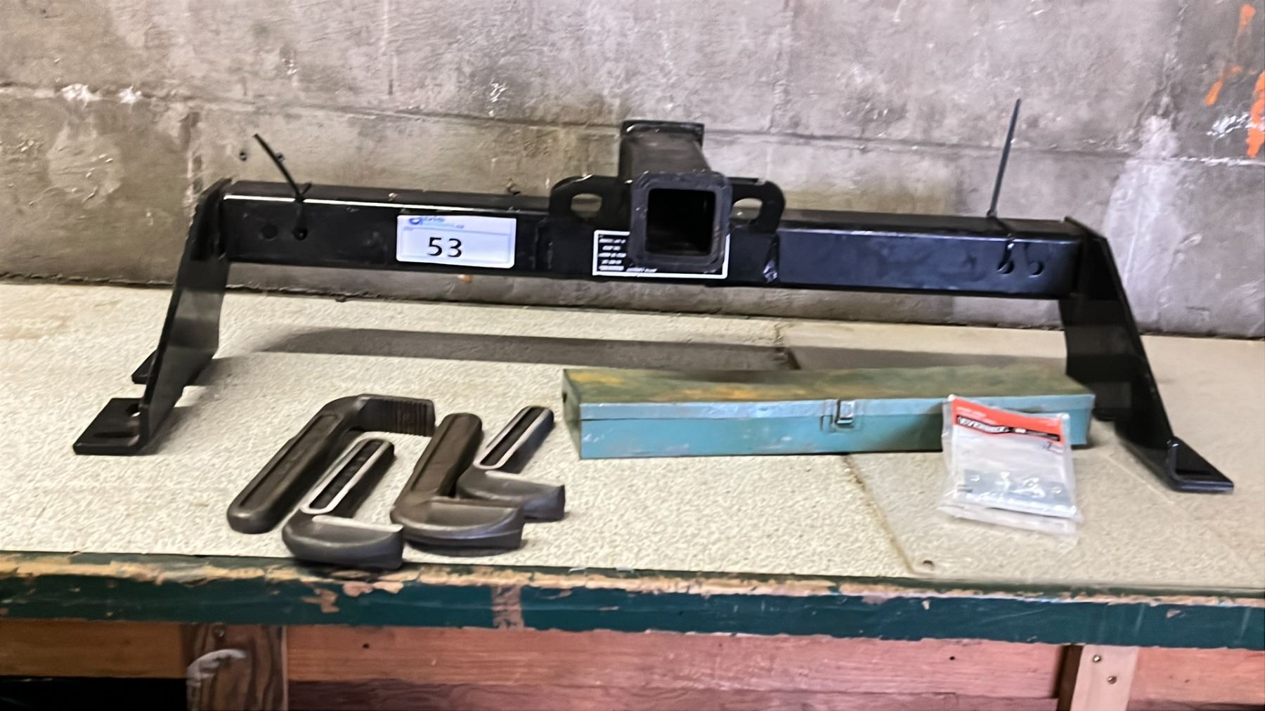 ASSORTED ITEMS INCLUDING; HEAVY DUTY HITCH ATTACHMENT, BROAD HINGES, JACK STAND ADJUSTERS & MORE