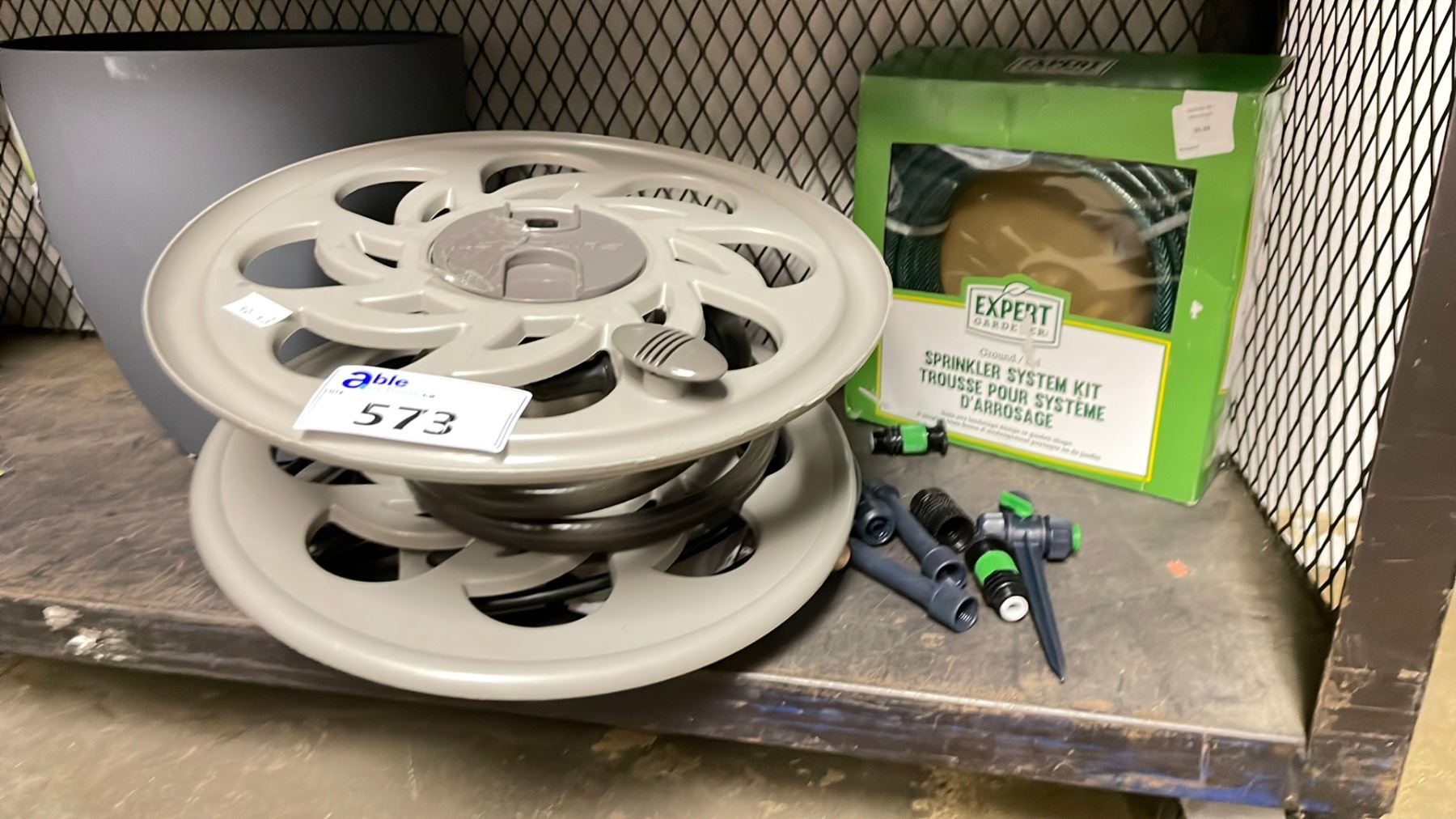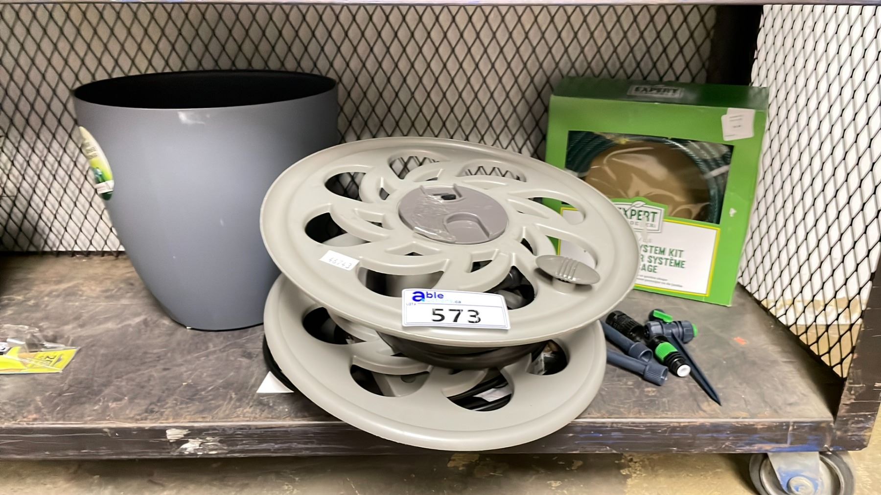 ASSORTED ITEMS INCLUDING; HOSE REEL, SPRINKLER SYSTEM KIT & PLANTER POT