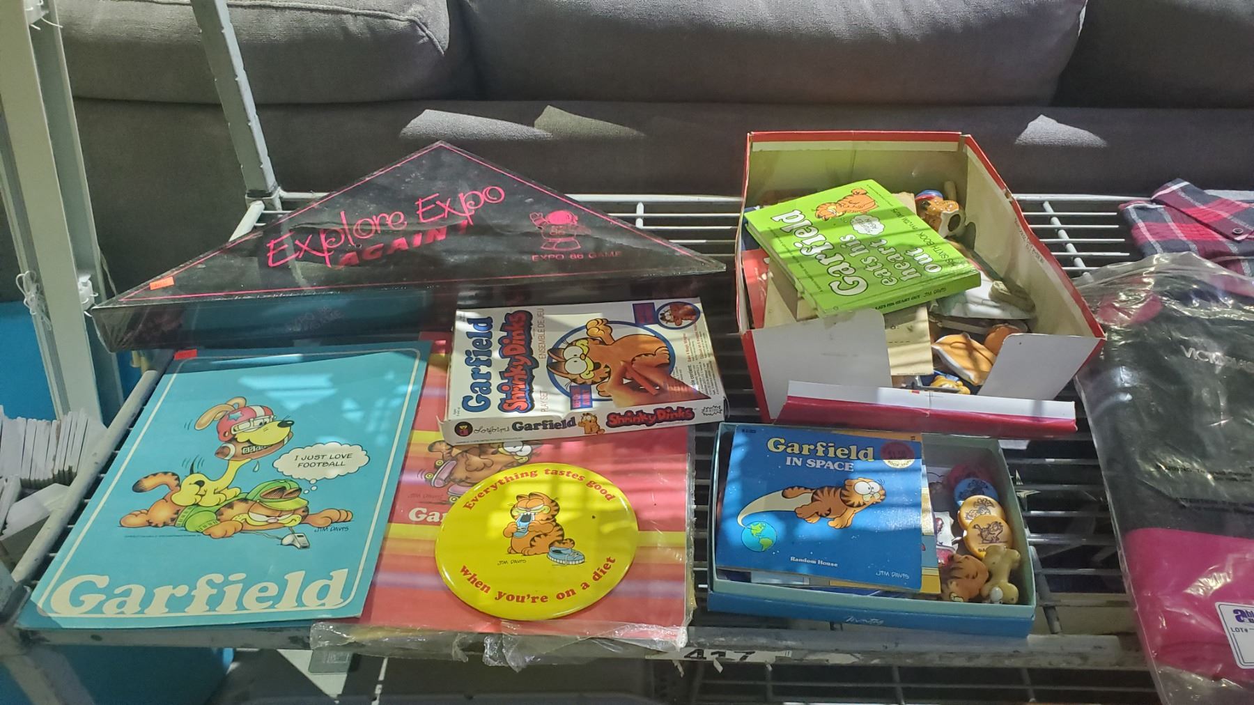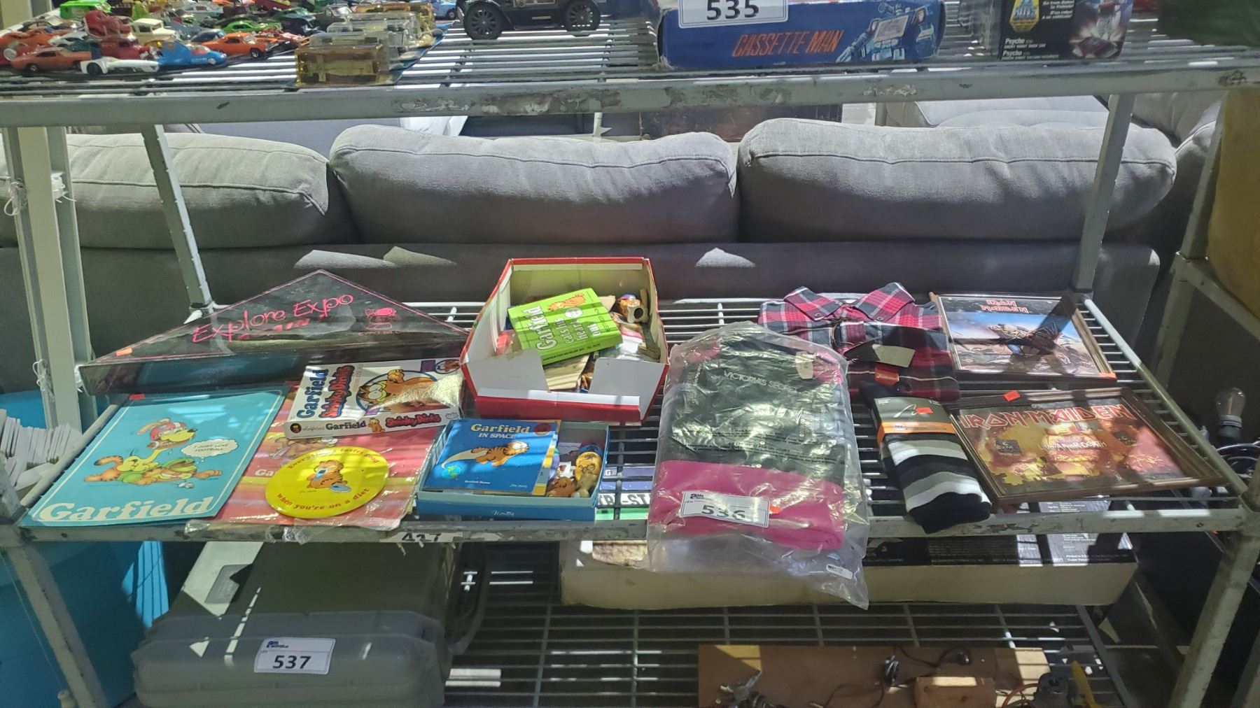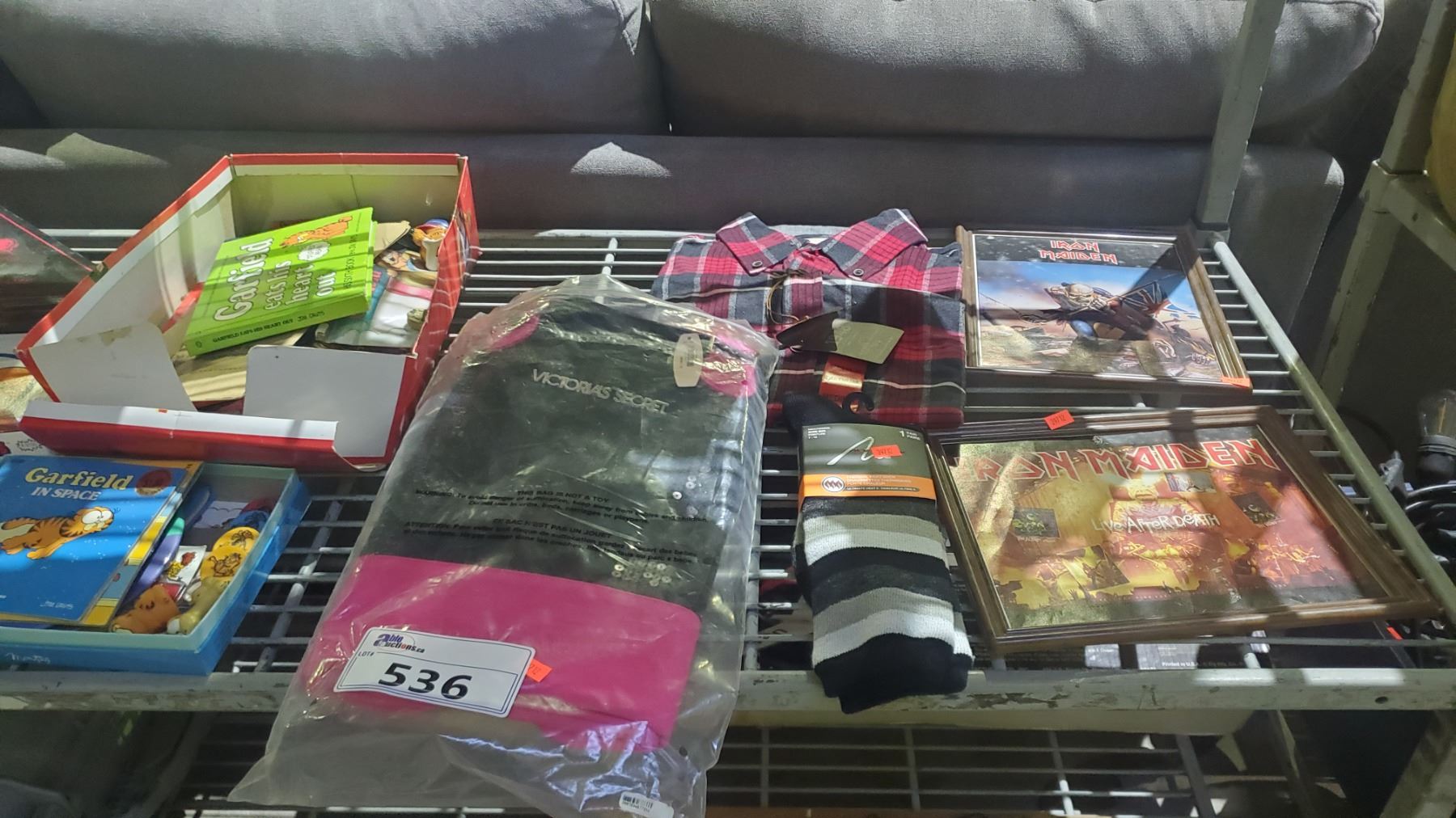 ASSORTED ITEMS INCLUDING; IRON MAIDEN FRAMED ART, GARFIELD TOYS, VICTORIA'S SECRET BAG & MORE