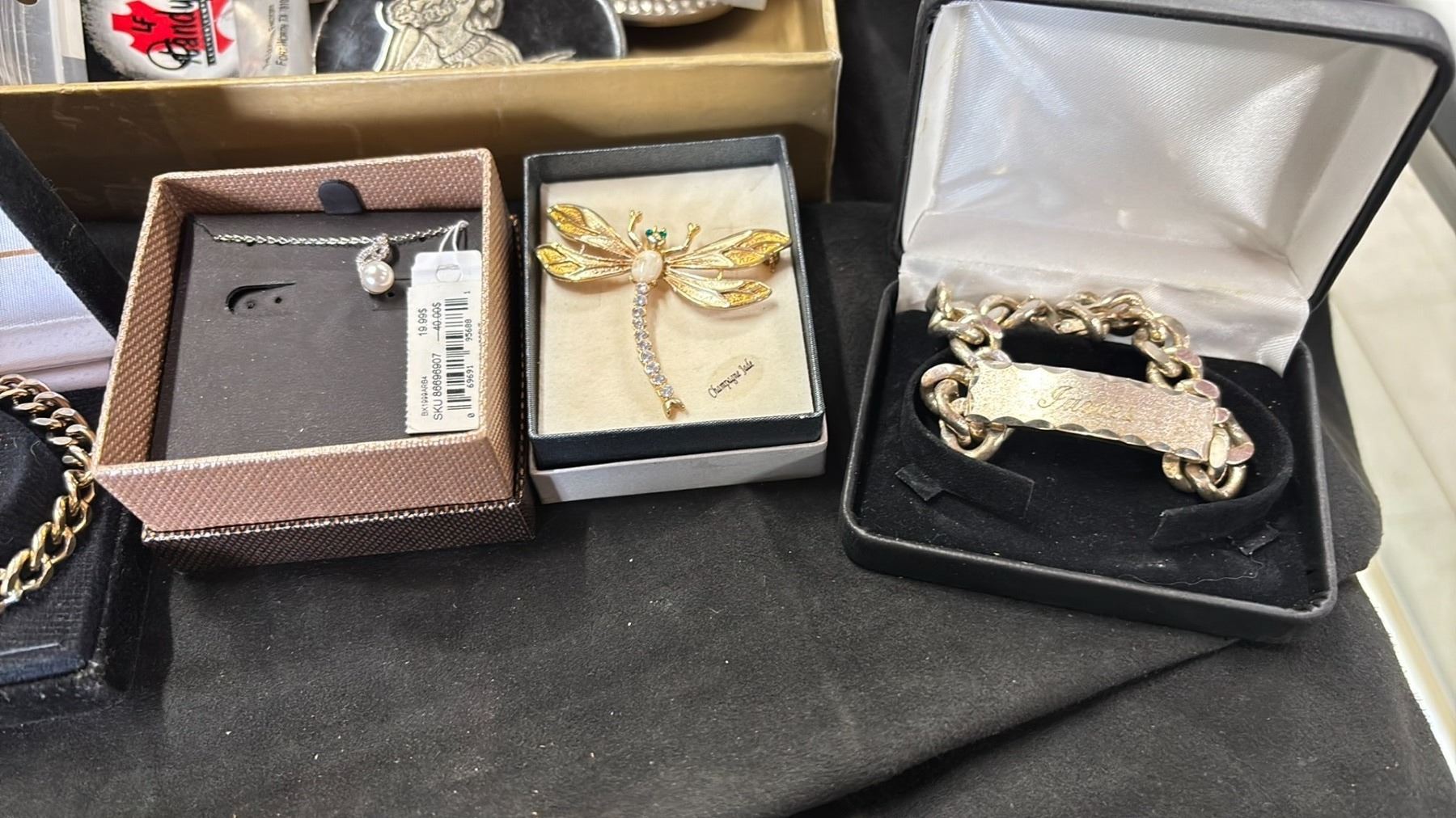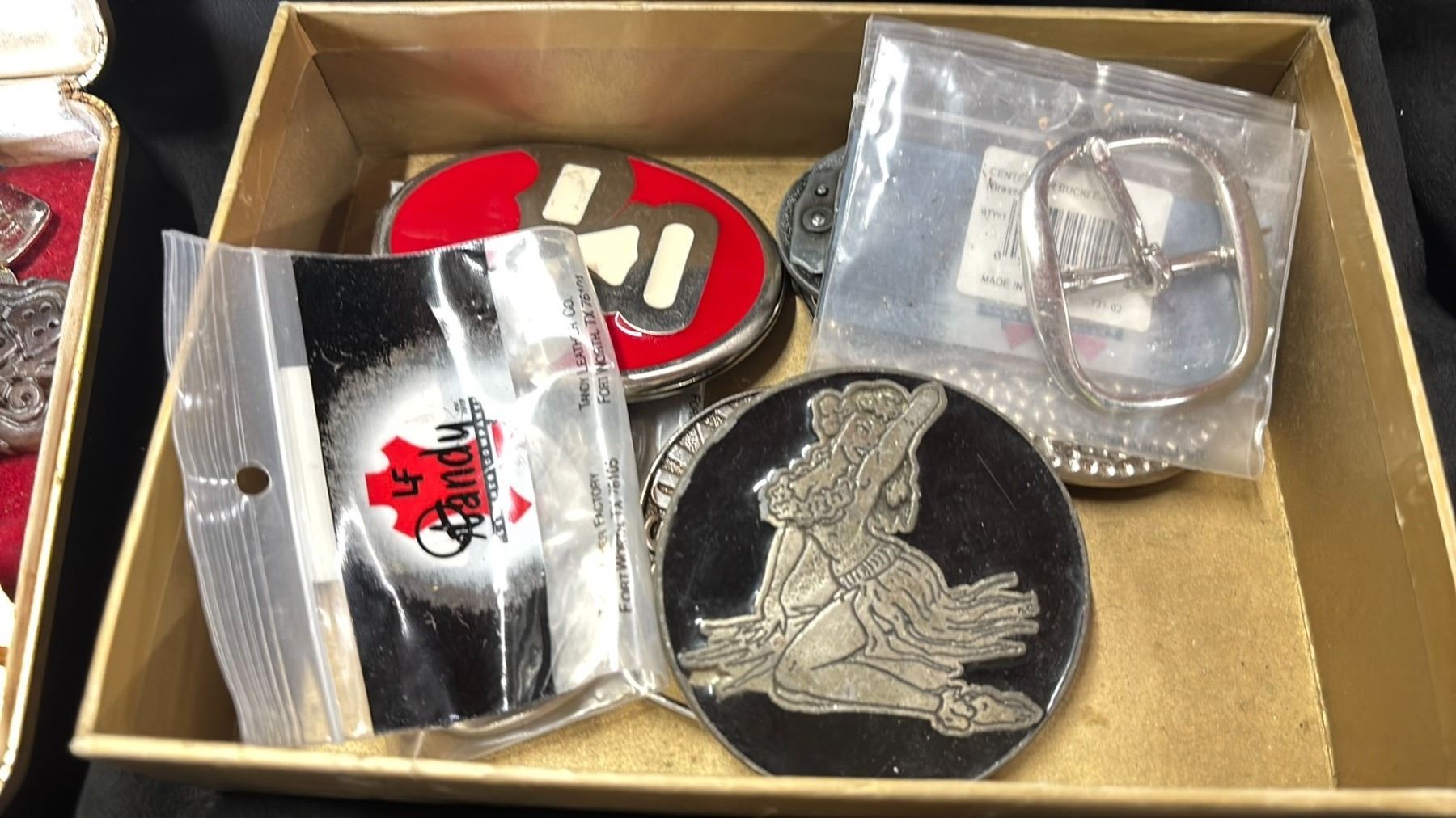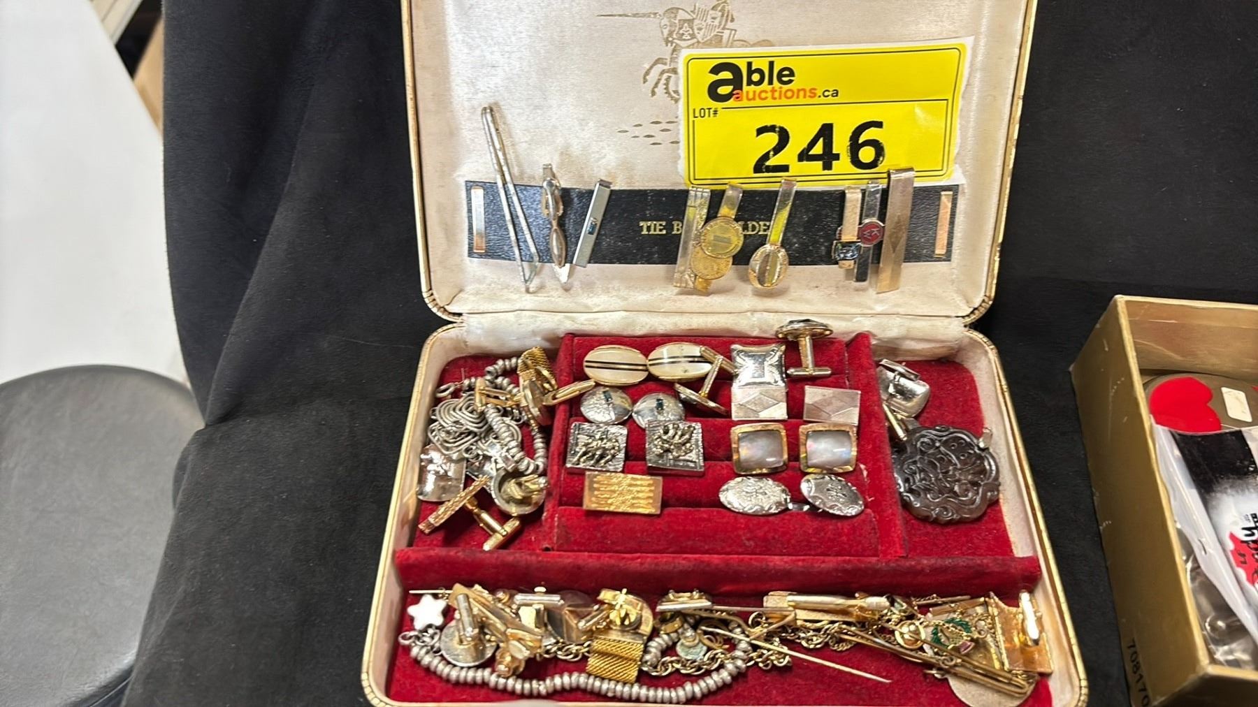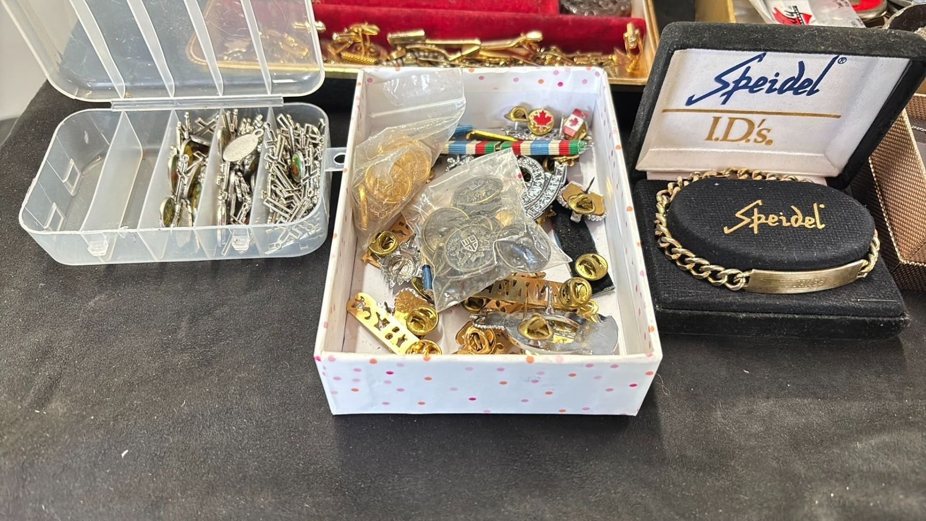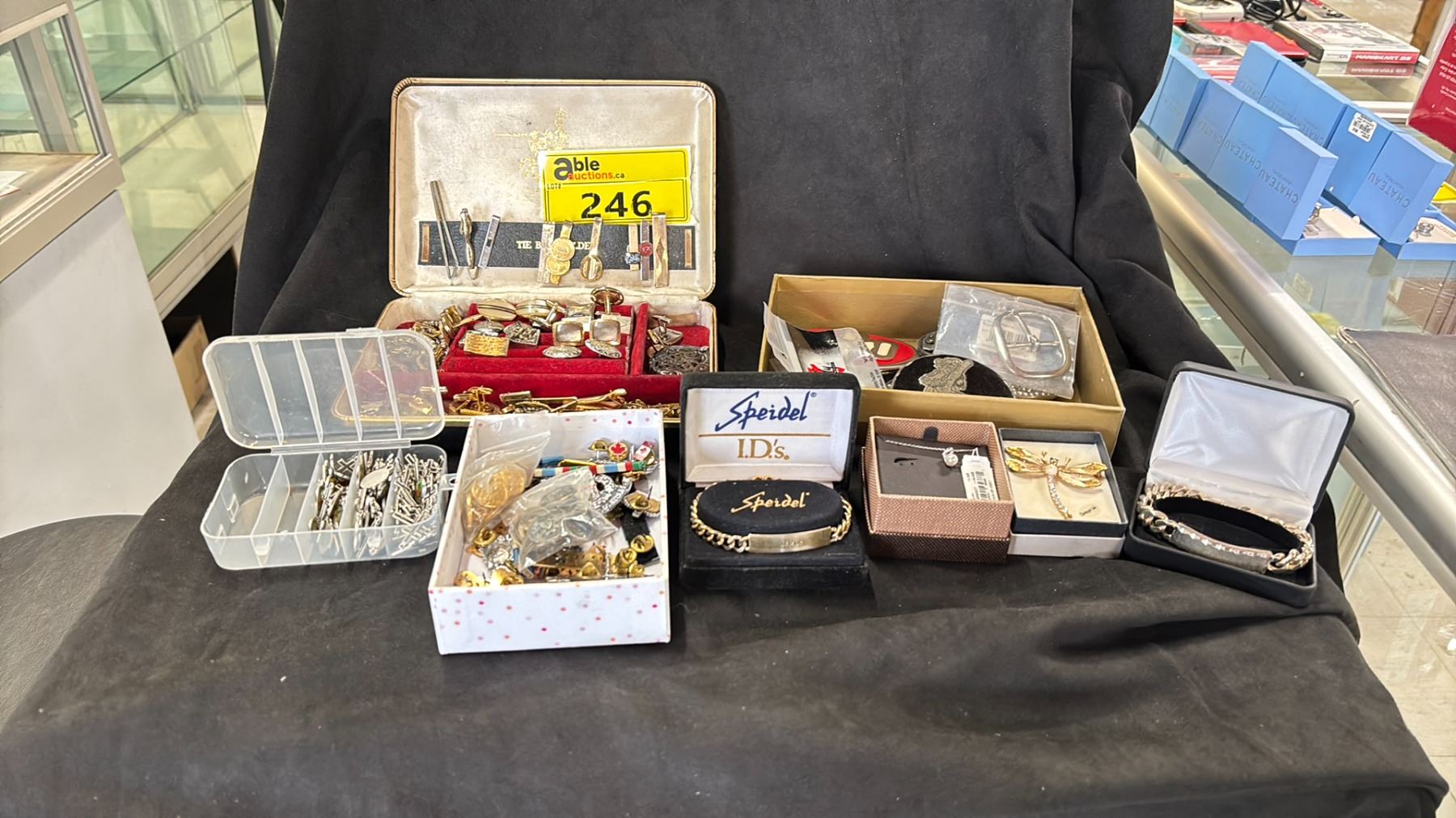 ASSORTED ITEMS INCLUDING; JEWELRY, CUFF LINKS, BELT BUCKLES, PINS & MORE
