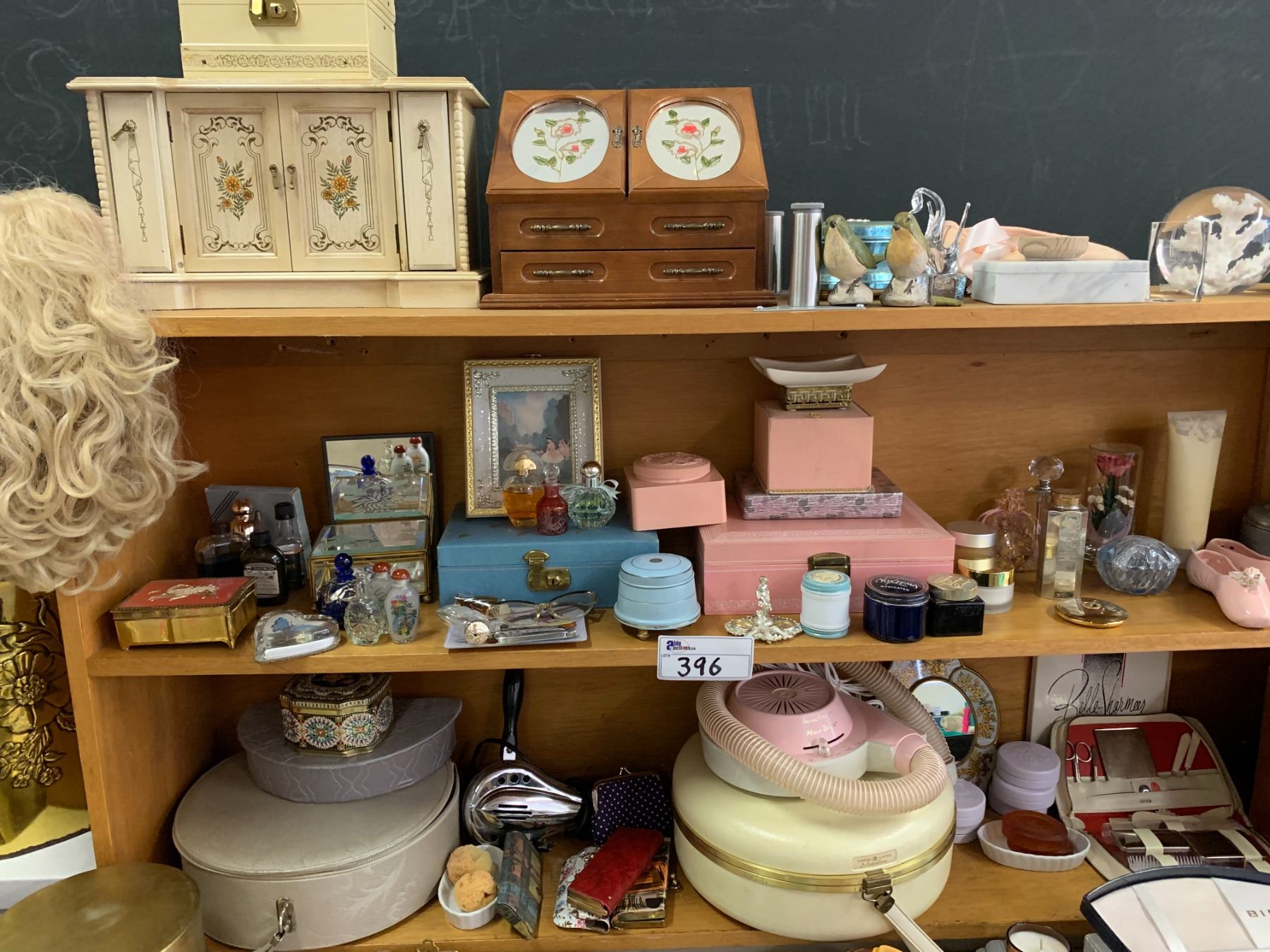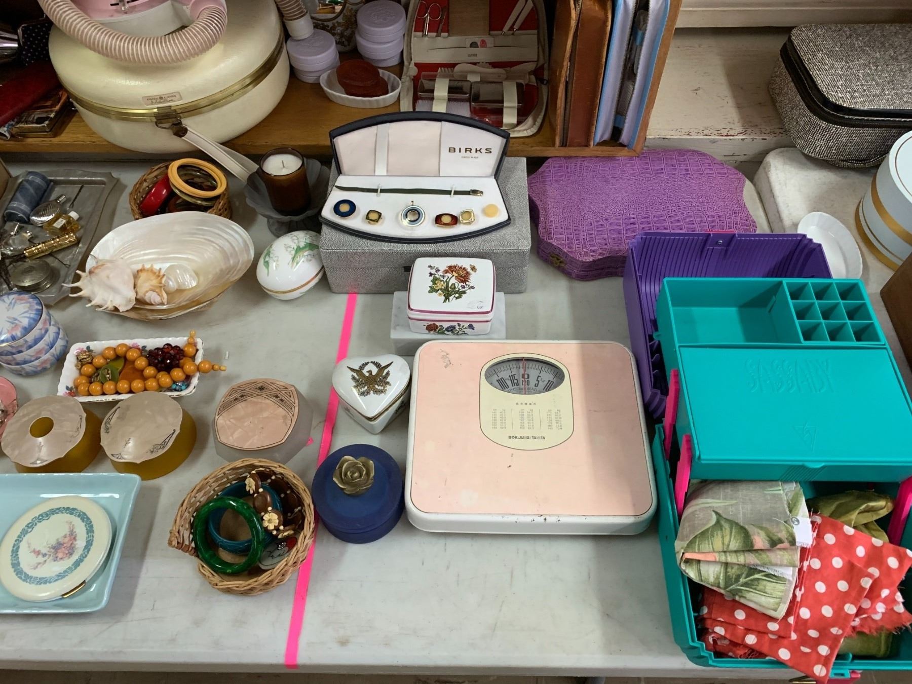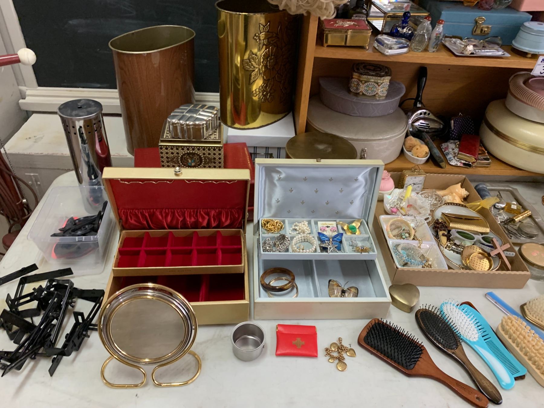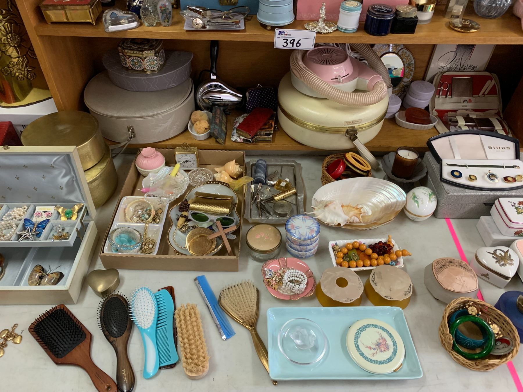 ASSORTED ITEMS INCLUDING; JEWELRY, VINTAGE HAIR DRYERS, JEWELRY BOXES, VACUUM & MORE (TABLE NOT INCLUDED)