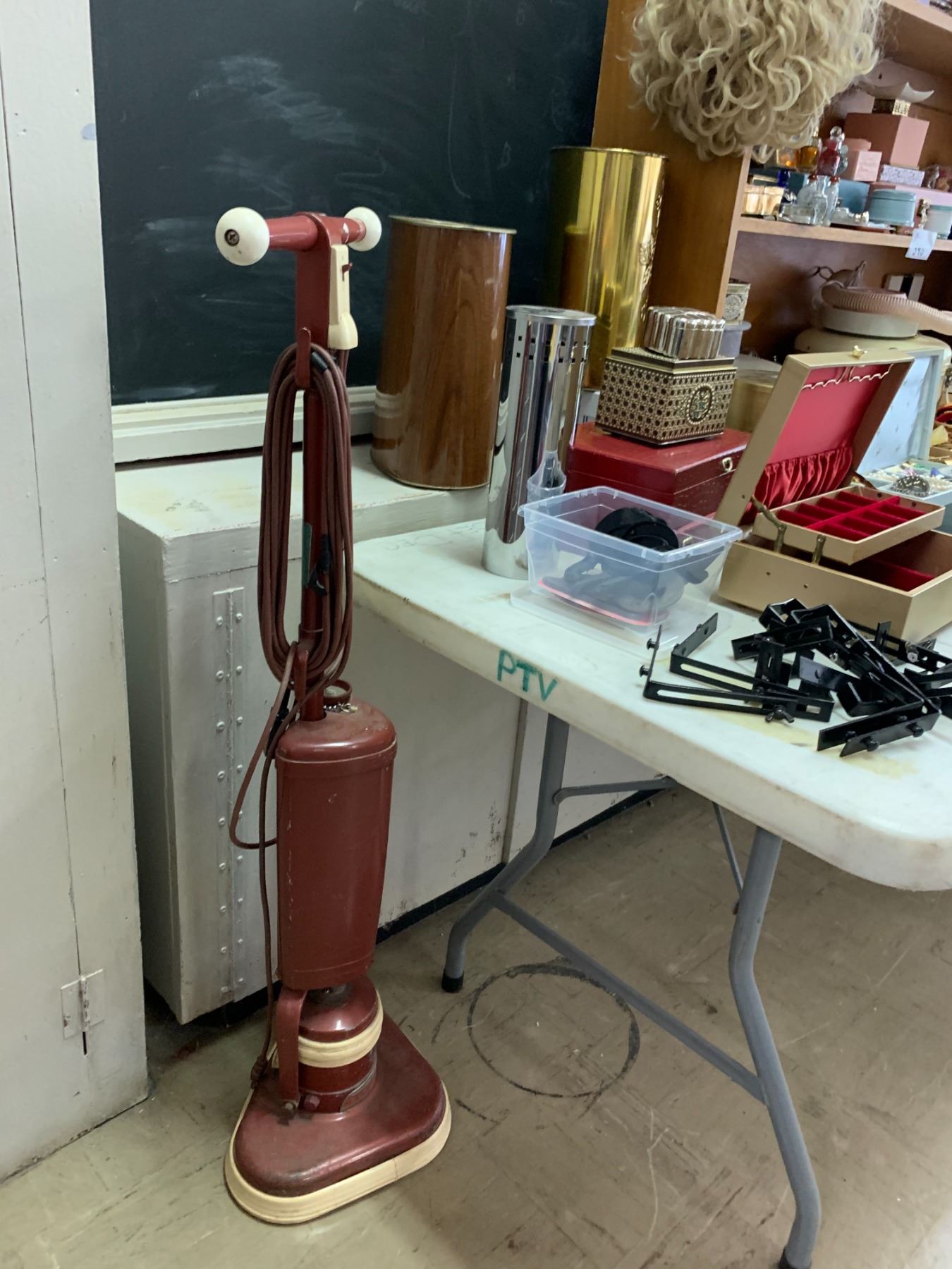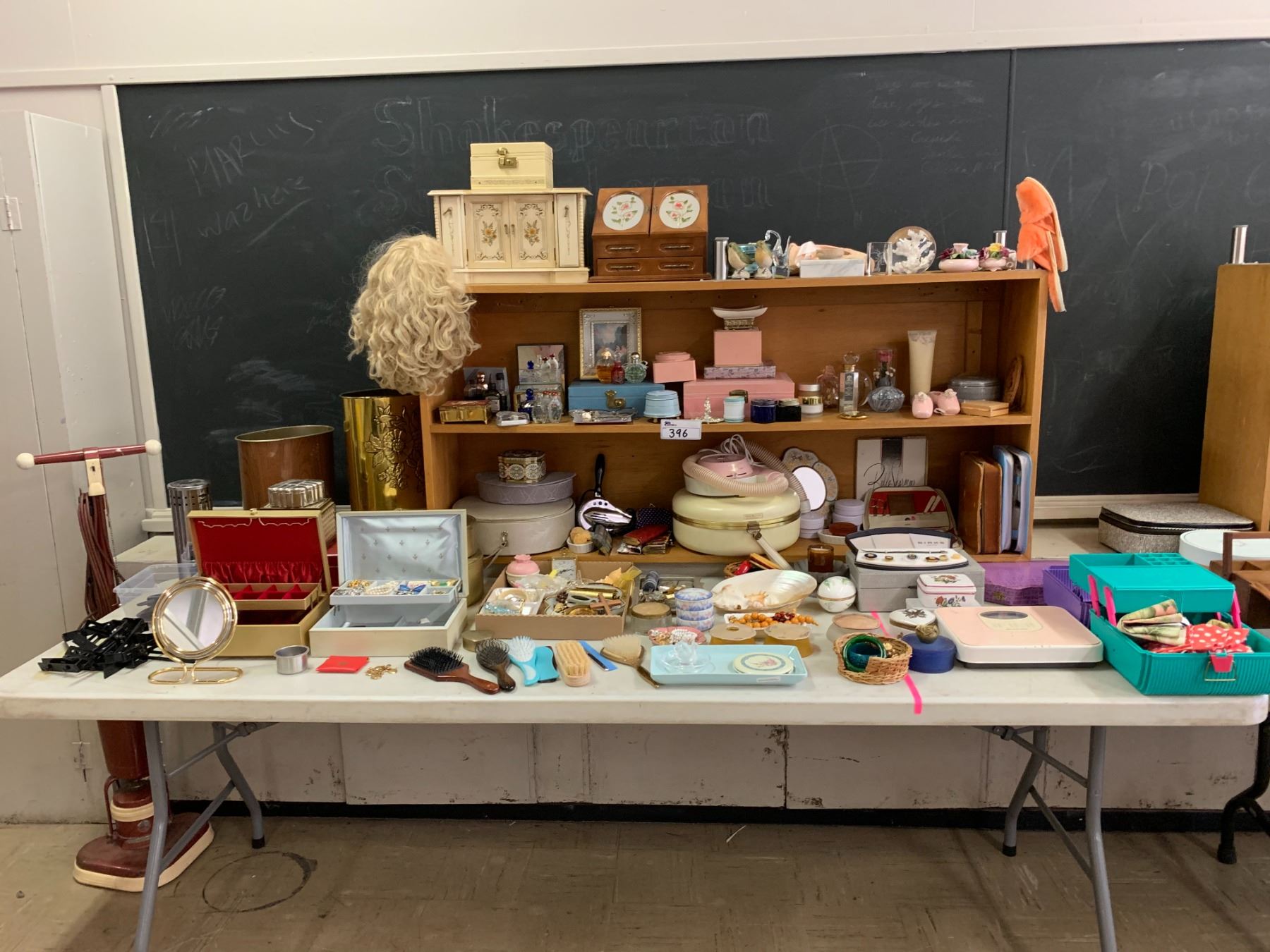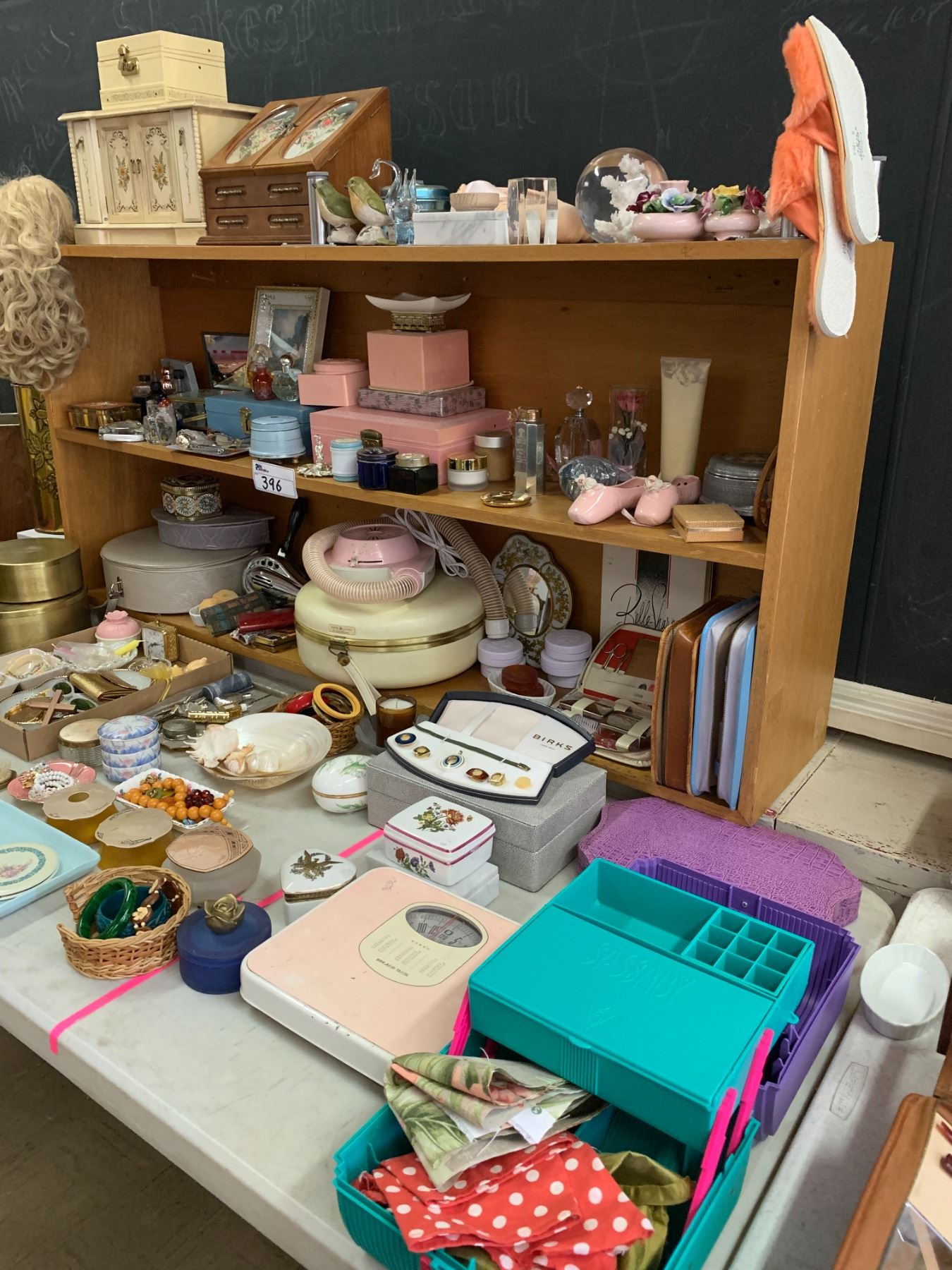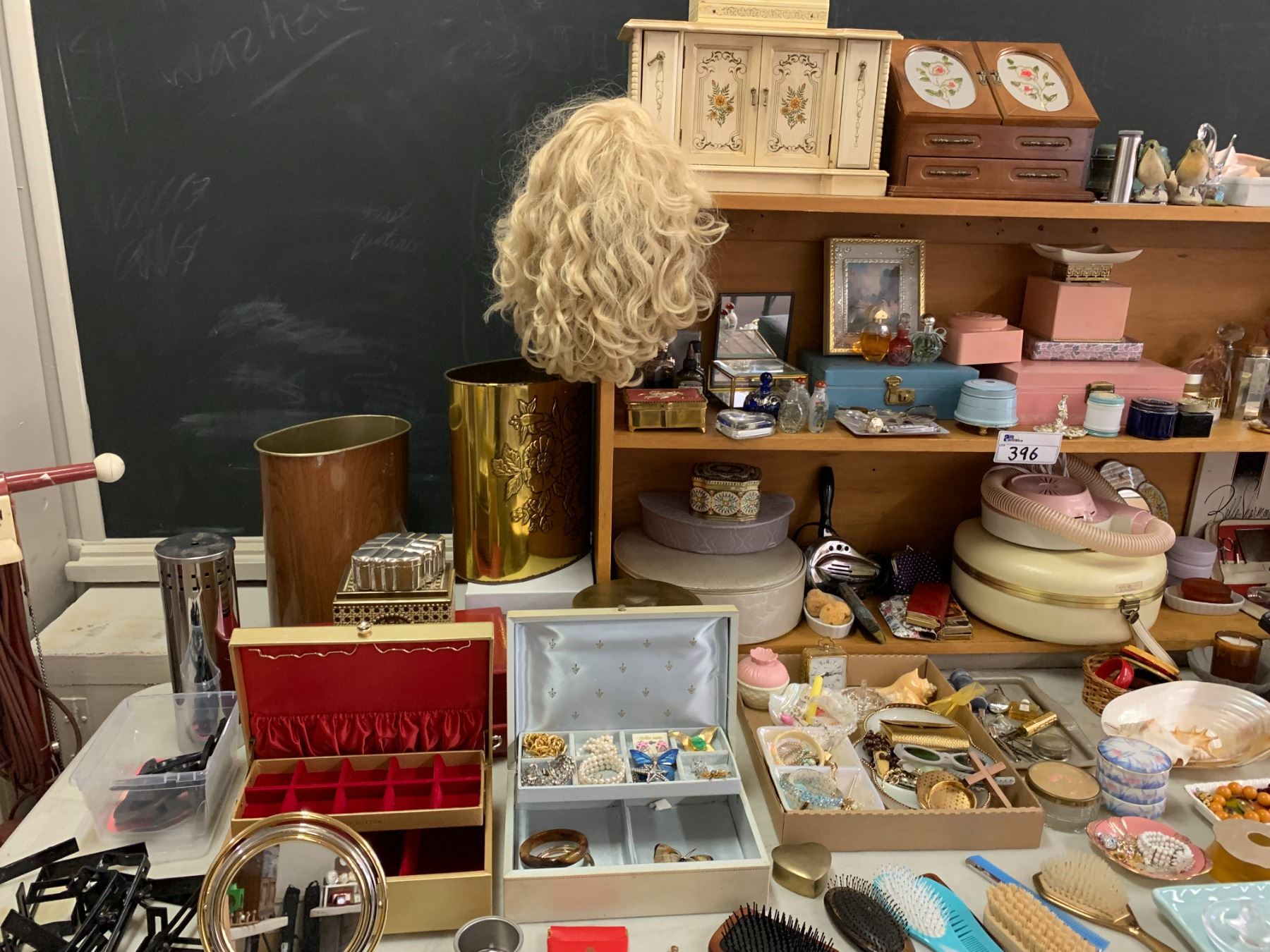 ASSORTED ITEMS INCLUDING; JEWELRY, VINTAGE HAIR DRYERS, JEWELRY BOXES, VACUUM & MORE (TABLE NOT INCLUDED)