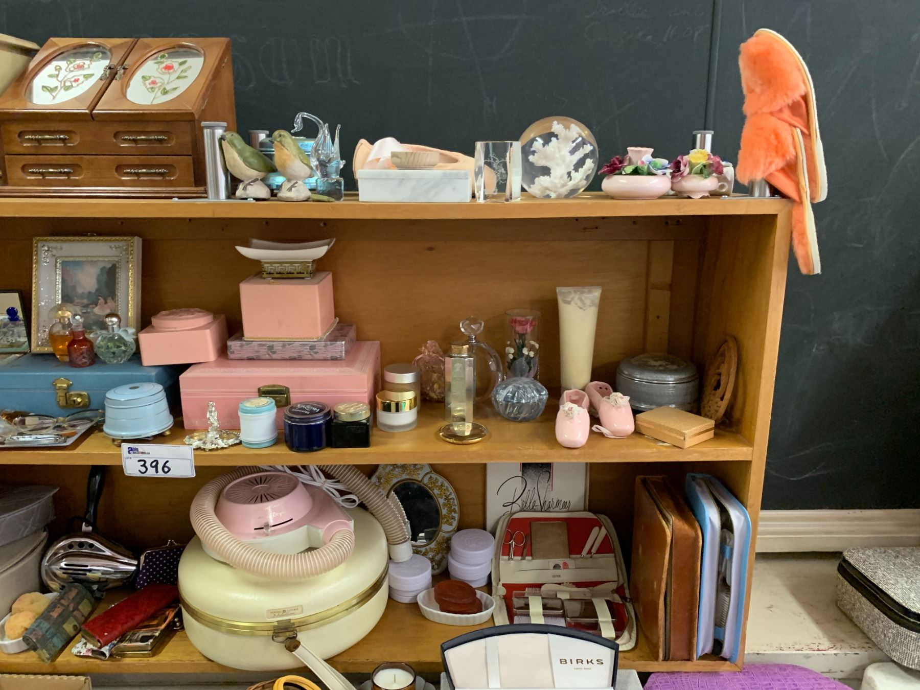 ASSORTED ITEMS INCLUDING; JEWELRY, VINTAGE HAIR DRYERS, JEWELRY BOXES, VACUUM & MORE (TABLE NOT I...