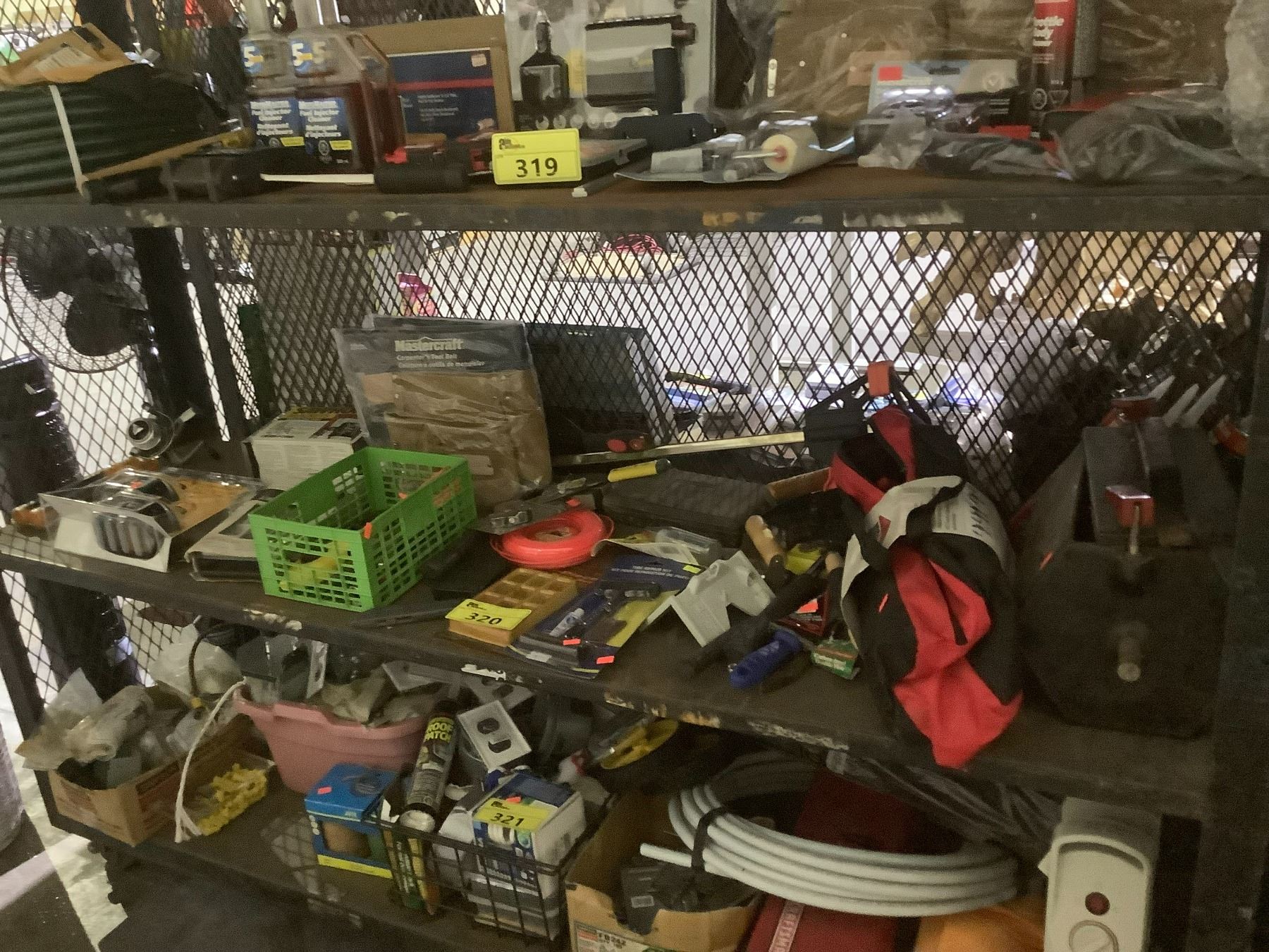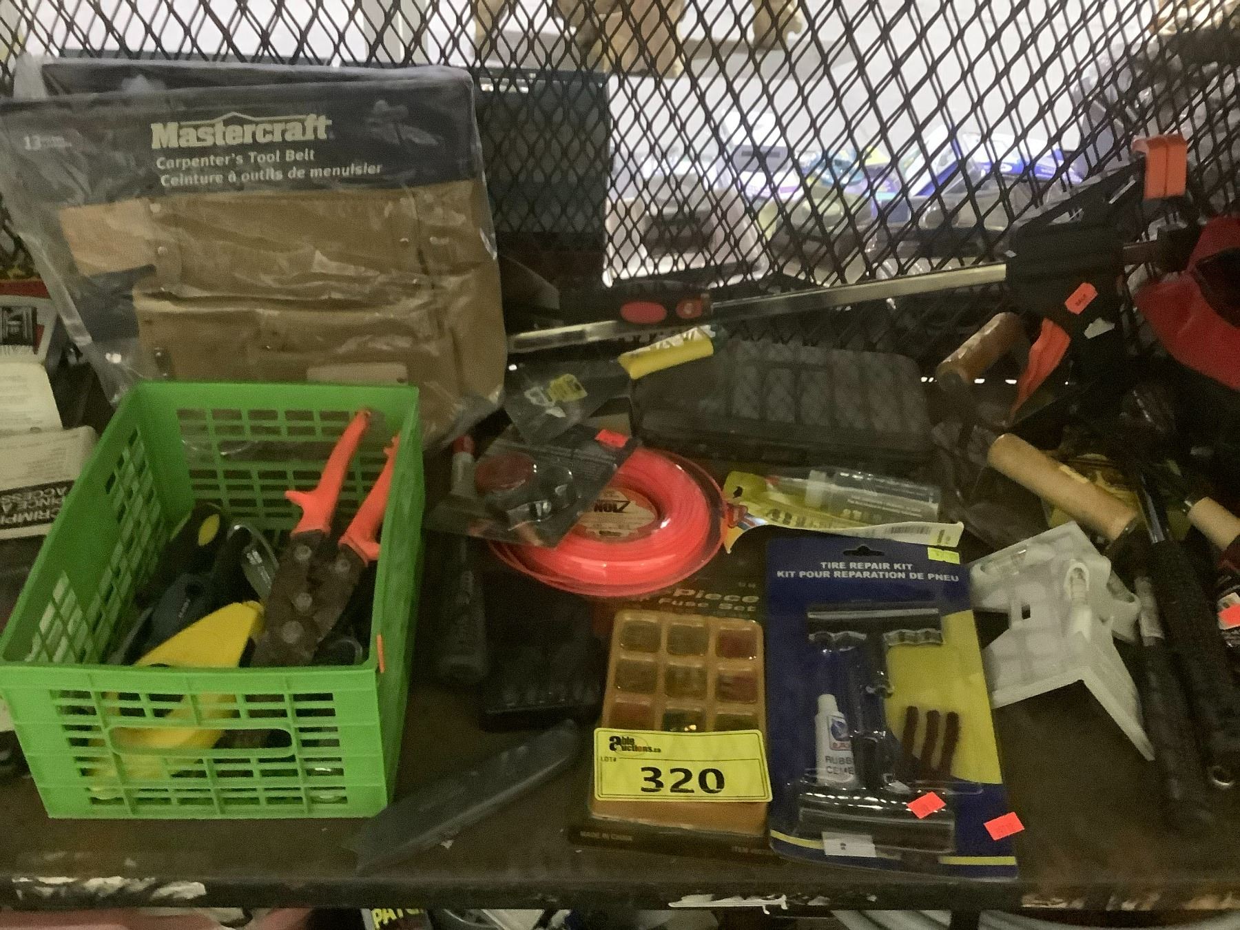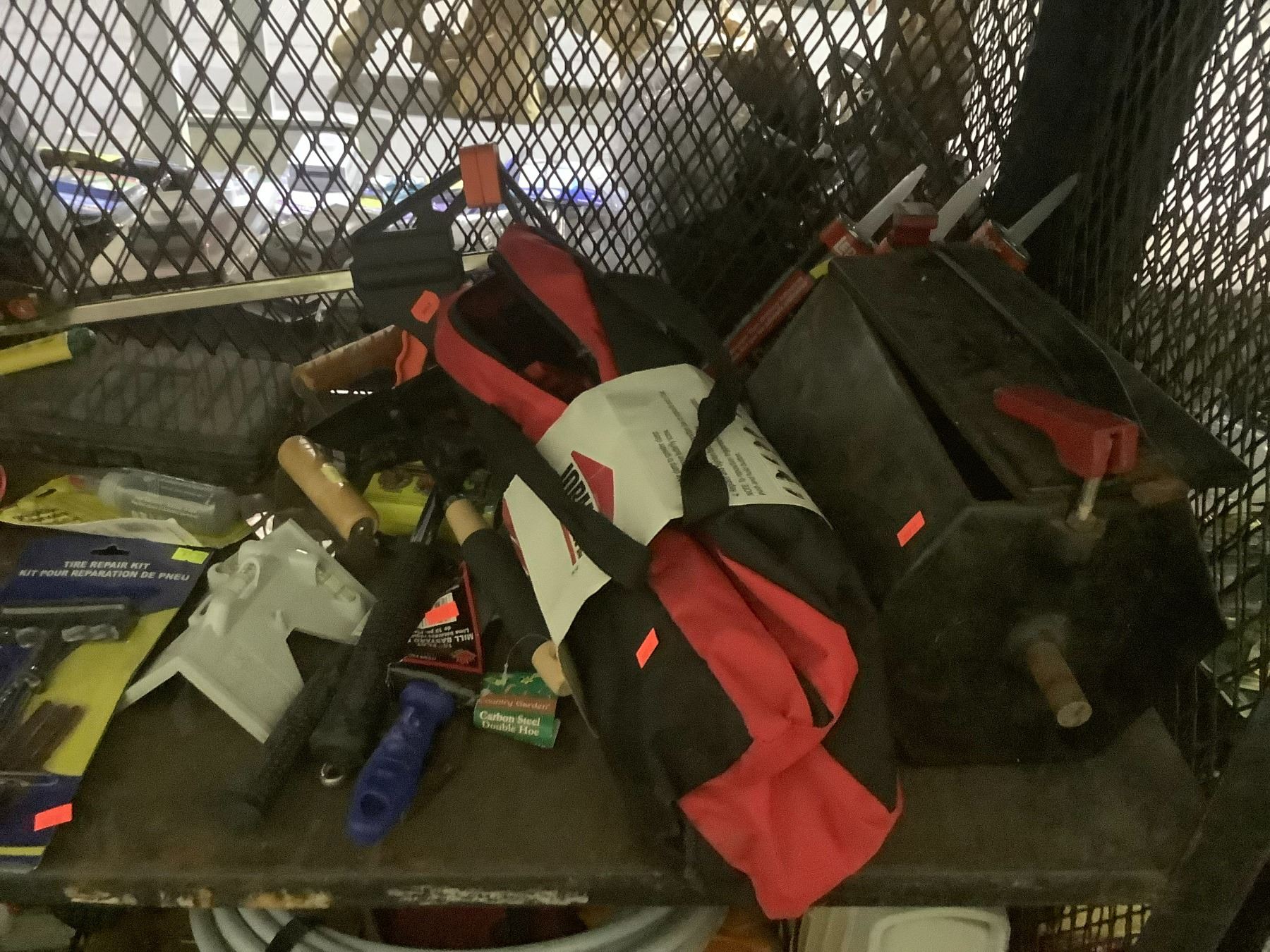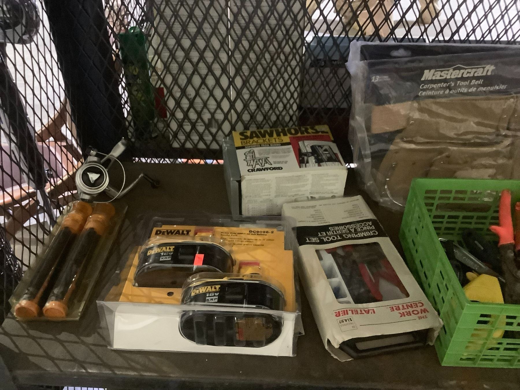 ASSORTED ITEMS INCLUDING; JOBMATE TOOL BAG, NEW DEWALT DC9096-2 HEAVY DUTY XRP 18V BATTERY COMBO PACK, SAWHORSE BRACKETS & MORE