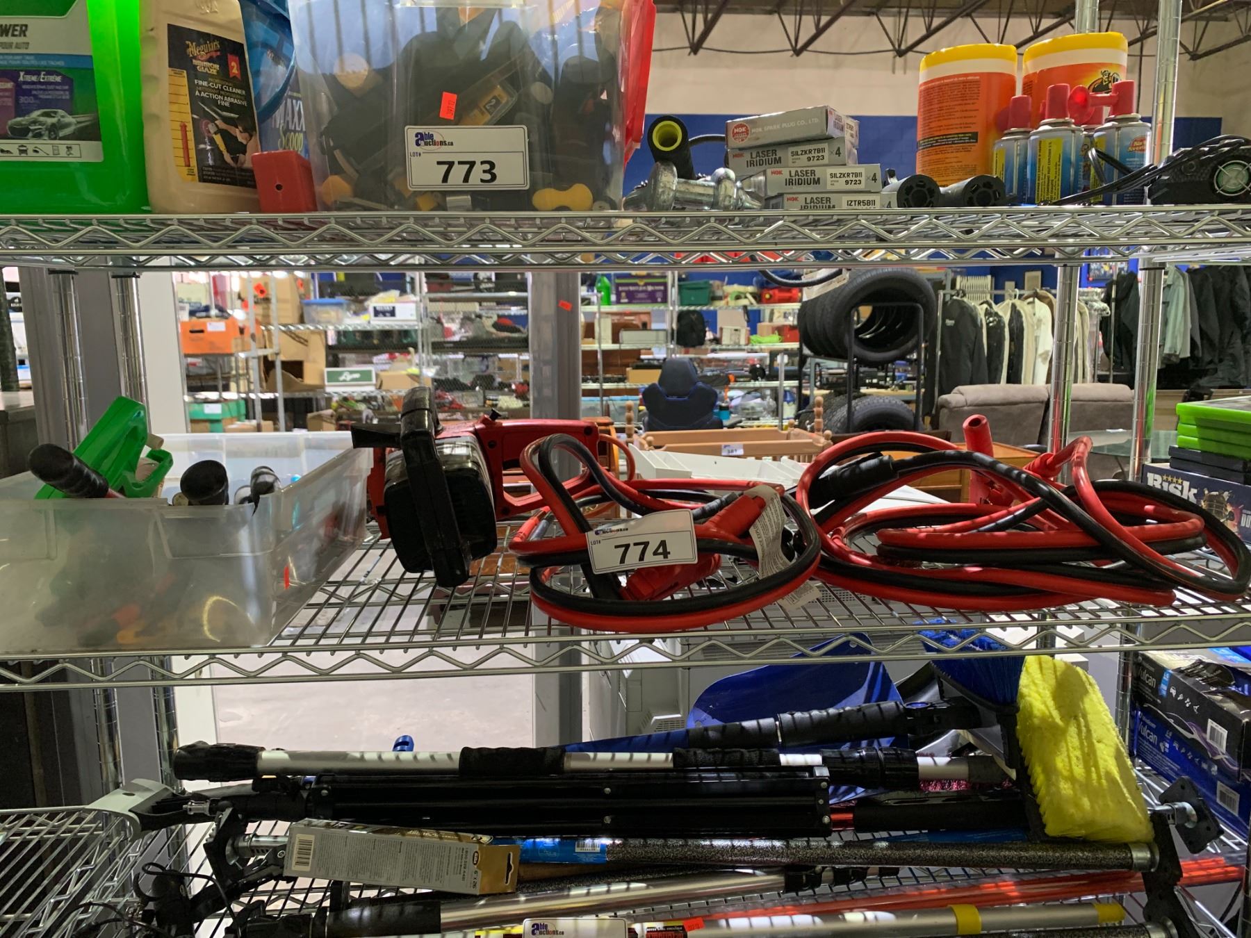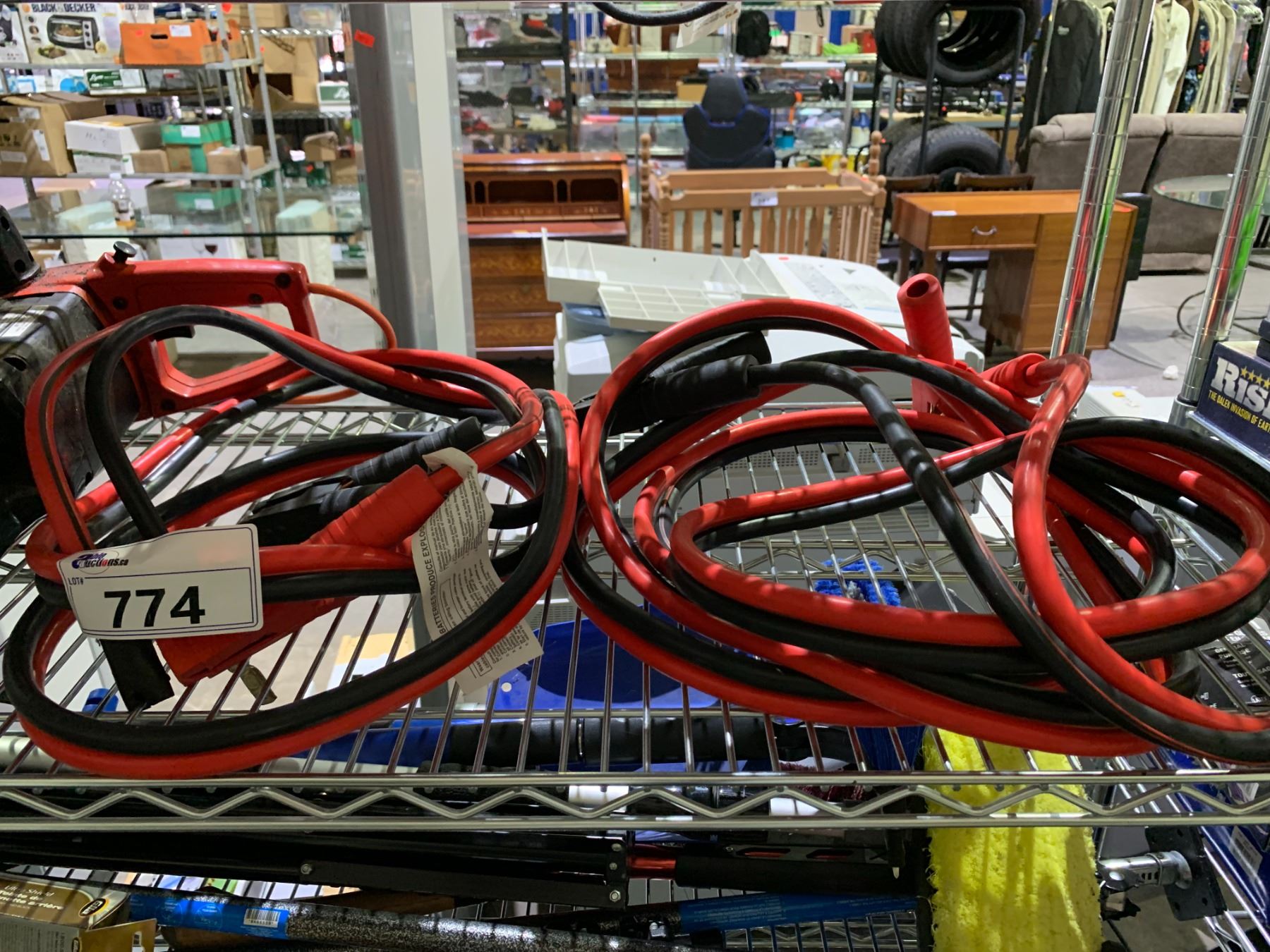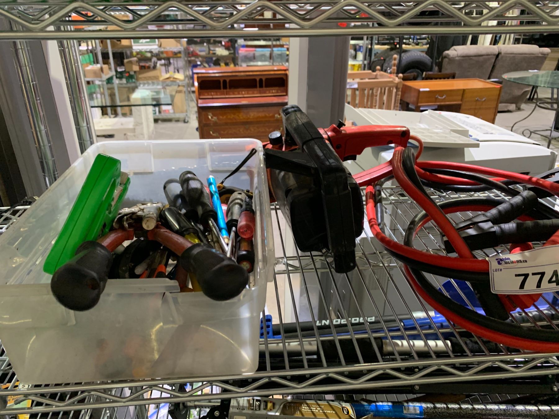 ASSORTED ITEMS INCLUDING; JUMPER CABLES, CRAFTSMAN ELECTRIC CHAINSAW & BIN OF ASSORTED TOOLS