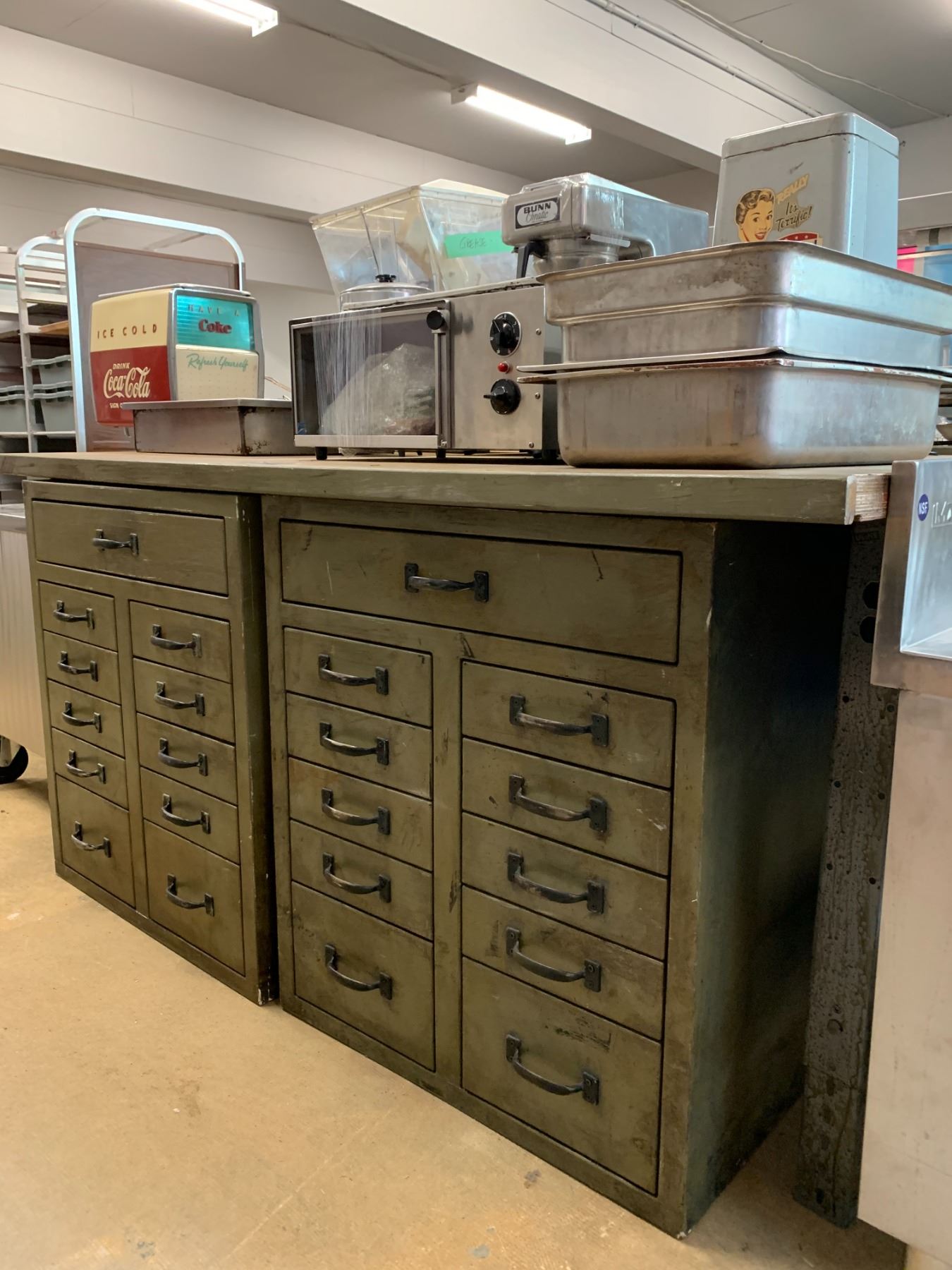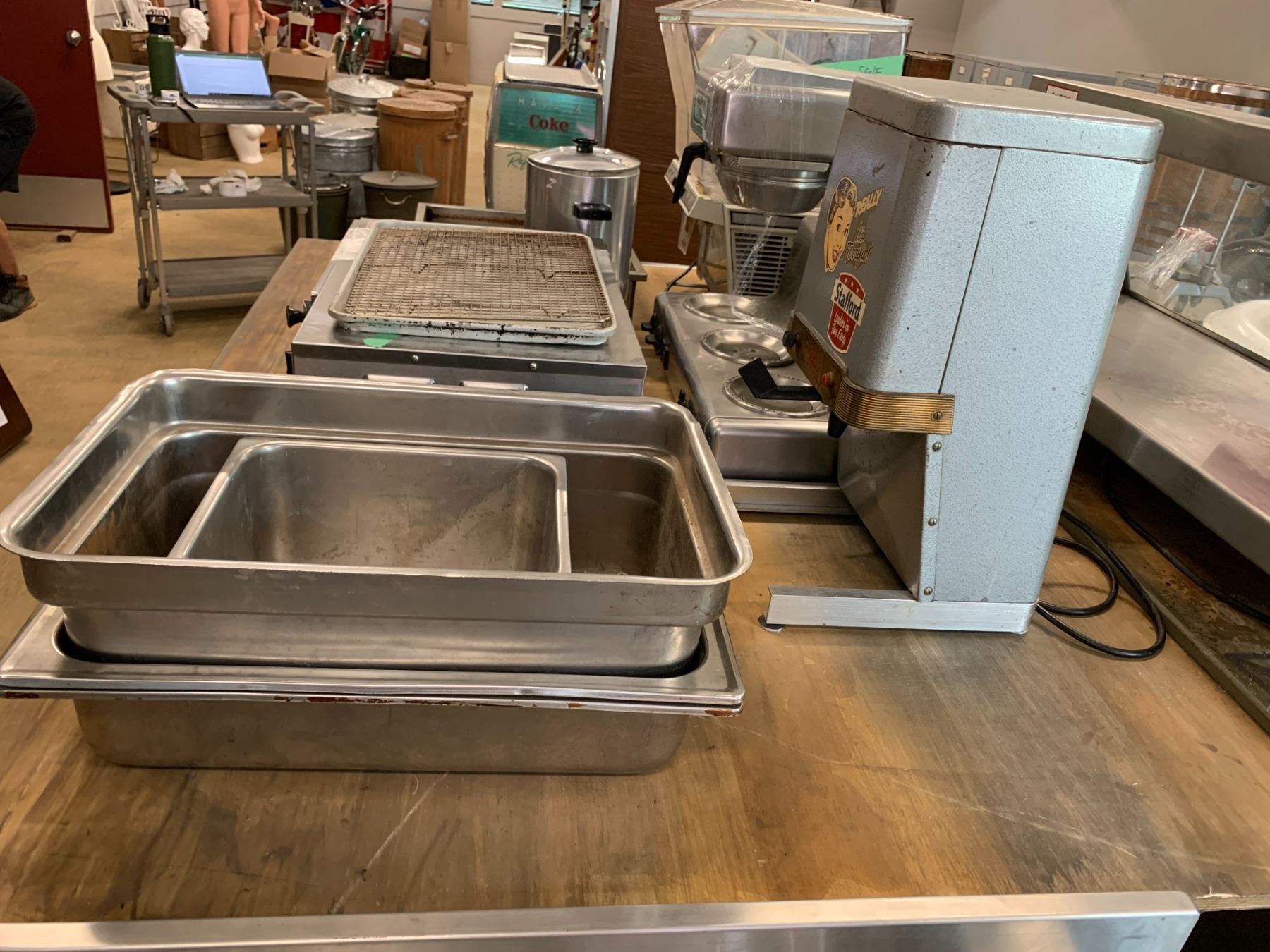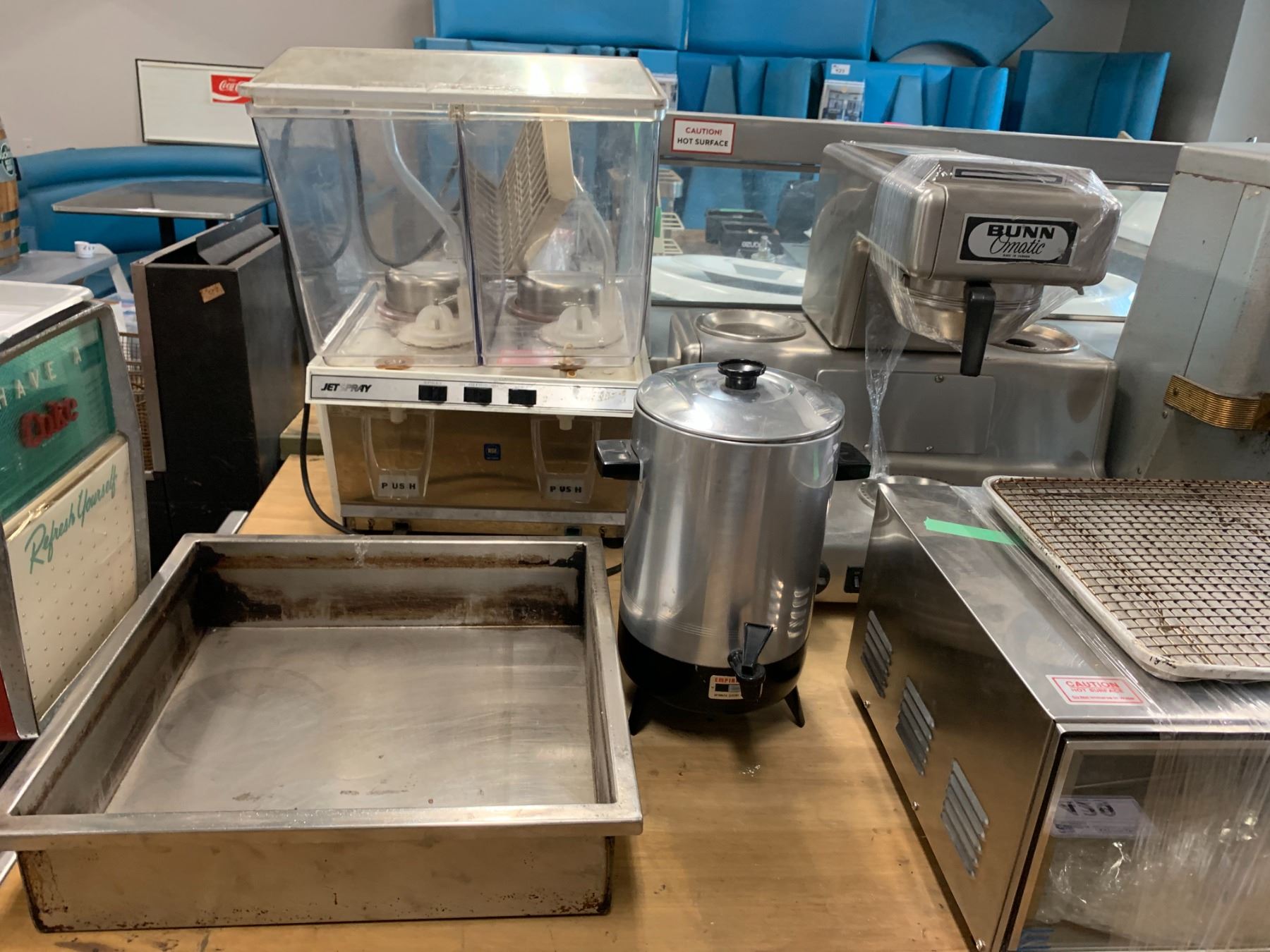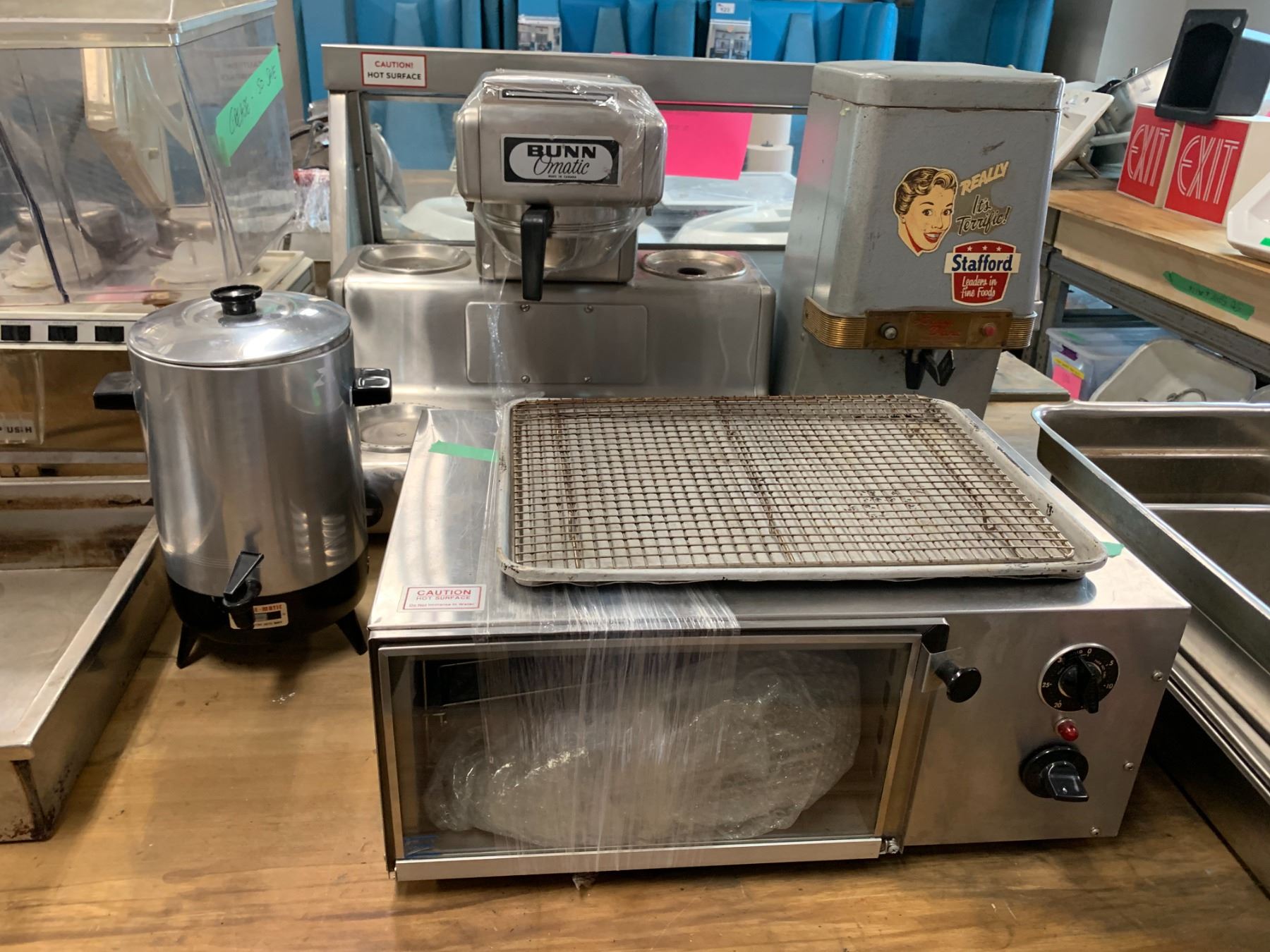 ASSORTED ITEMS INCLUDING; KITCHEN APPLIANCES, METAL & WOOD SHOP TABLE, BUFFET TRAYS & 2 PROP CABINETS (MUST TAKE ALL)