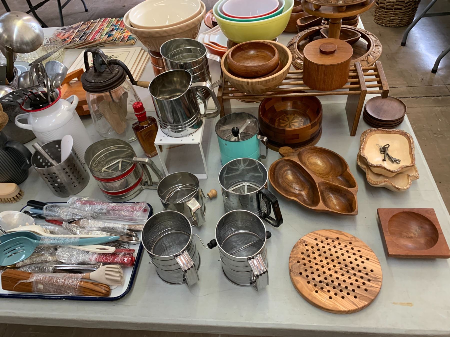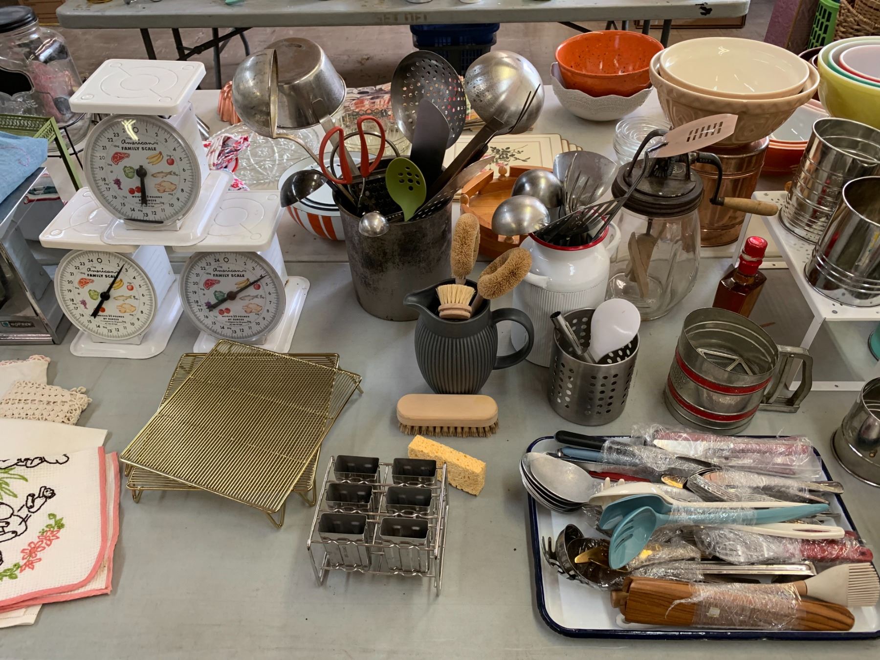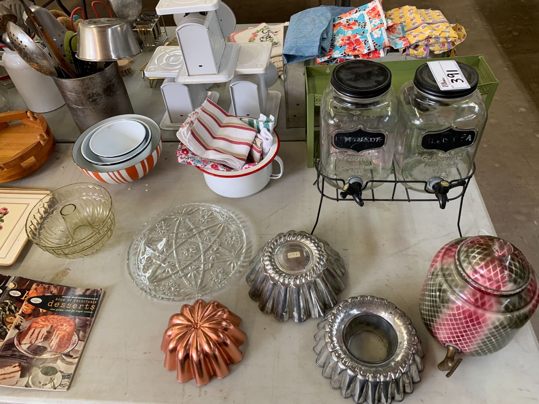 ASSORTED ITEMS INCLUDING; LIQUID DISPENSERS, KITCHEN SCALES, KITCHEN UTENSILS, BOWL SETS & MORE (TABLES NOT INCLUDED)