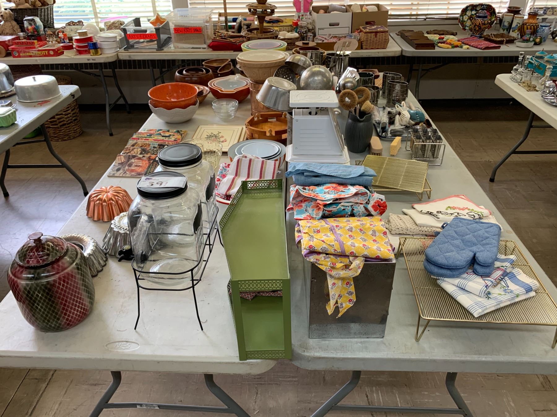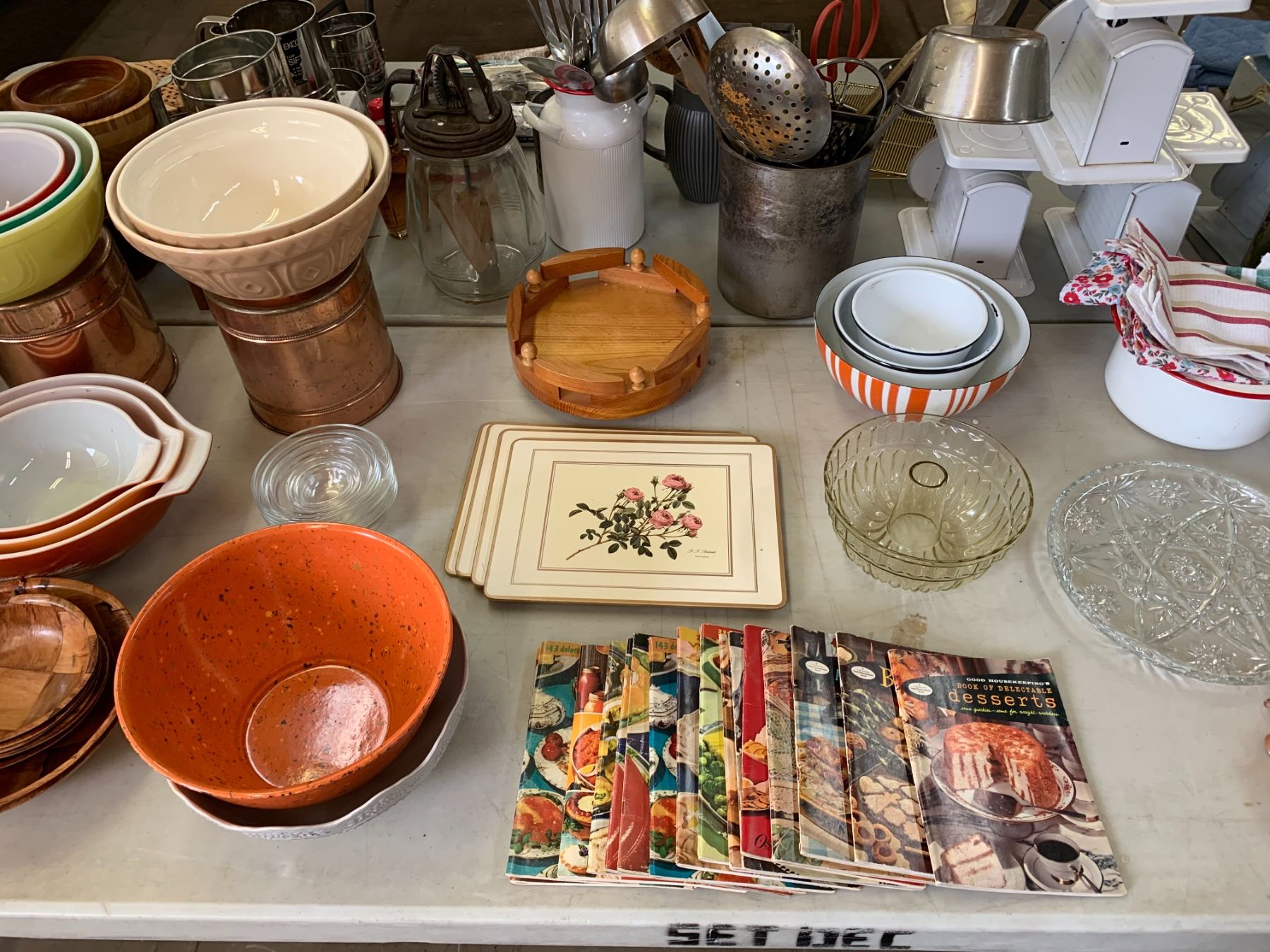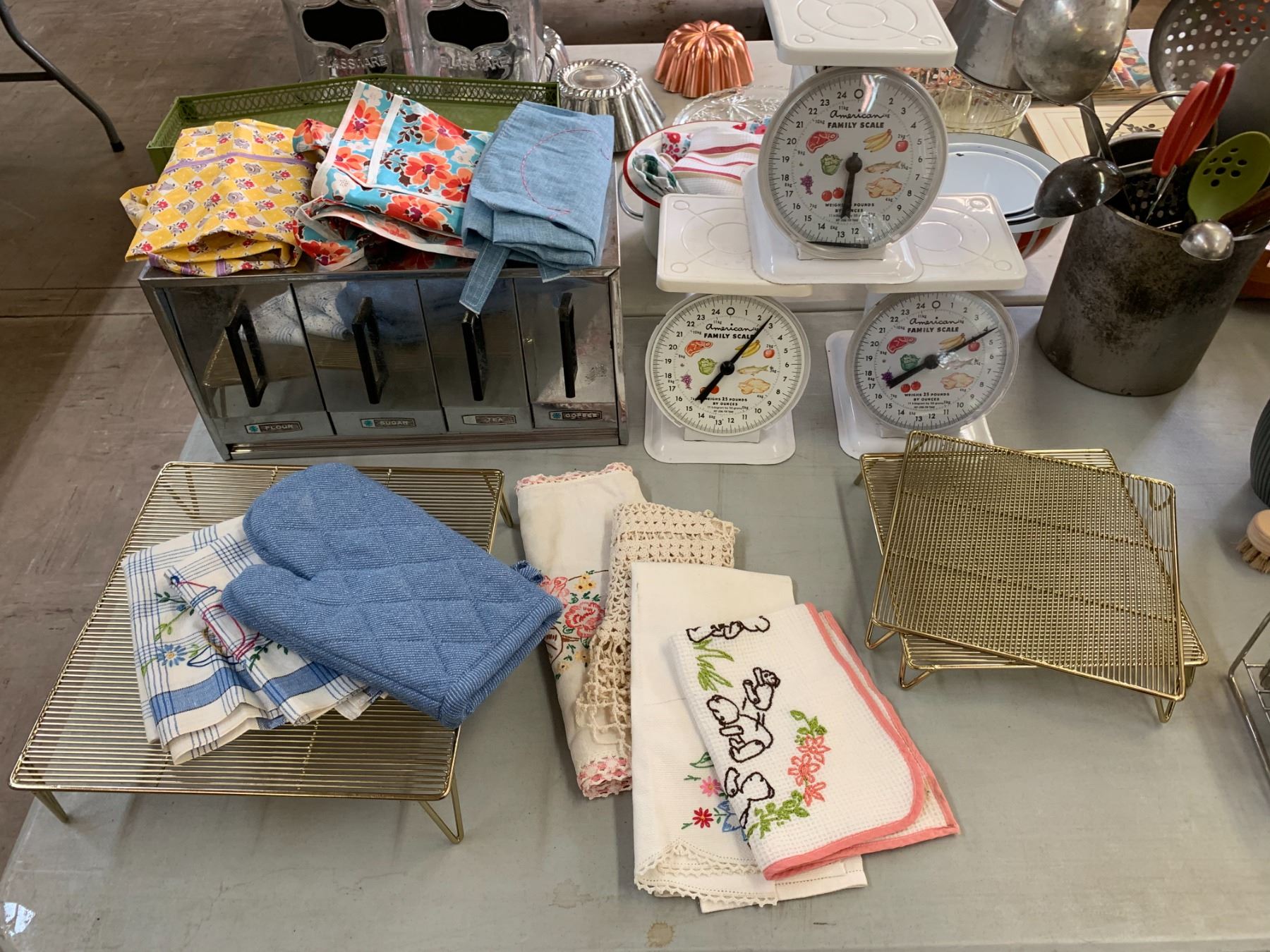 ASSORTED ITEMS INCLUDING; LIQUID DISPENSERS, KITCHEN SCALES, KITCHEN UTENSILS, BOWL SETS & MORE (TABLES NOT INCLUDED)