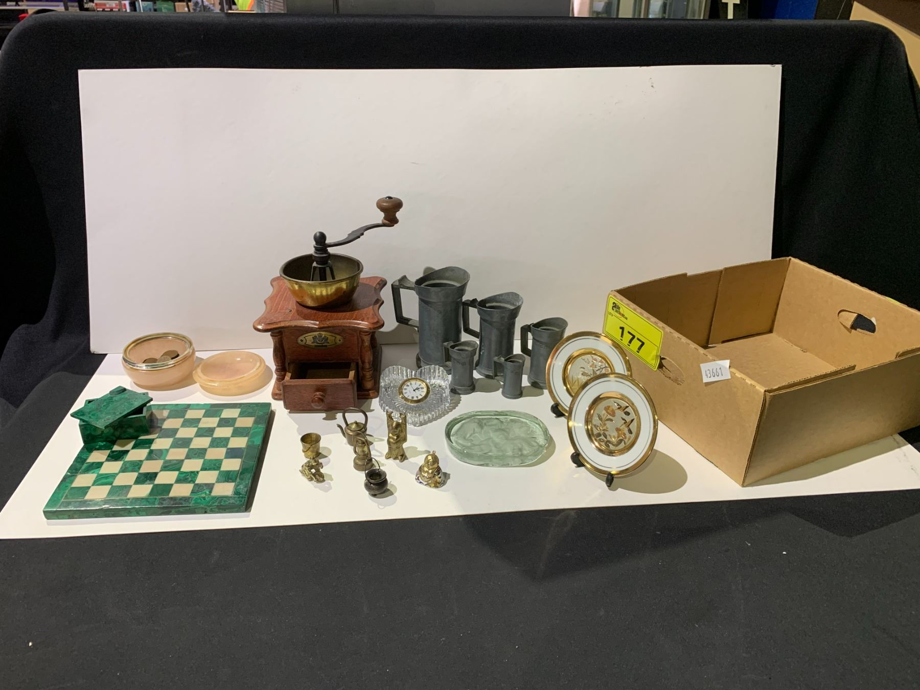 ASSORTED ITEMS INCLUDING; MALACHITE CHESS BOARD, PEWTER CUPS, ANTIQUE COFFEE GRINDER & MORE