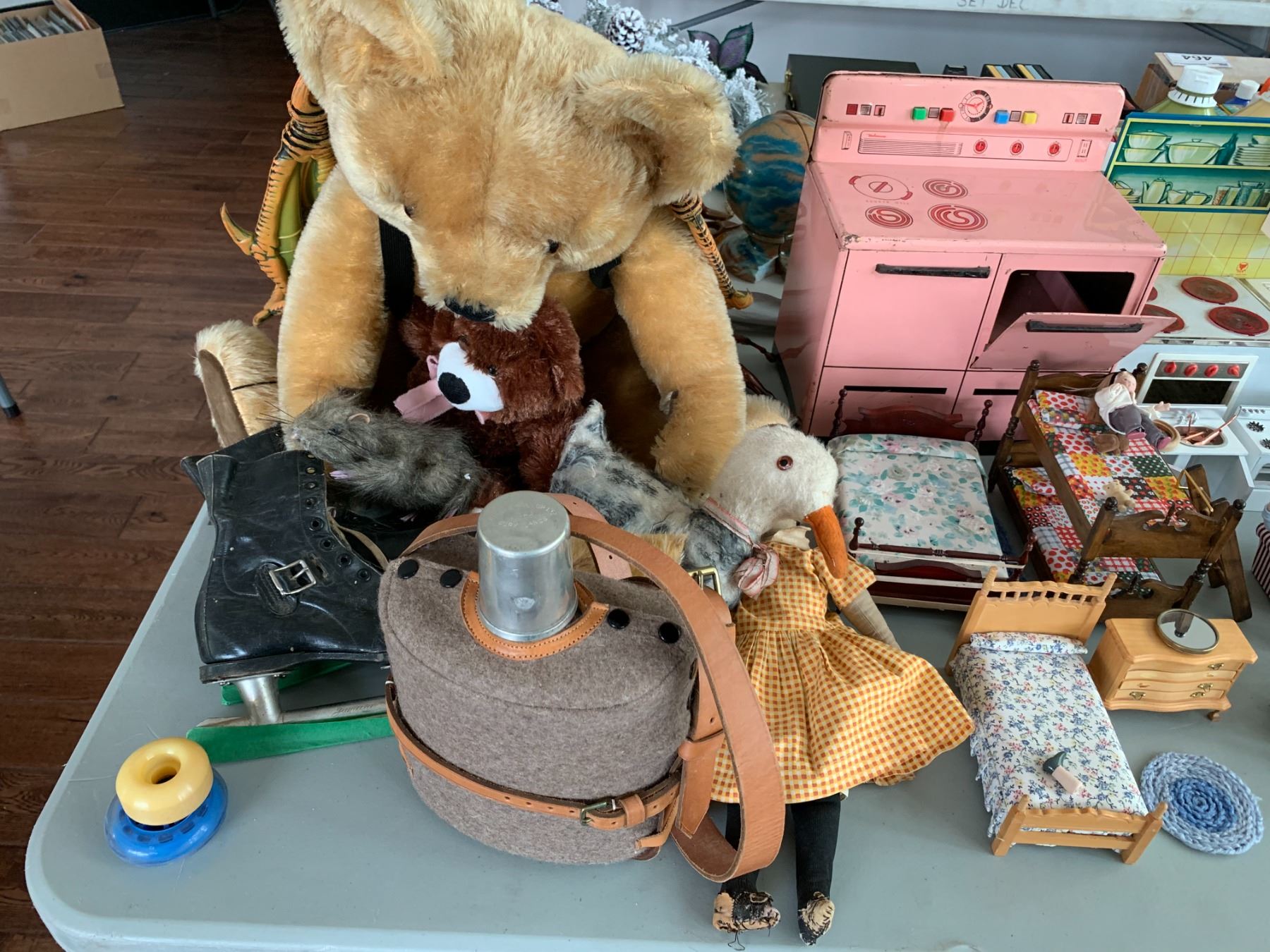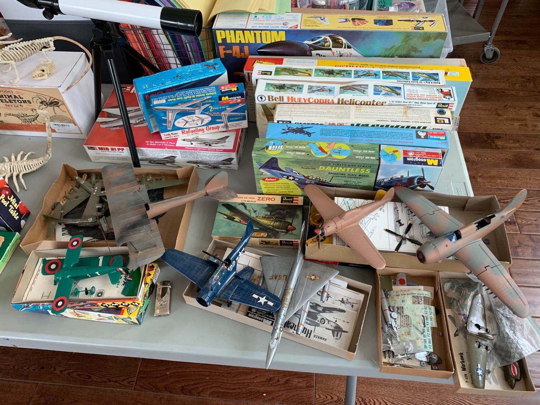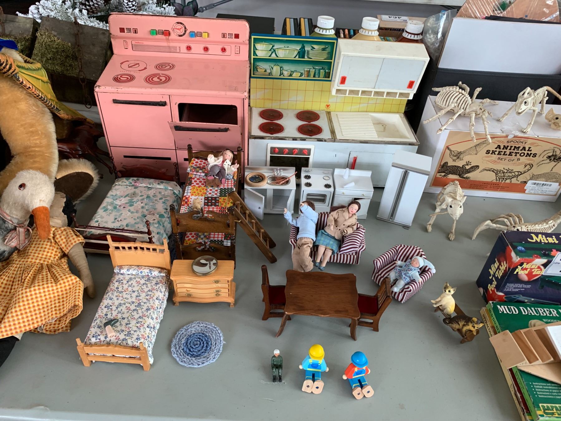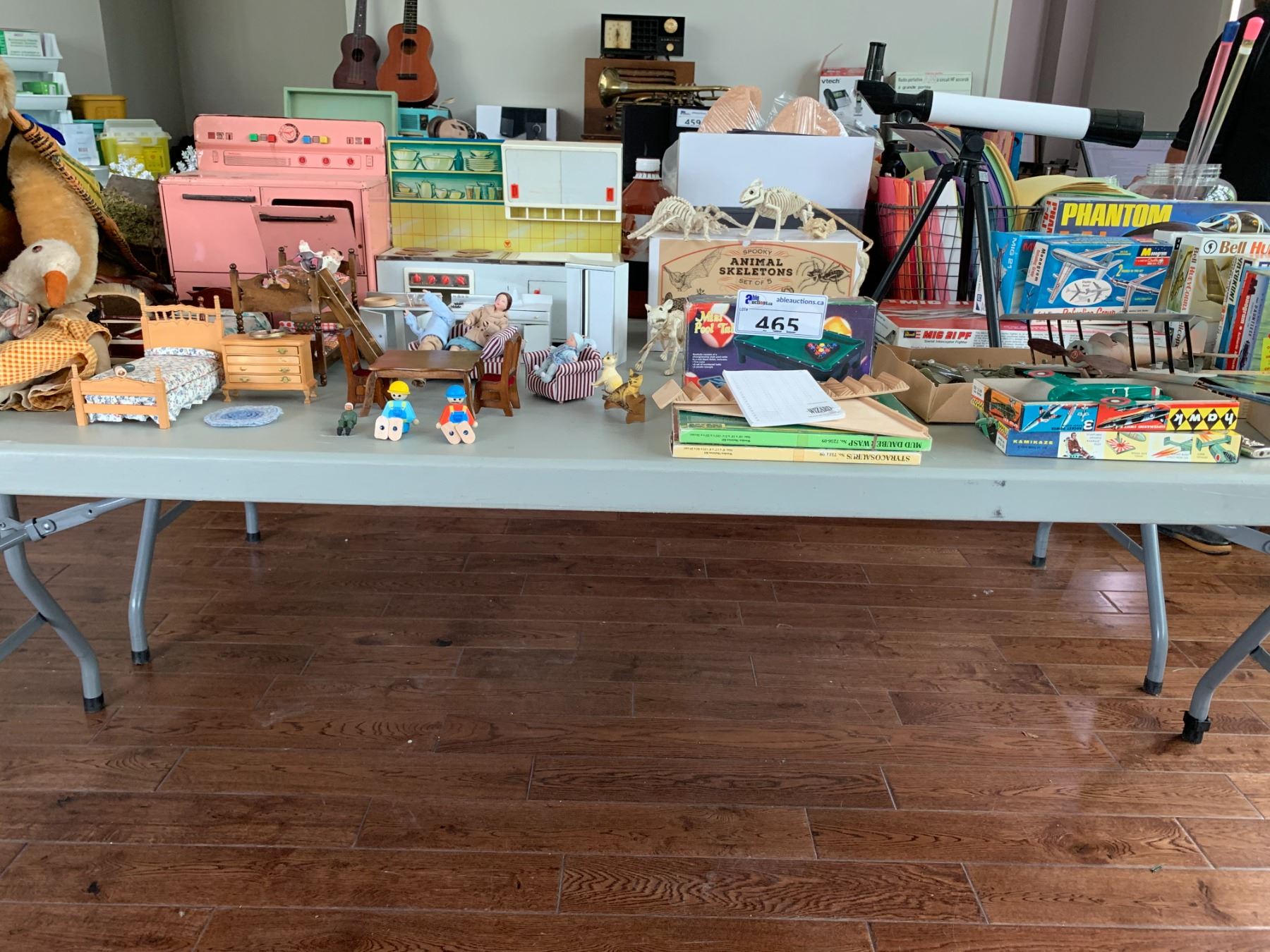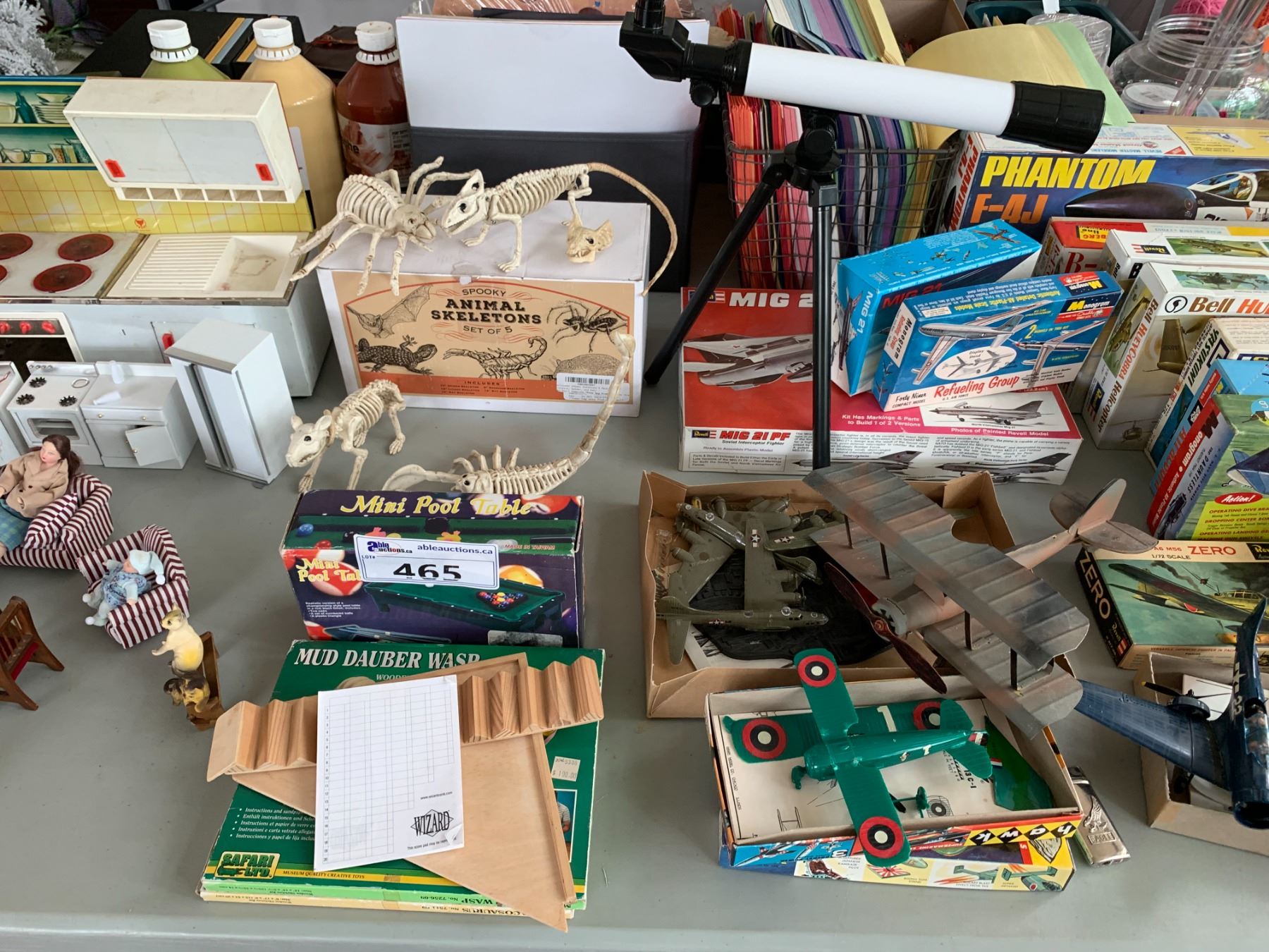 ASSORTED ITEMS INCLUDING; MODEL PLANES, DOLL HOUSE MINIATURES, STUFFED BEARS & MORE (TABLE NOT INCLUDED)
