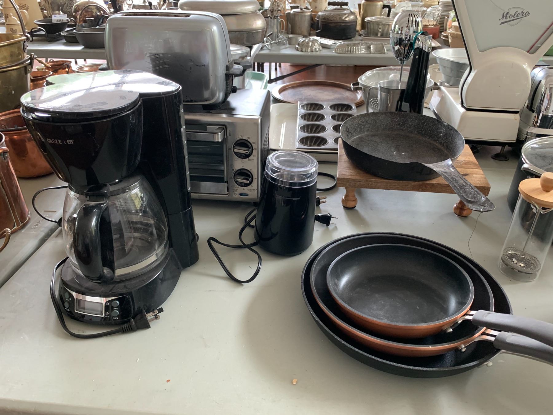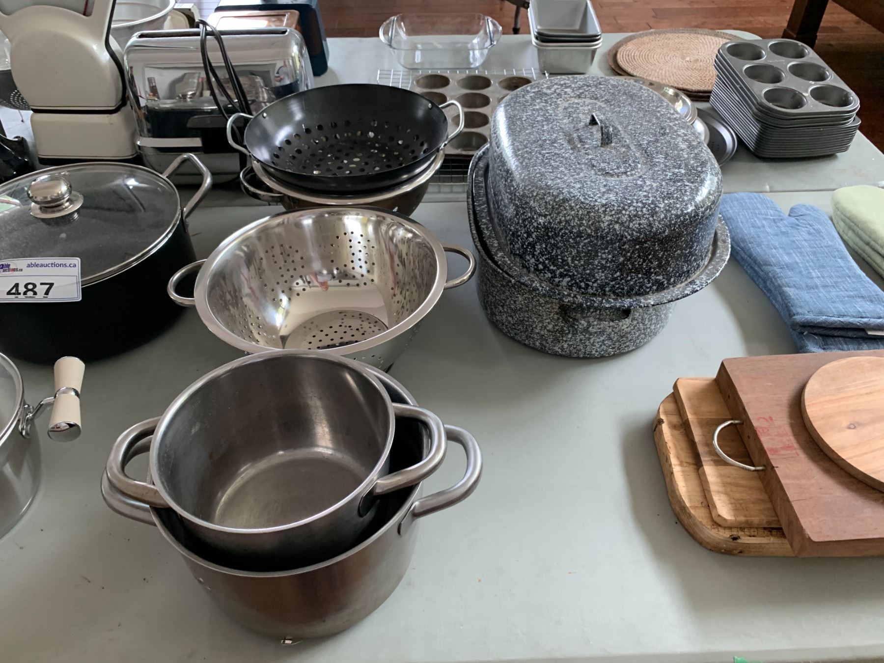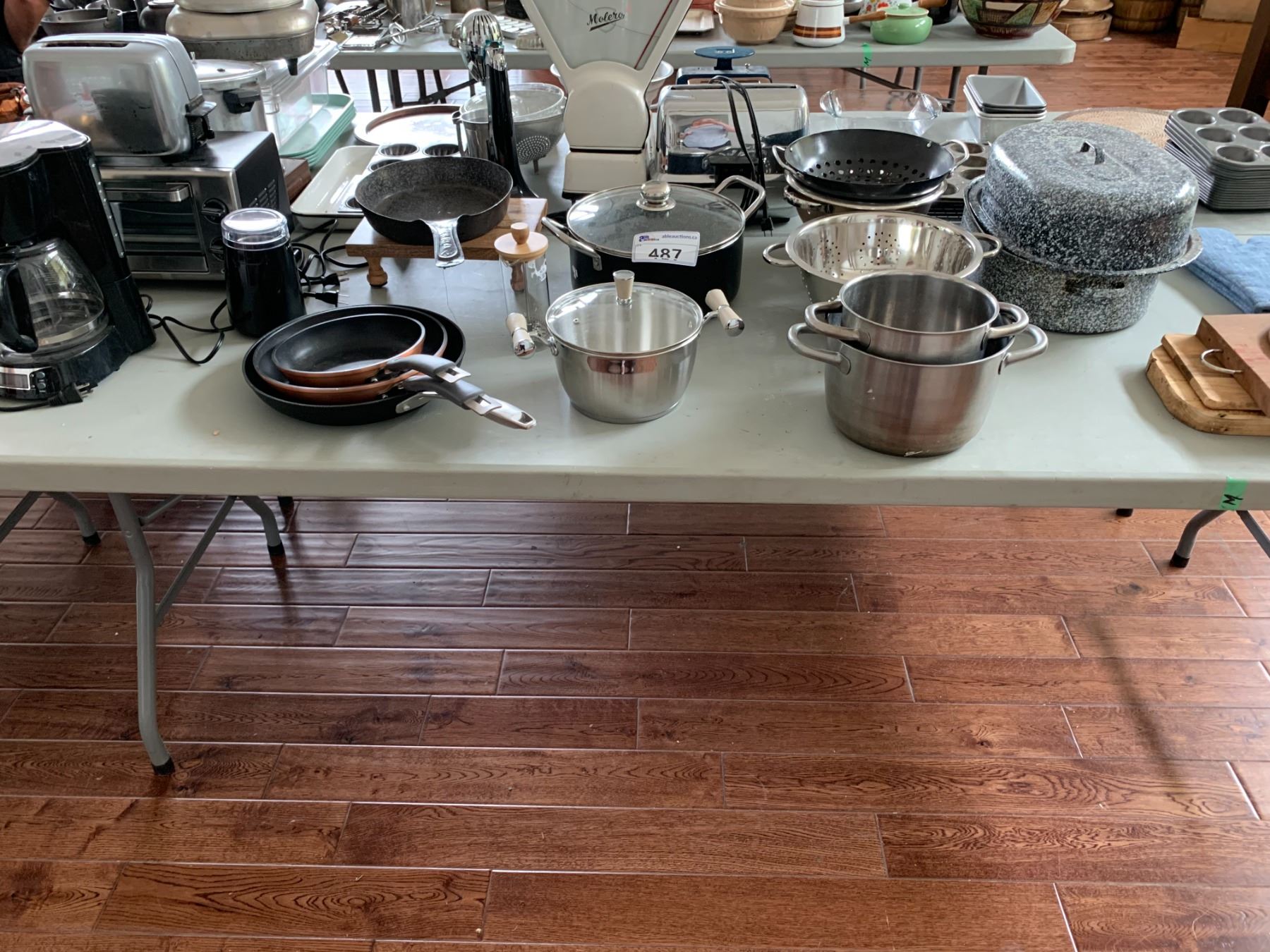 ASSORTED ITEMS INCLUDING; POTS & PANS, COFFEE MAKER, TOASTER OVEN, CUTTING BOARDS & MORE (TABLE NOT INCLUDED)