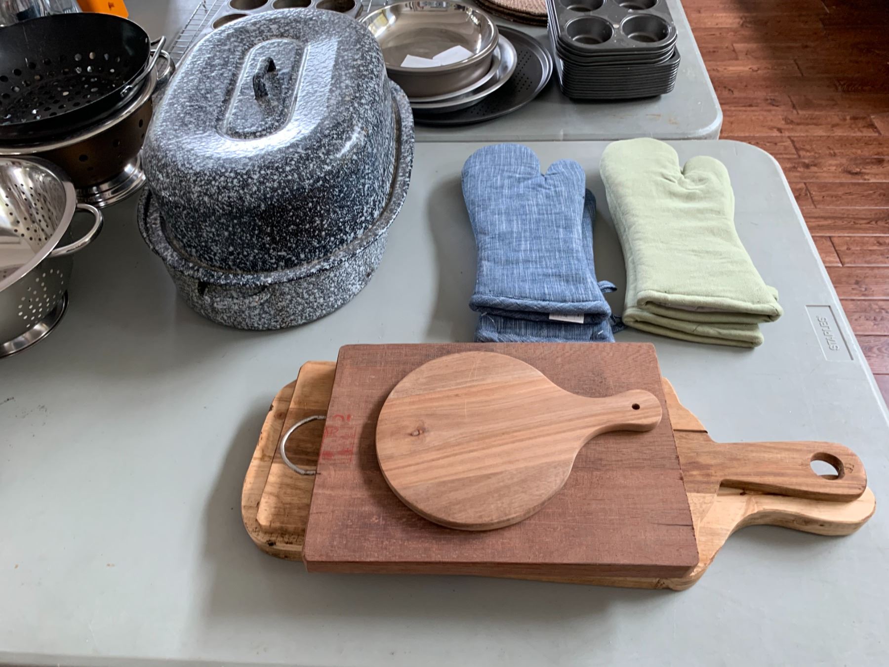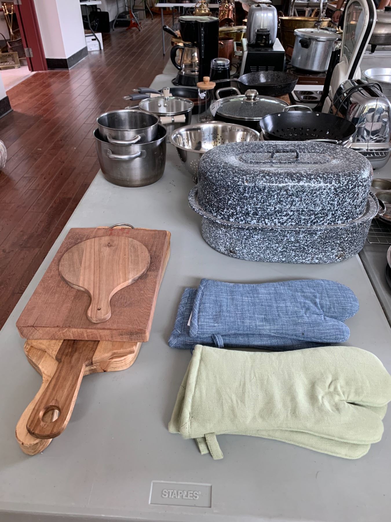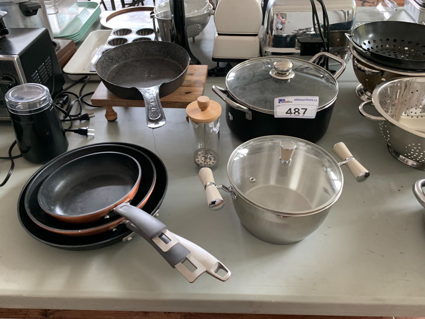 ASSORTED ITEMS INCLUDING; POTS & PANS, COFFEE MAKER, TOASTER OVEN, CUTTING BOARDS & MORE (TABLE NOT INCLUDED)